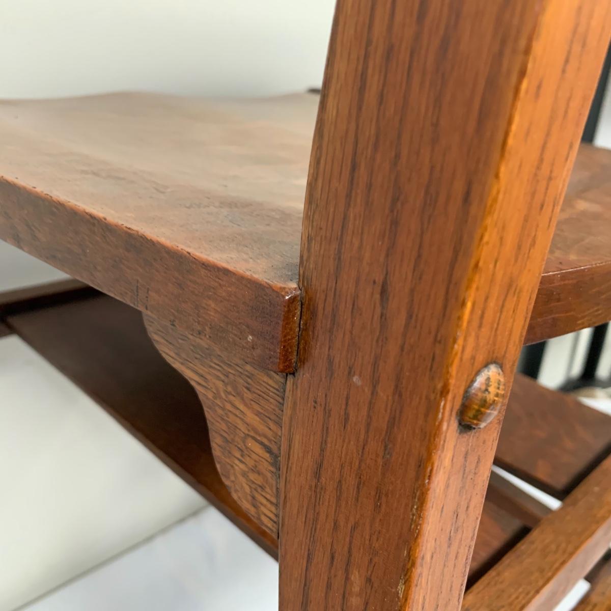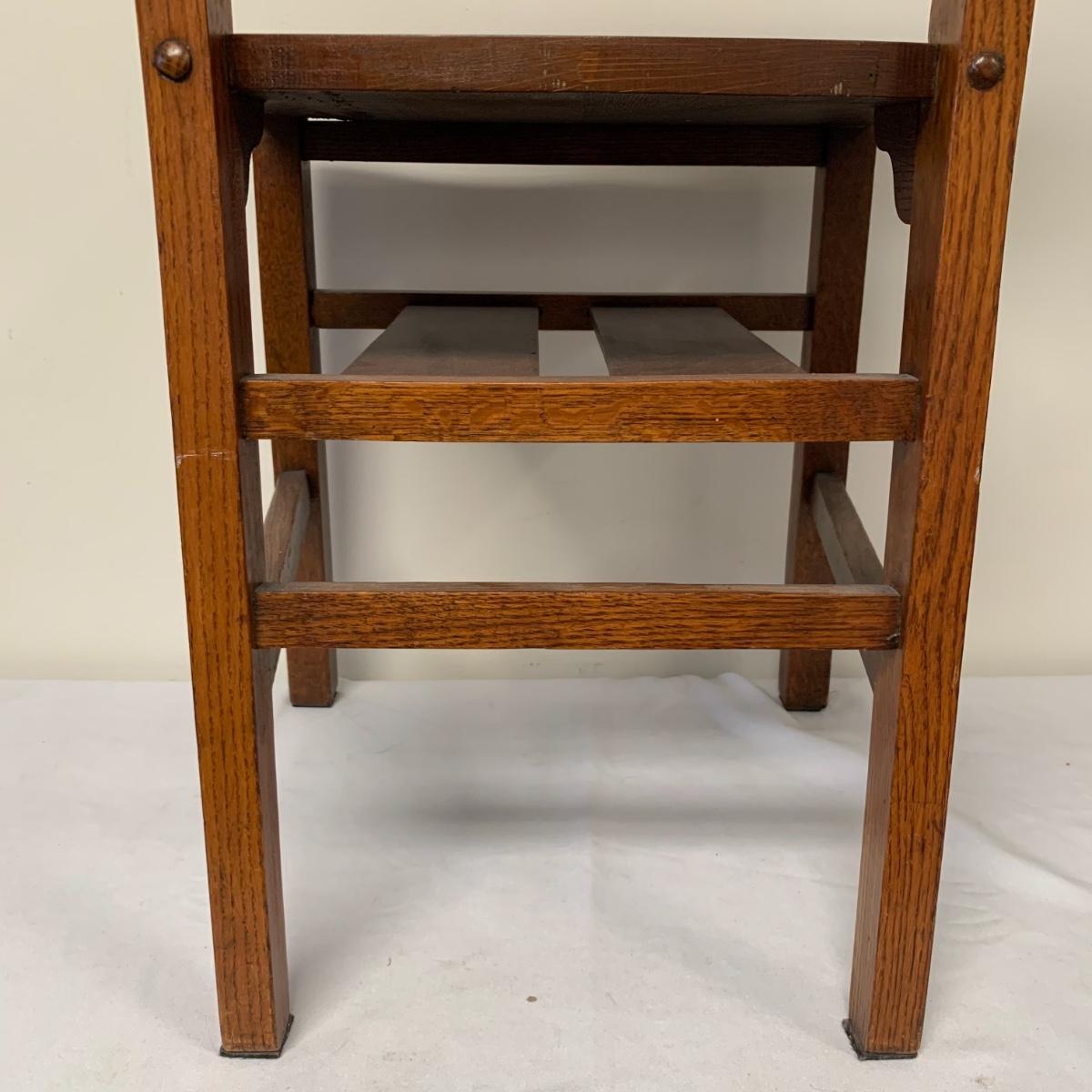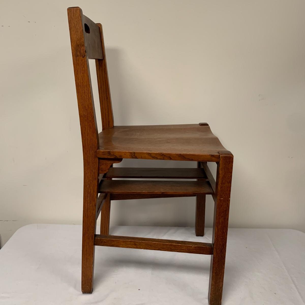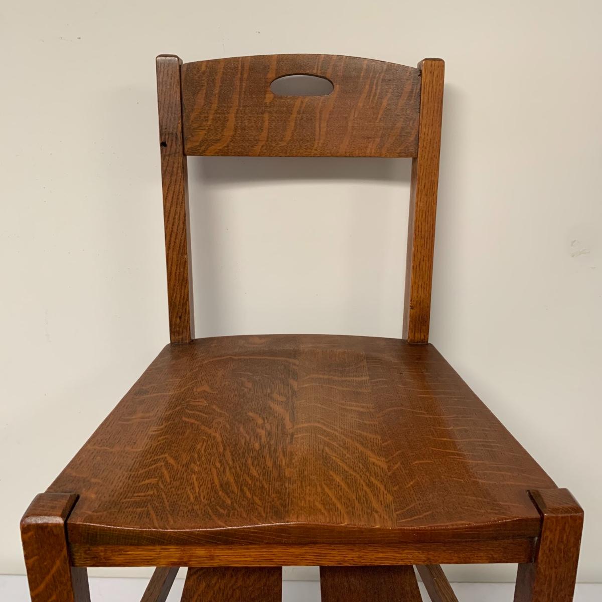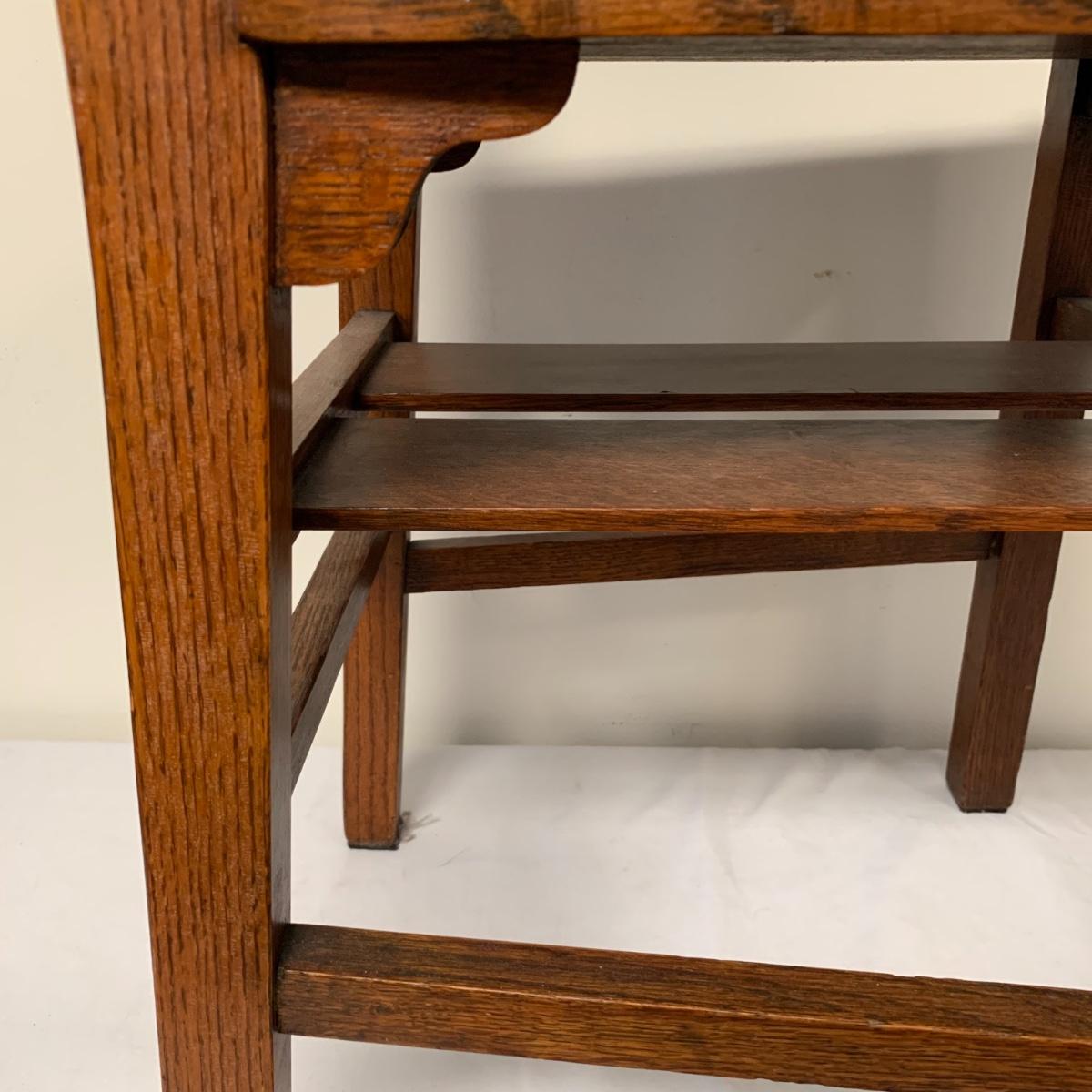 This lot includes one darker wood quarter sawn chair. The chair is made of a thicker wood and has a small shelf under the seat. The chair measures about 16" x 17" x 31". Shipping not available.