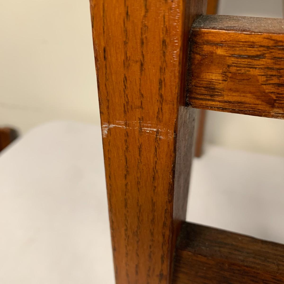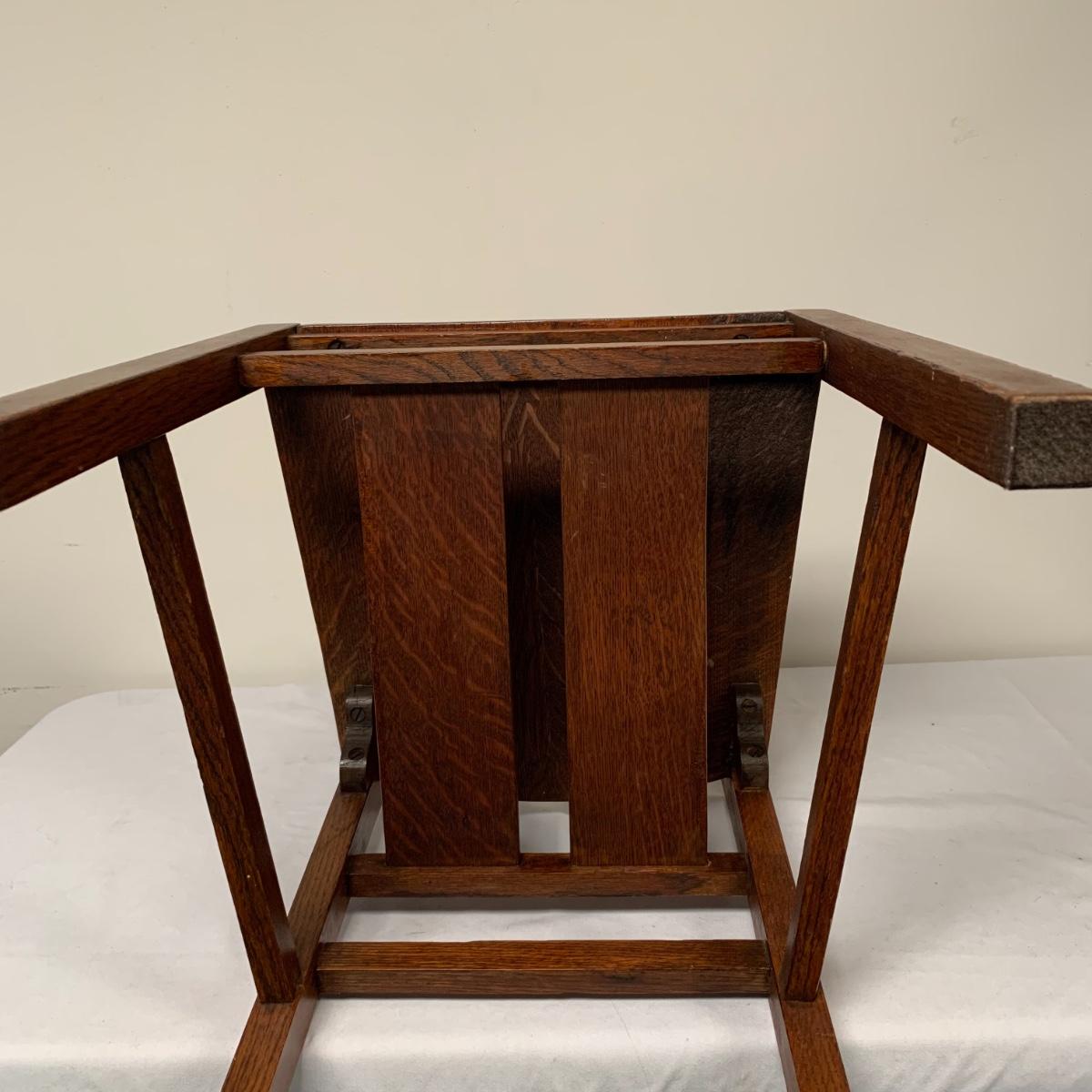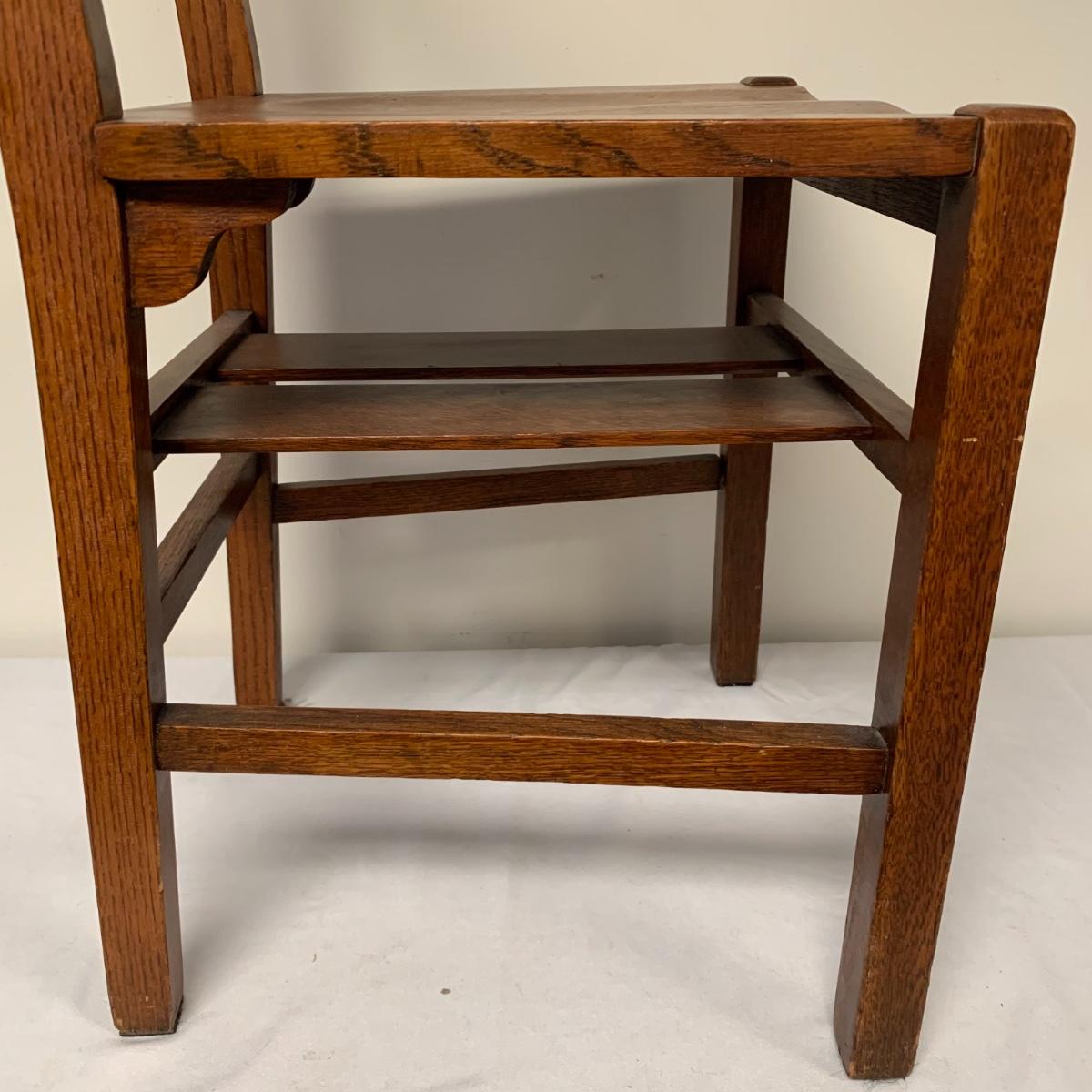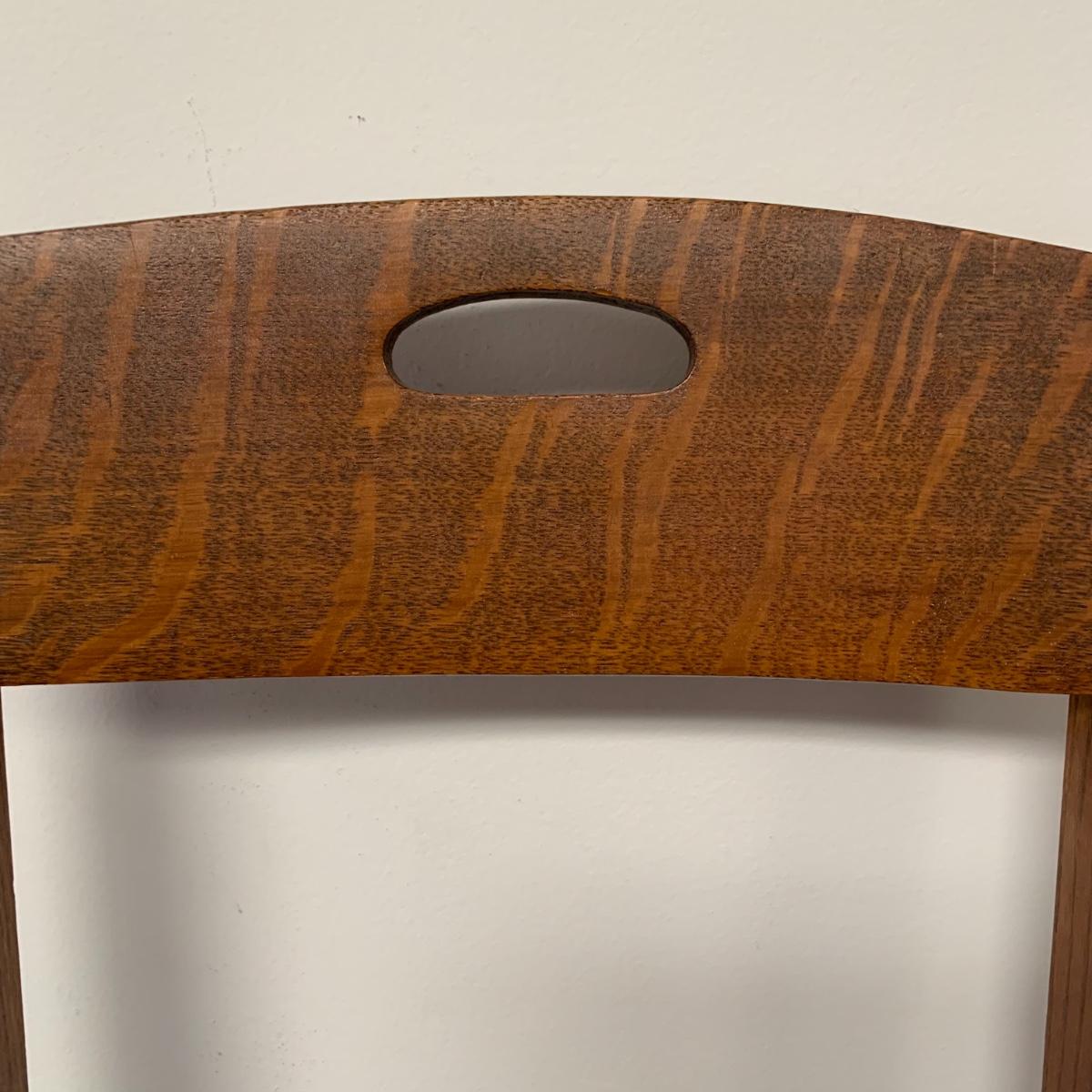 This lot includes one darker wood quarter sawn chair. The chair is made of a thicker wood and has a small shelf under the seat. The chair measures about 16" x 17" x 31". Shipping not available.
