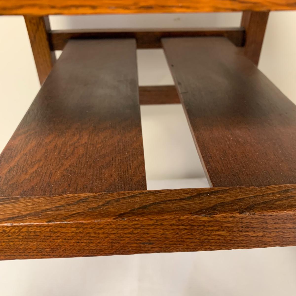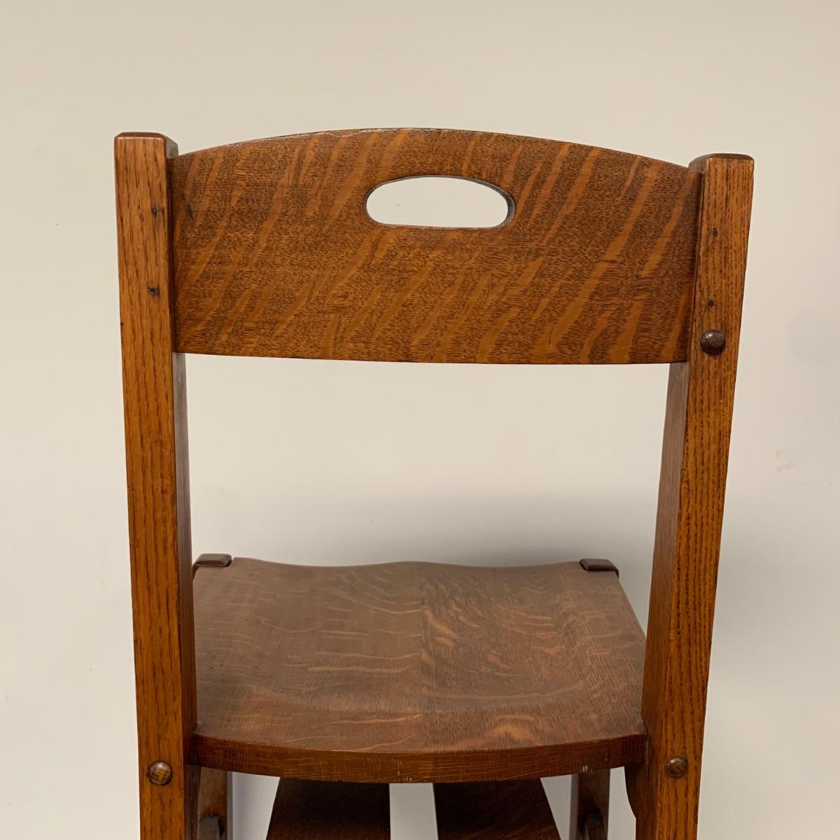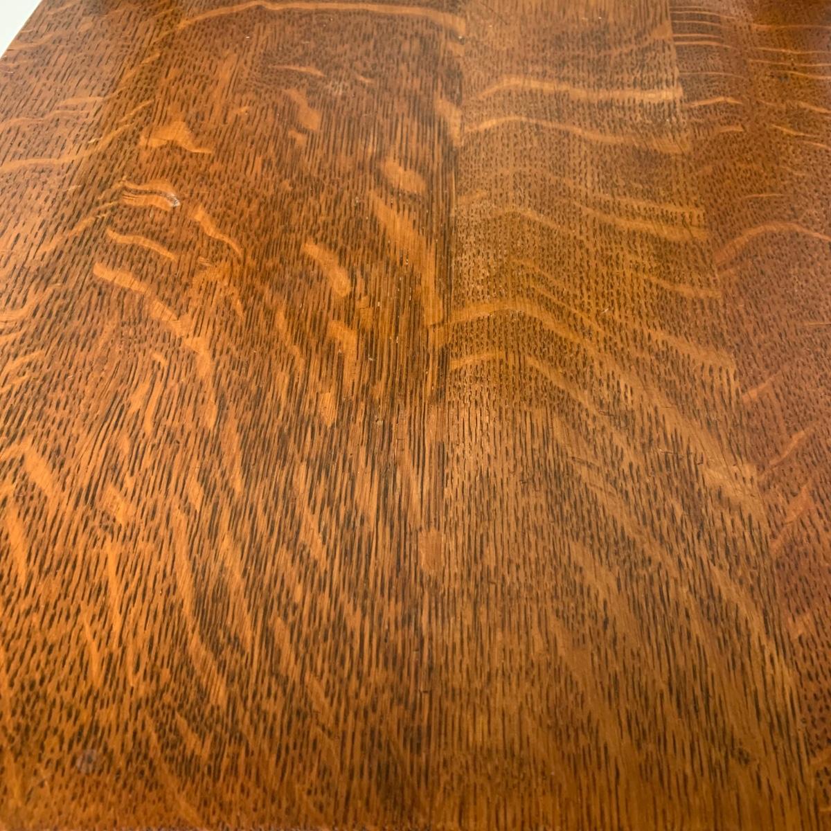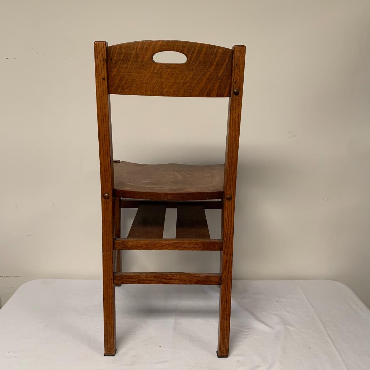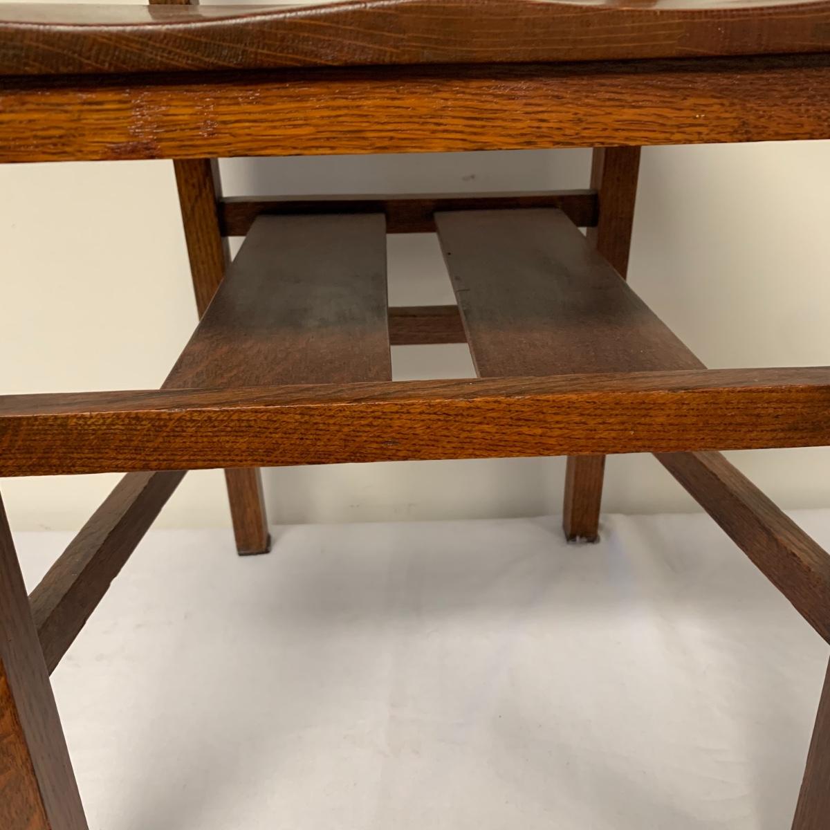 This lot includes one darker wood quarter sawn chair. The chair is made of a thicker wood and has a small shelf under the seat. The chair measures about 16" x 17" x 31". Shipping not available.