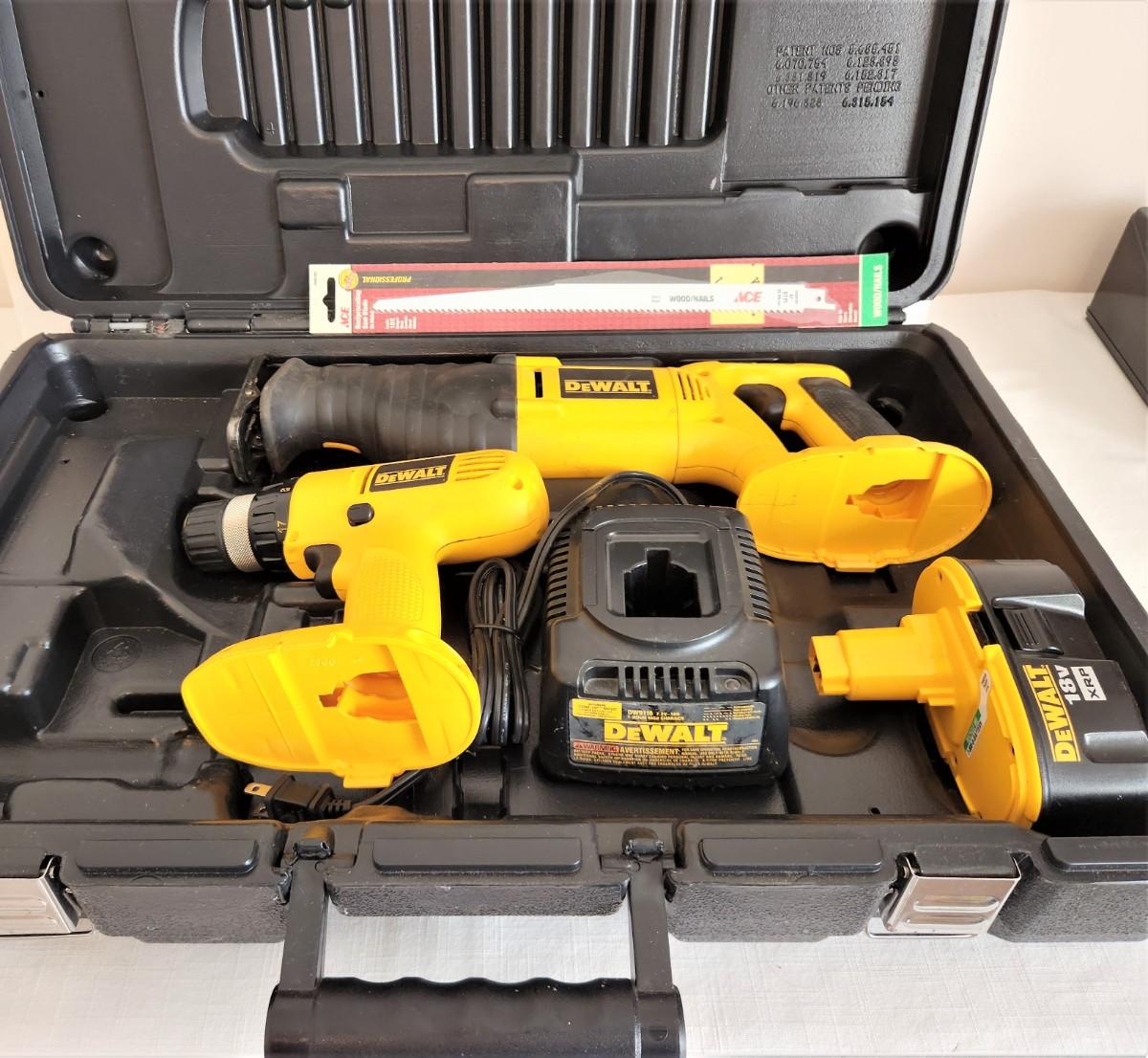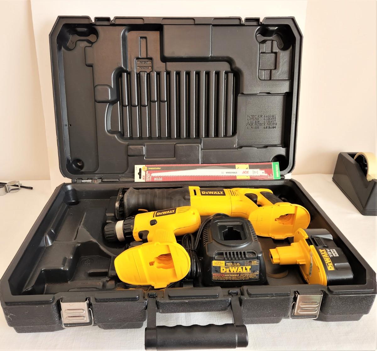 DeWalt Cordless DW929 Adjustable Clutch Driver Drill and a DeWalt 938 H.D. Cordless Repeating saw/charger in case. Good working condition. You get all you see here.