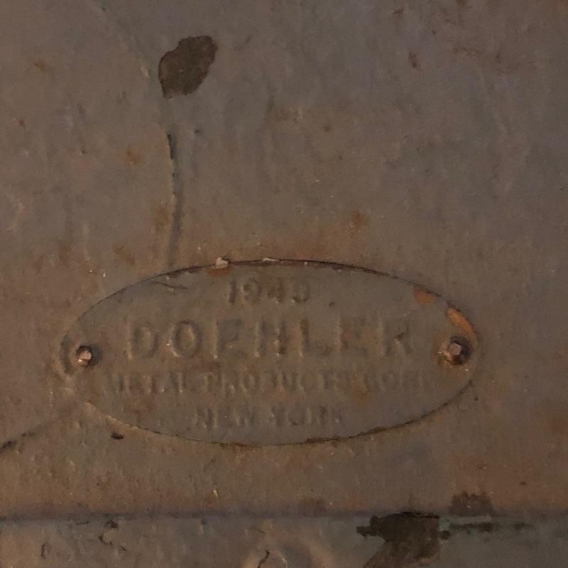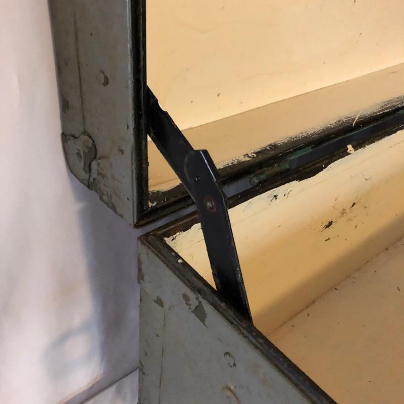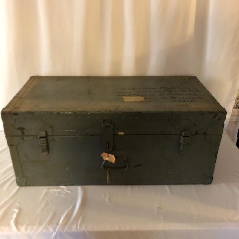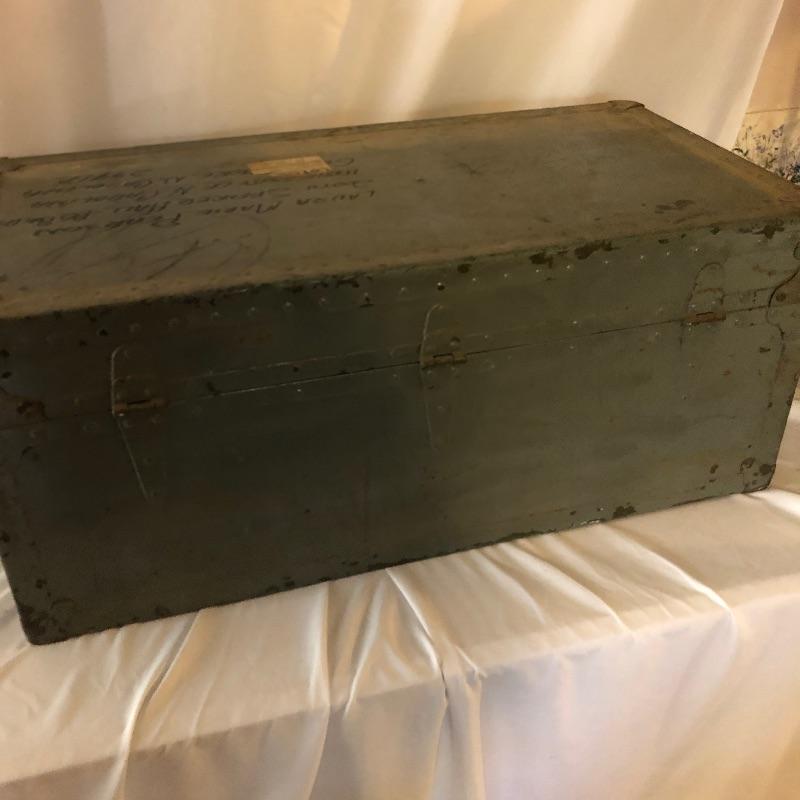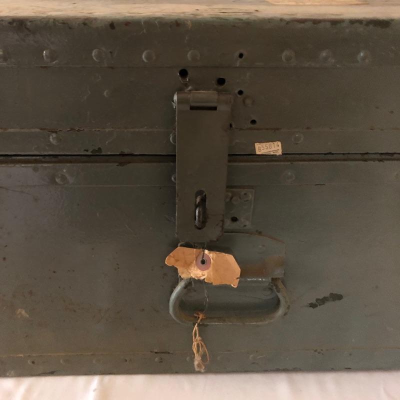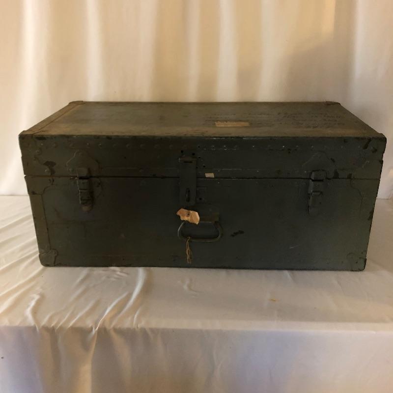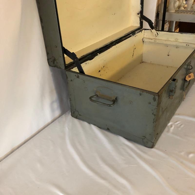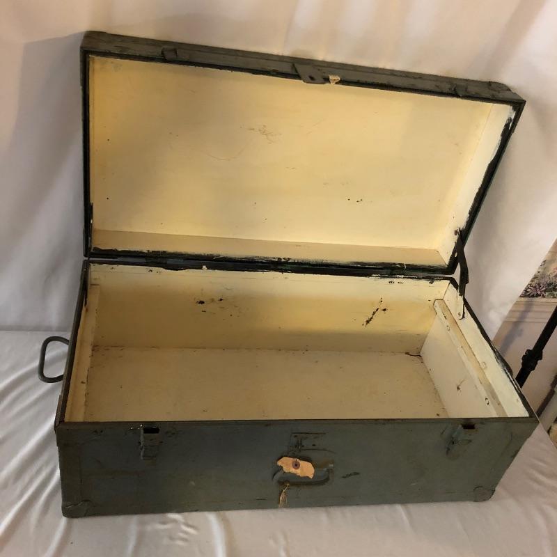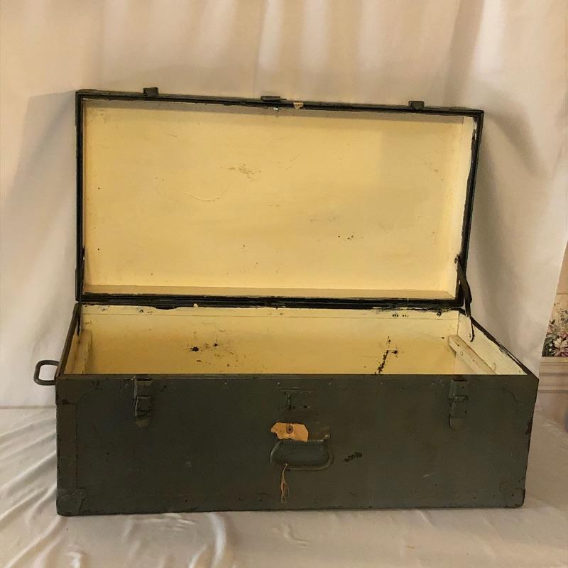 This green metal vintage trunk is in great aged condition and will make a great focal piece. The interior is painted white and the top has the address of its original owner and the Doehler stamp with the year 1949.. The clasps close but do not fully latch. Typical and desirable signs of age are throughout, such as chipped paint and minor rust that give this vintage trunk even more appeal.
