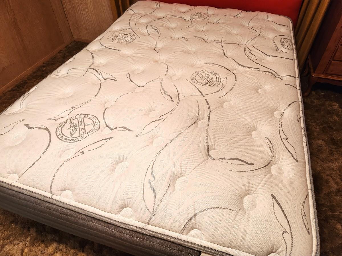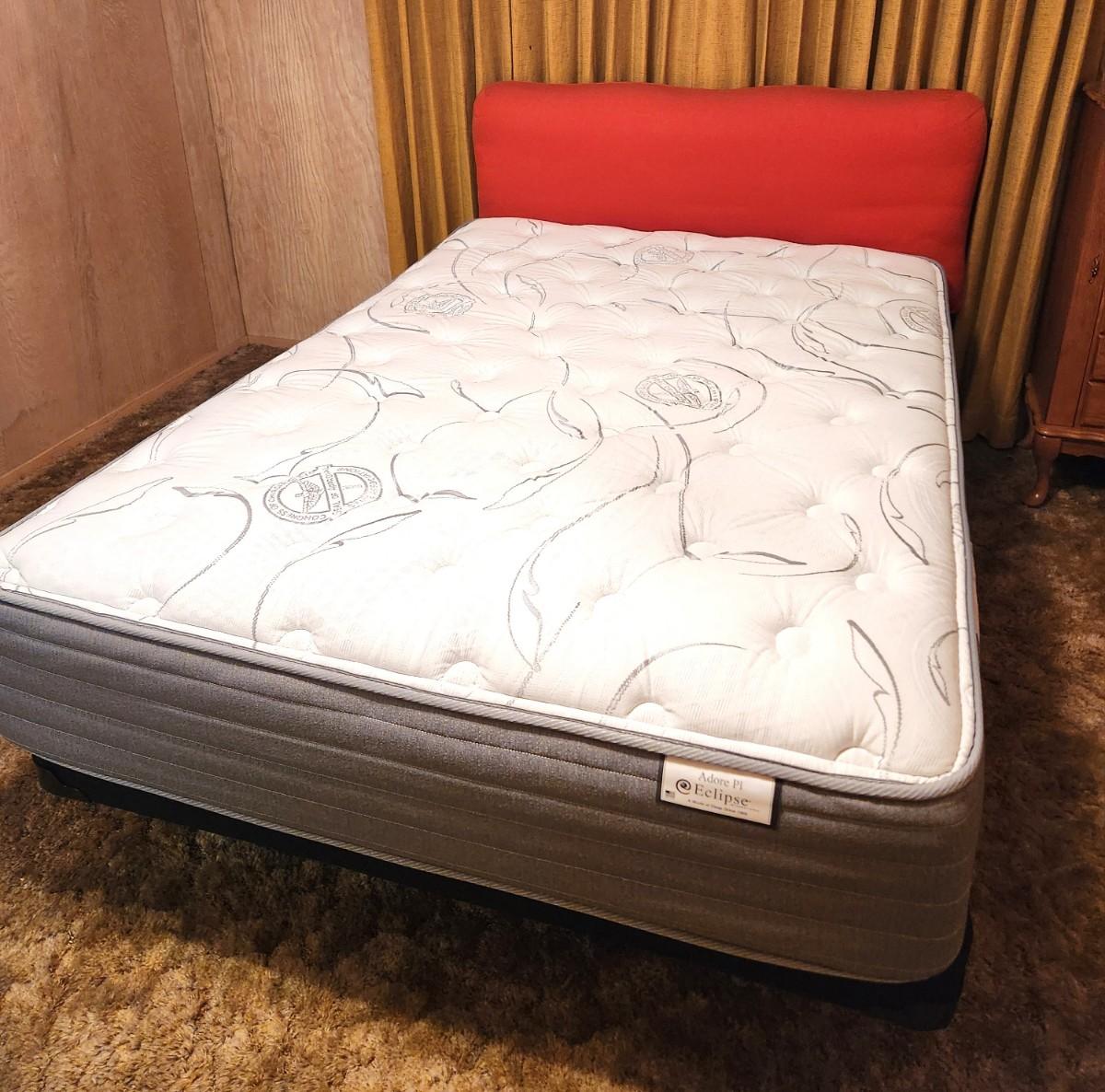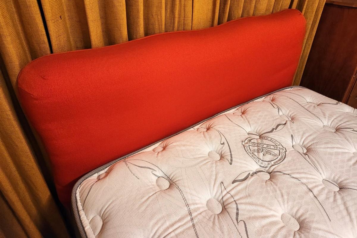 This MCM Full/double bed has a like new Adore Eclipse mattress (3 years old) and low profile box spring. Very comfortable. Headboard is in the iconic burnt orange color of the era - measures 39" tall, 53" across. Mattress is 50" across, 73" long. If you just want the mattress you don't have to take the headboard/frame.