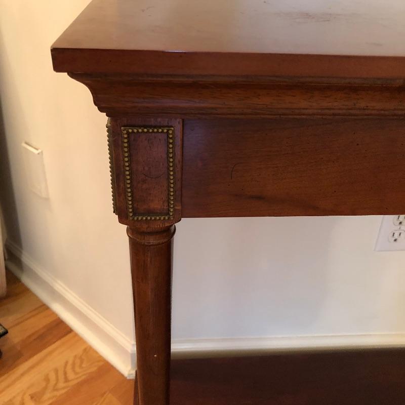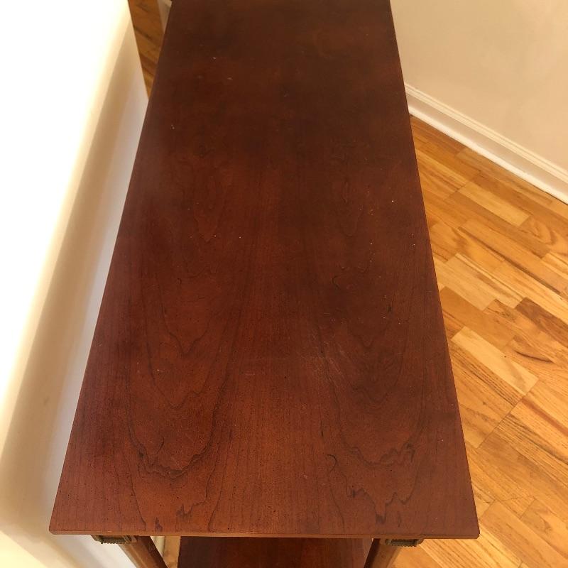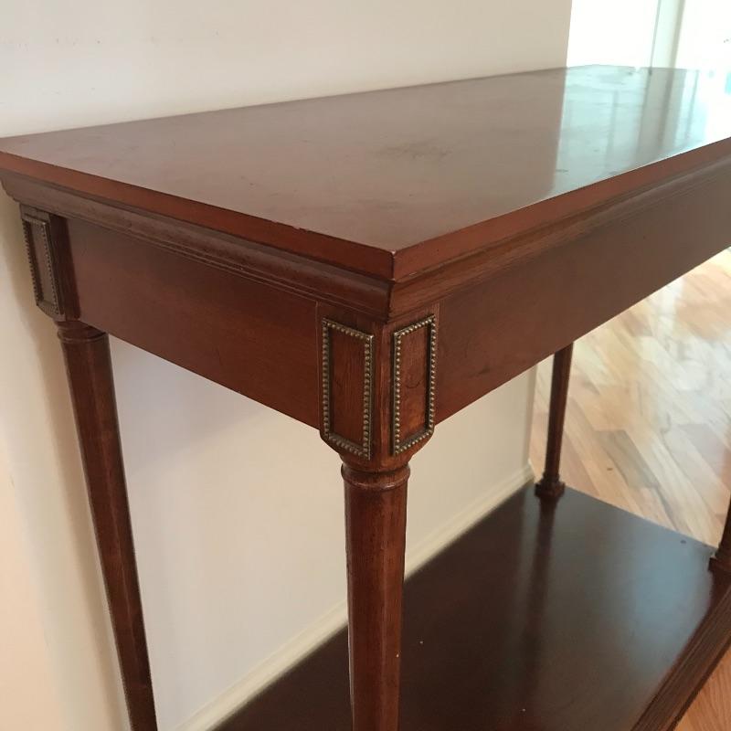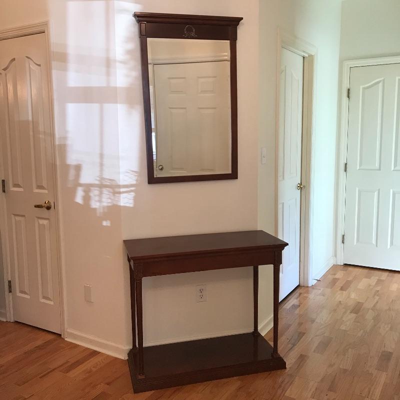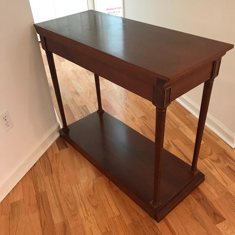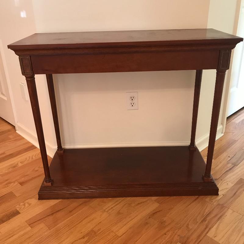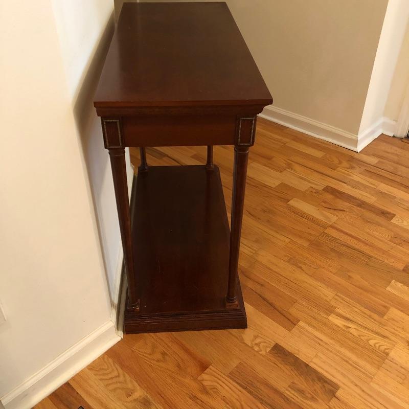 Perfect duo for your entryway, this matching Bombay Co table and mirror are a reddish brown solid wood. The mirror has beveled glass and metal accent pieces at the top that match the ones on the accompanying table. The table has a lower shelf and measures 15” x 36” x 30”. Mirror has one small blemish that is shown in the last image, it’s hard to see and is marked with a pen.