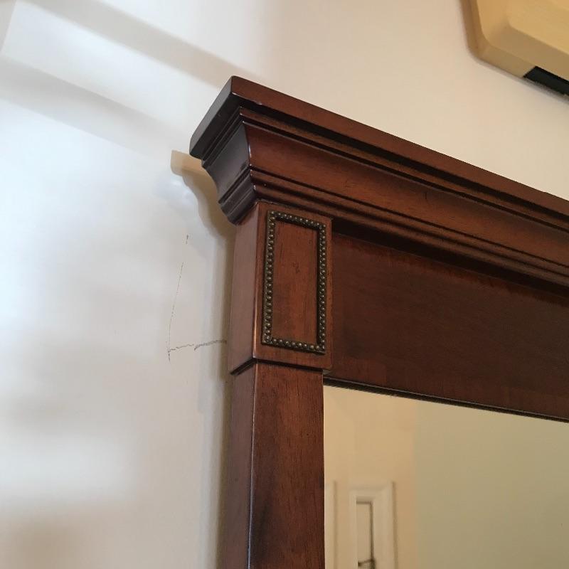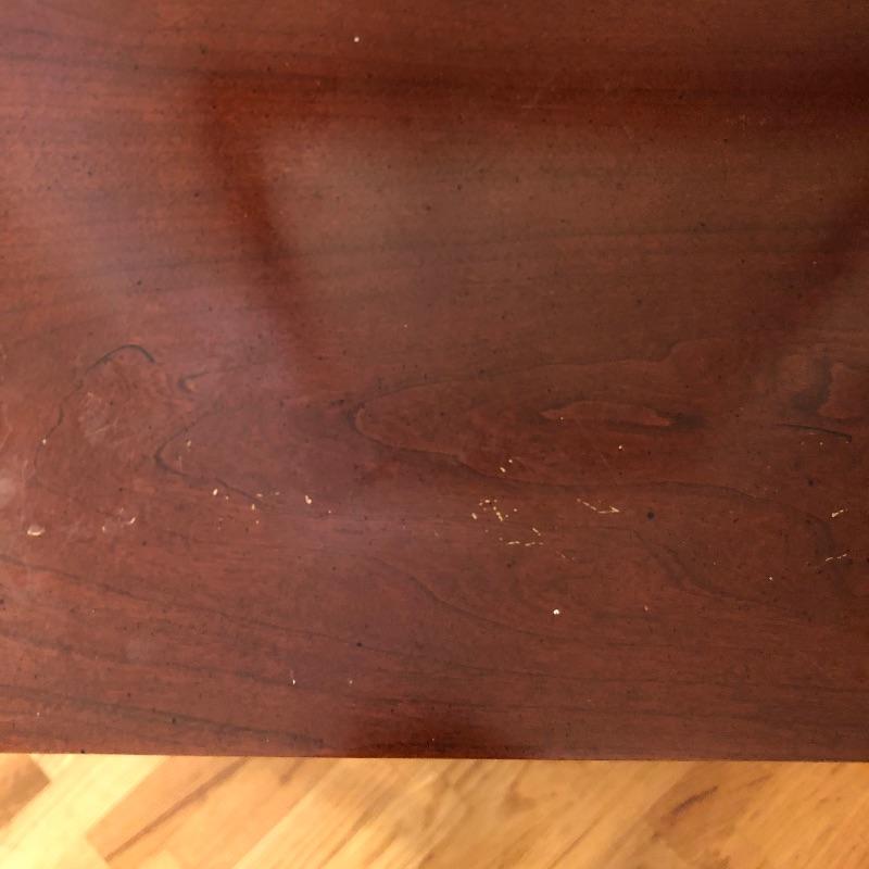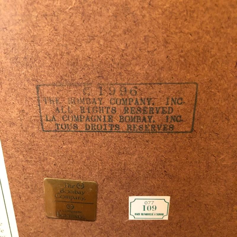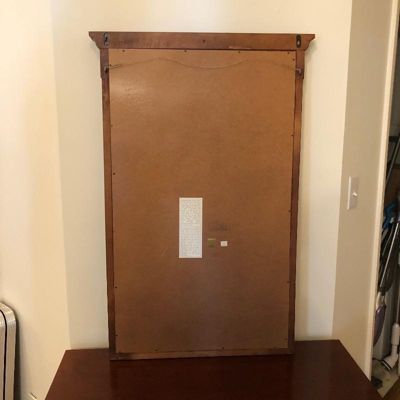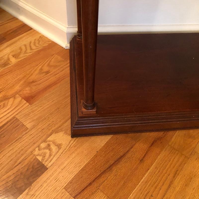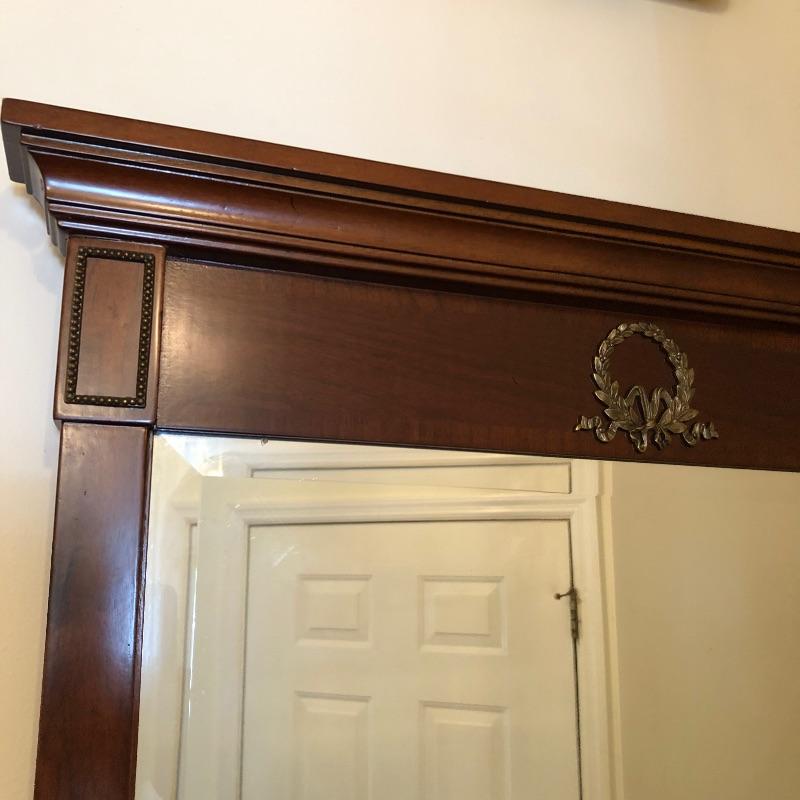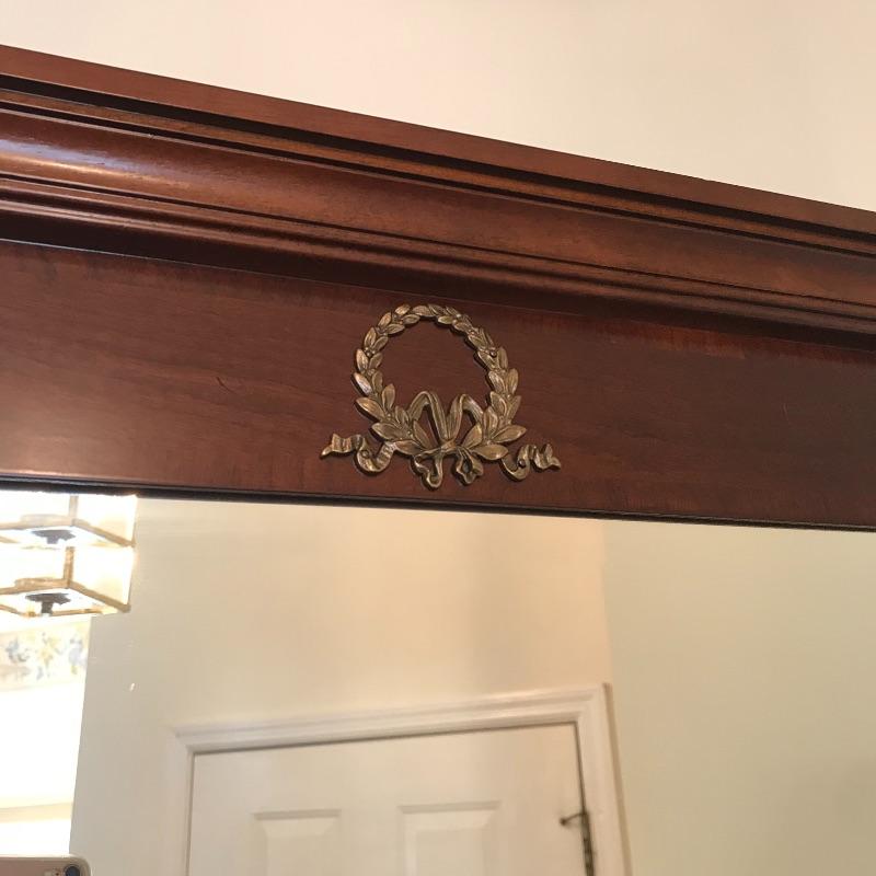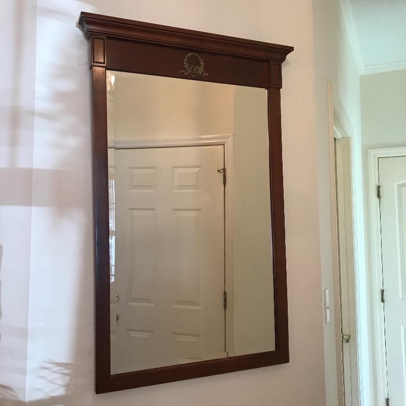 Perfect duo for your entryway, this matching Bombay Co table and mirror are a reddish brown solid wood. The mirror has beveled glass and metal accent pieces at the top that match the ones on the accompanying table. The table has a lower shelf and measures 15” x 36” x 30”. Mirror has one small blemish that is shown in the last image, it’s hard to see and is marked with a pen.