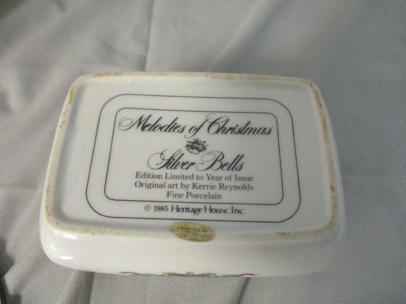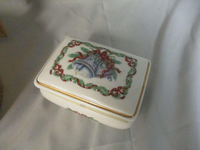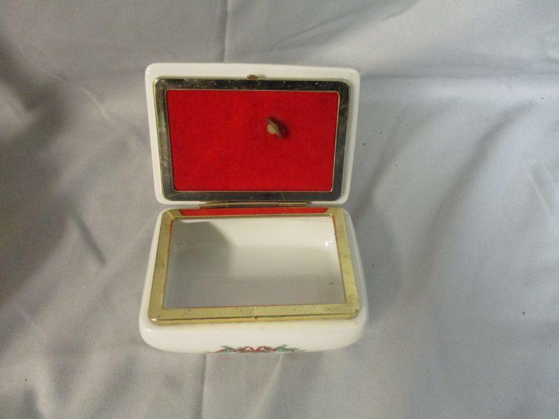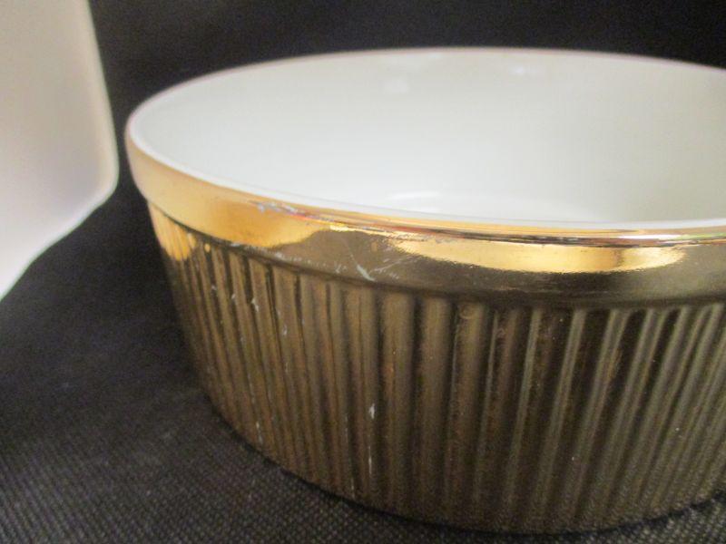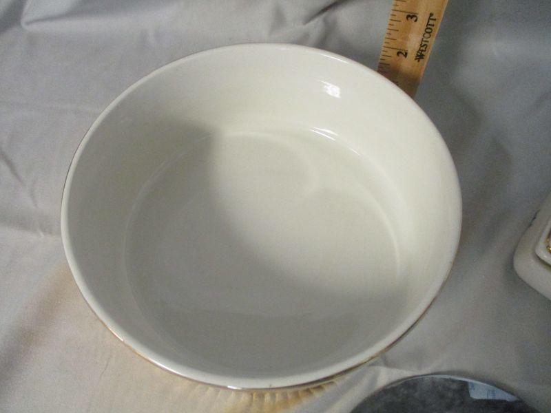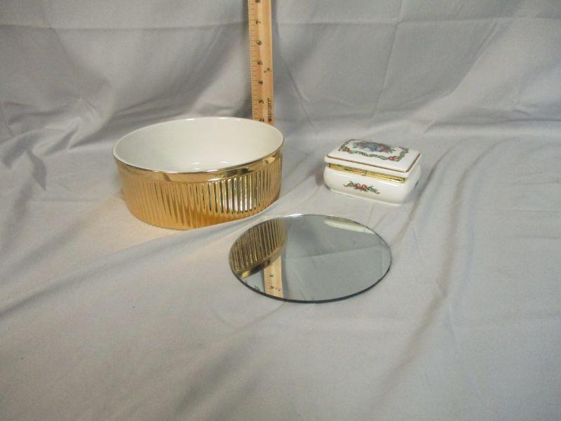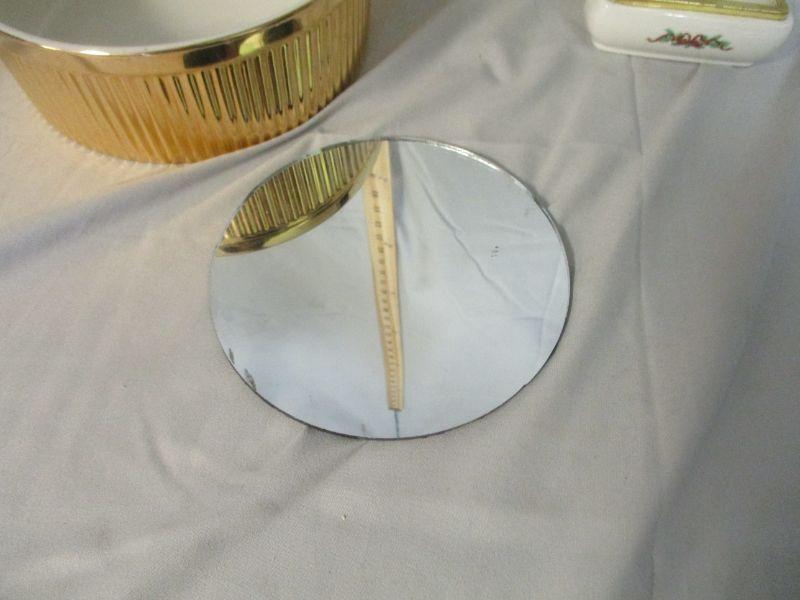The souffle casserole dish by Hall China is in very good condition. There is only spot of issue with the gold paint and it is minor. It is 7.5" in diameter and 2.75" in height. The music box plays when wound up and then stops when the lid is closed. It is also in great condition. The mirror reflects your image when you look into it, then reflects other things when you move away (just being a smartie with that one). It is 6" in diameter and just needs cleaning.