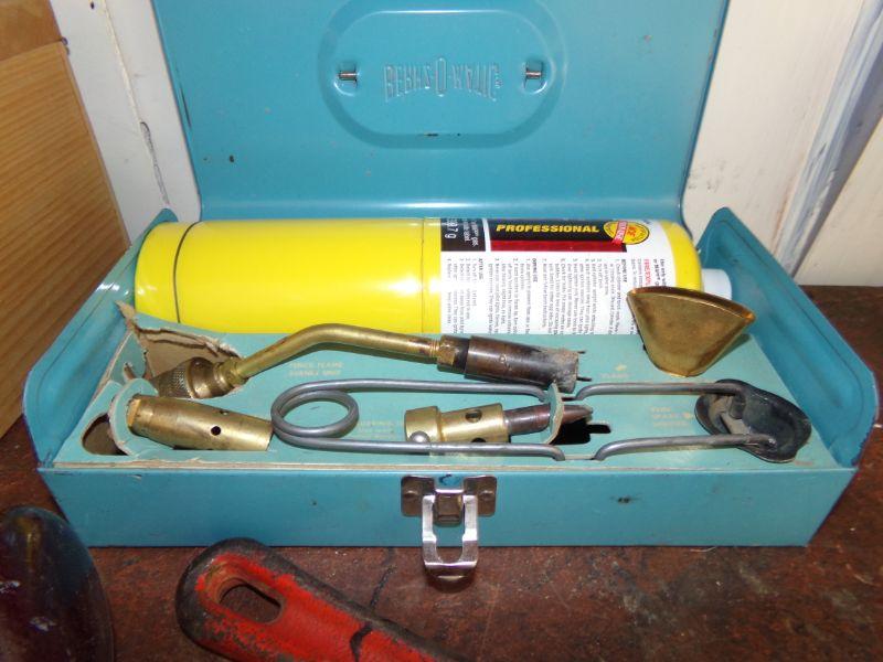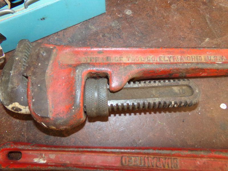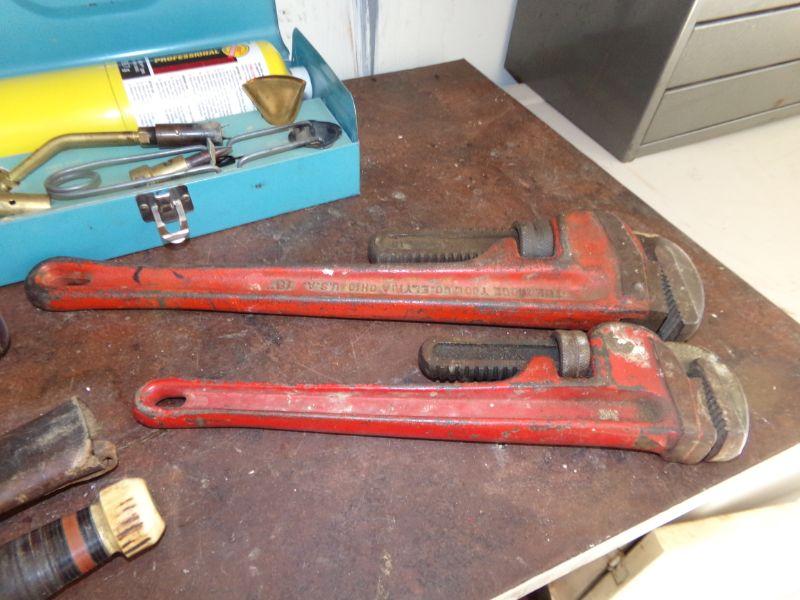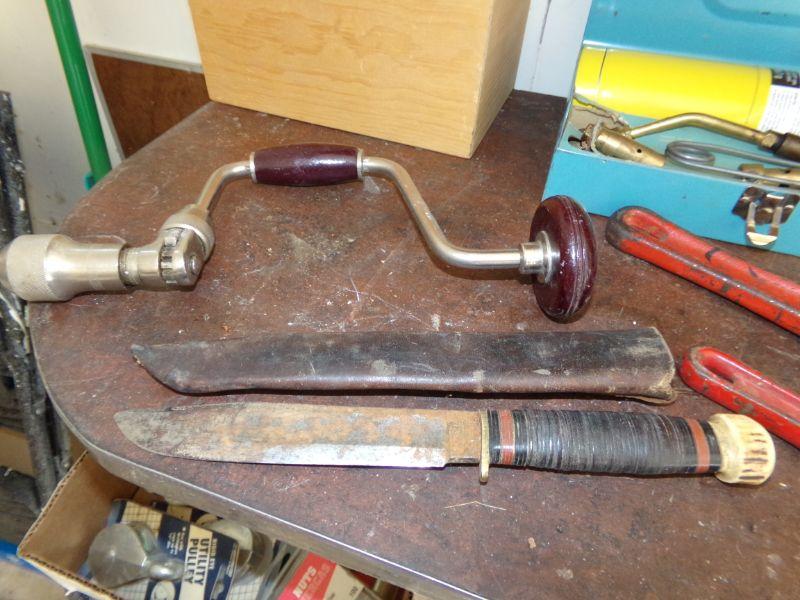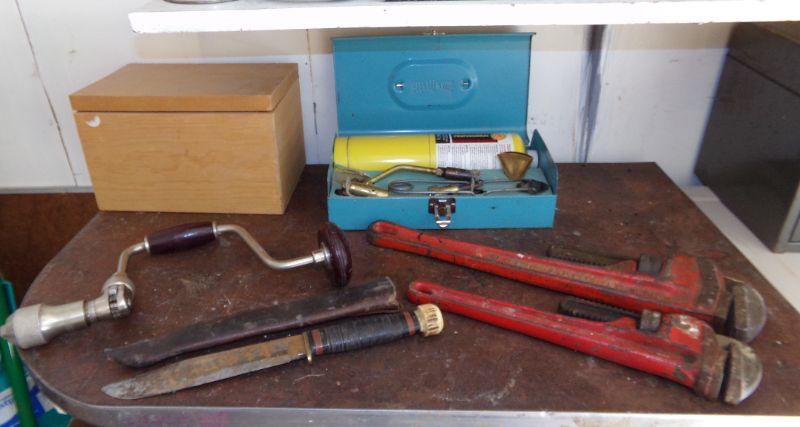 2 PIPE WRENCHES, SOLDERING KIT, HAND DRILL AND A FIXED BLADE KNIFE THAT'S A BIT RUSTY BUT I CAN MAKE OUT THE WORDS "CRANE CUTLERY"