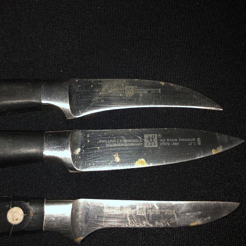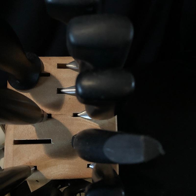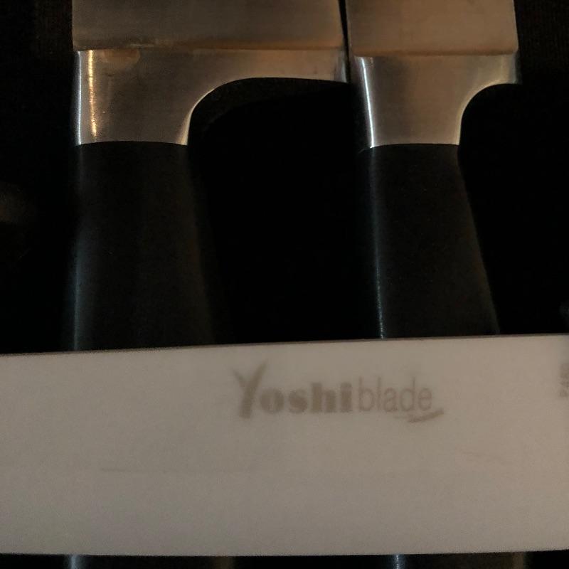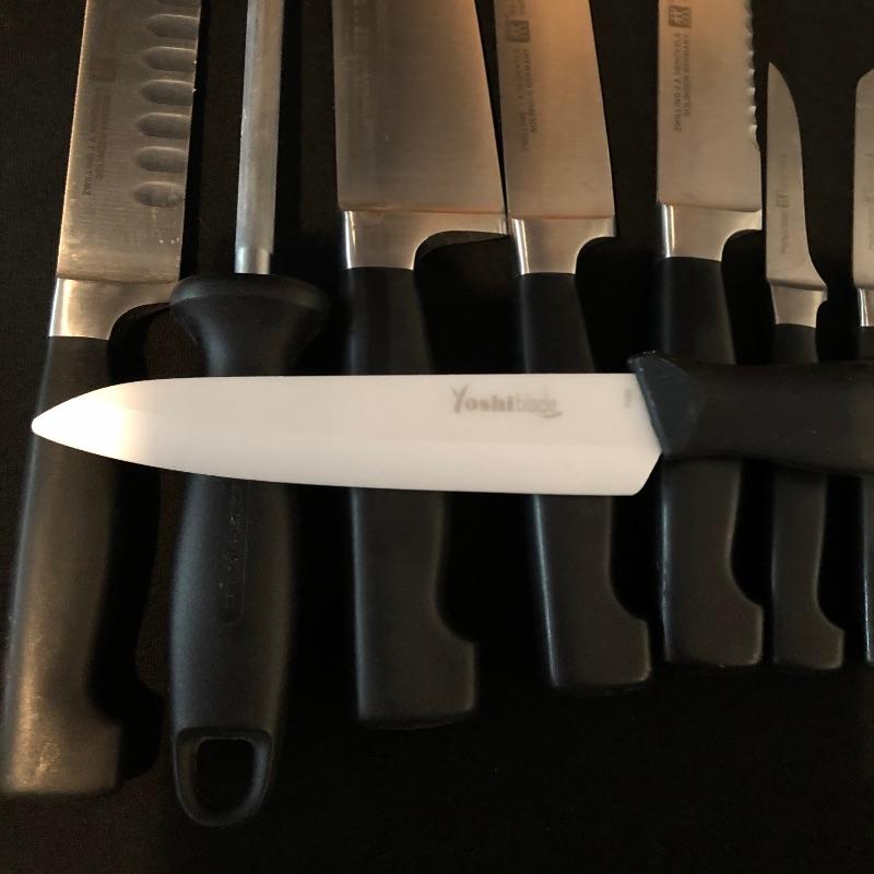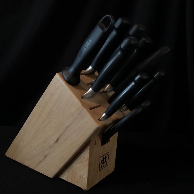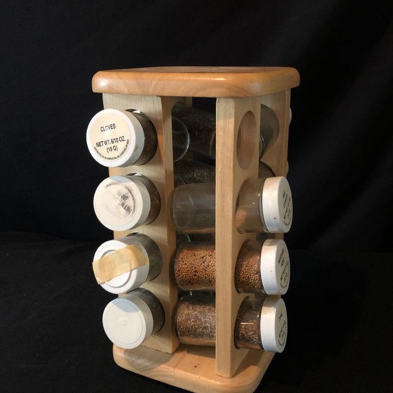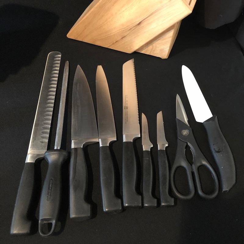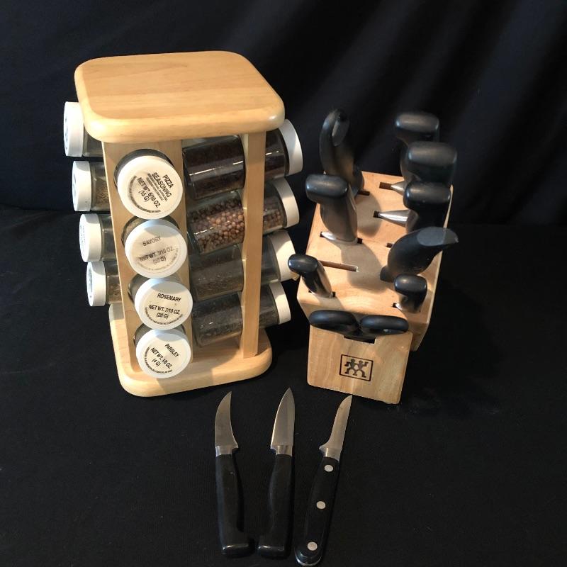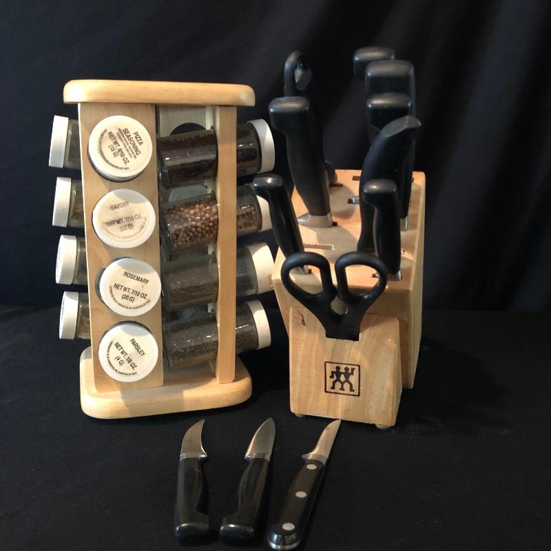 Henckel knives with block comes with kitchen shears, sharpening tool, and various sized knives, a yoshiblade. There is 1 knife missing from the block see photos. Spice rack has a swiveling base and holds 16 glass bottles for spices. There is one bottle missing from the set.