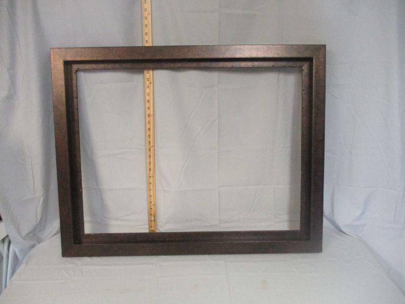 This is the type of frame that you attach your unframed art canvases to (see Lots 101, 102, 103) I'm not sure what it is made of, but I don't think that it's wood and I don't think that it's plastic, but it is nice and in excellent condition. It measures The outside dimensions are about 36" x 28.5" and 1.75" thick. The inside dimensions will hold a 32.5" x 24.5" canvas.