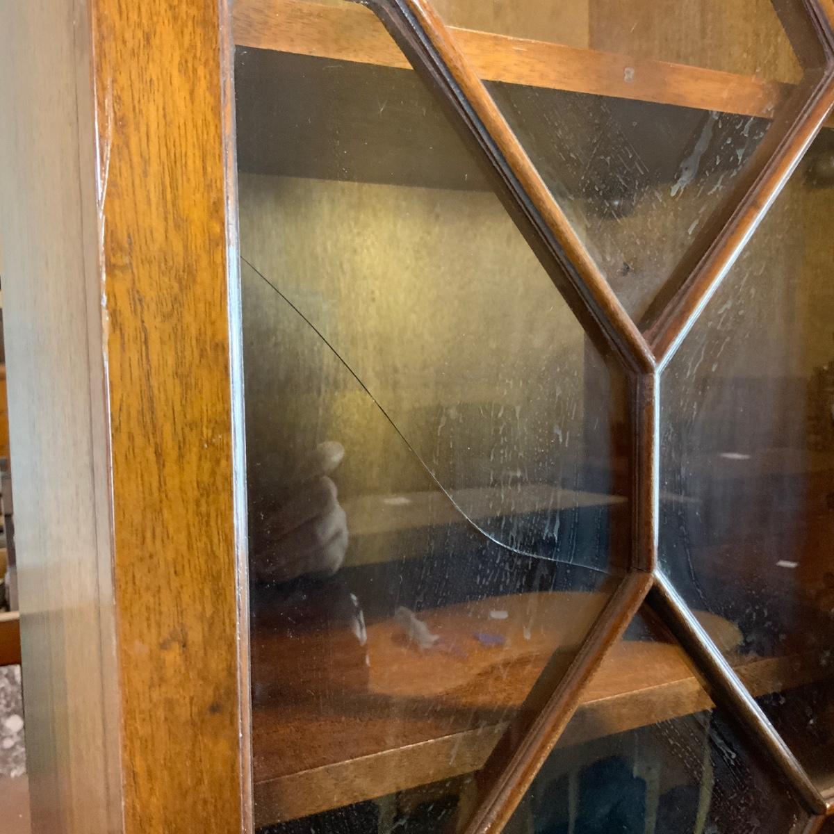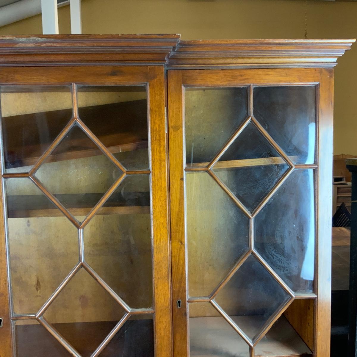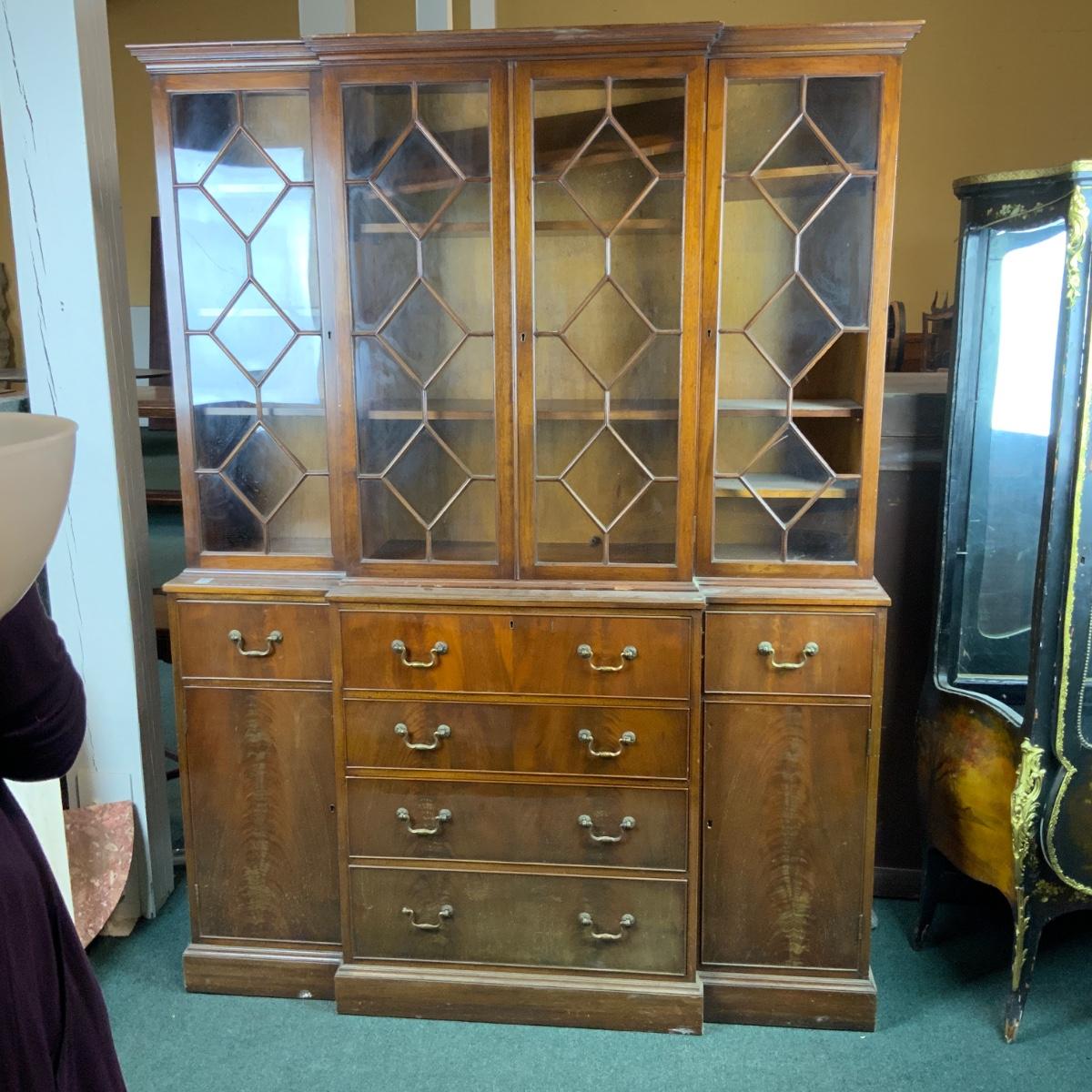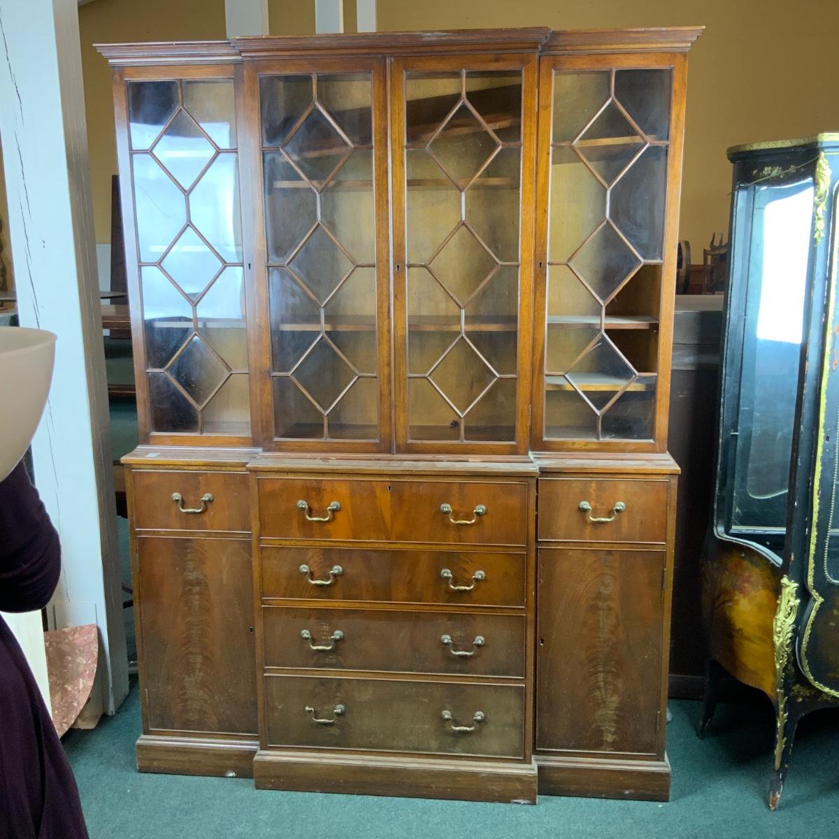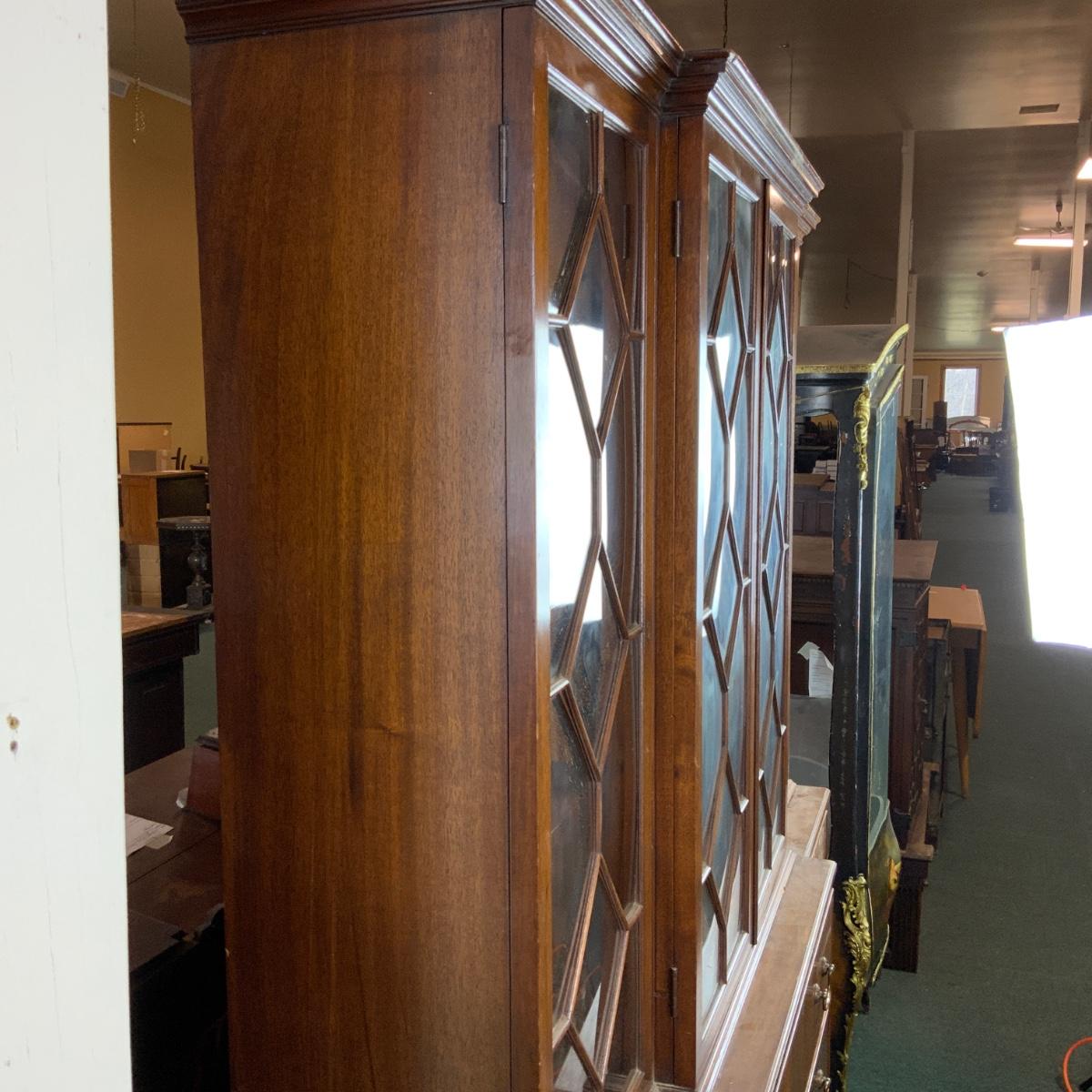 Large Lattice-Front Cabinet. Lovely solid piece. Glass needs to be replaced on the left. A real nice statement piece for your home. //::\\ Please see photos for details and condition. No attempt has been made to hide any imperfections. All items listed in this auction are warehouse items, and need to be cleaned. A majority of the items need restoration as well. All items are sold AS IS and WITHOUT GUARANTEE. If you are uncertain about an item, DO NOT BID. Due to the nature of this online auction in-person inspection is HIGHLY recommended. All Sales are FINAL. Pick Up Times are FIRM. Please confirm with your own schedule that you can pick up in the scheduled times listed in the Terms and Conditions. Any questions please message the auctioneer. DO NOT Contact The Harp Gallery.