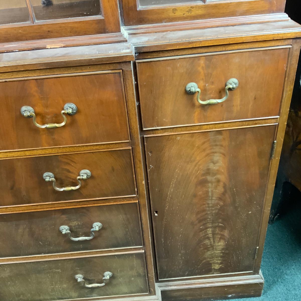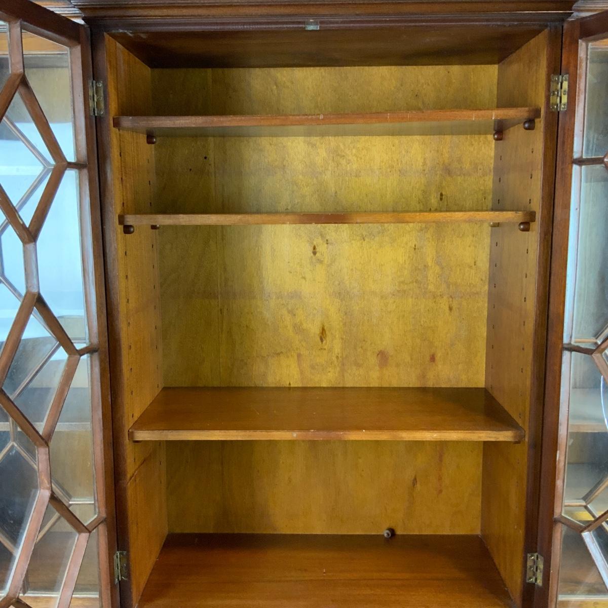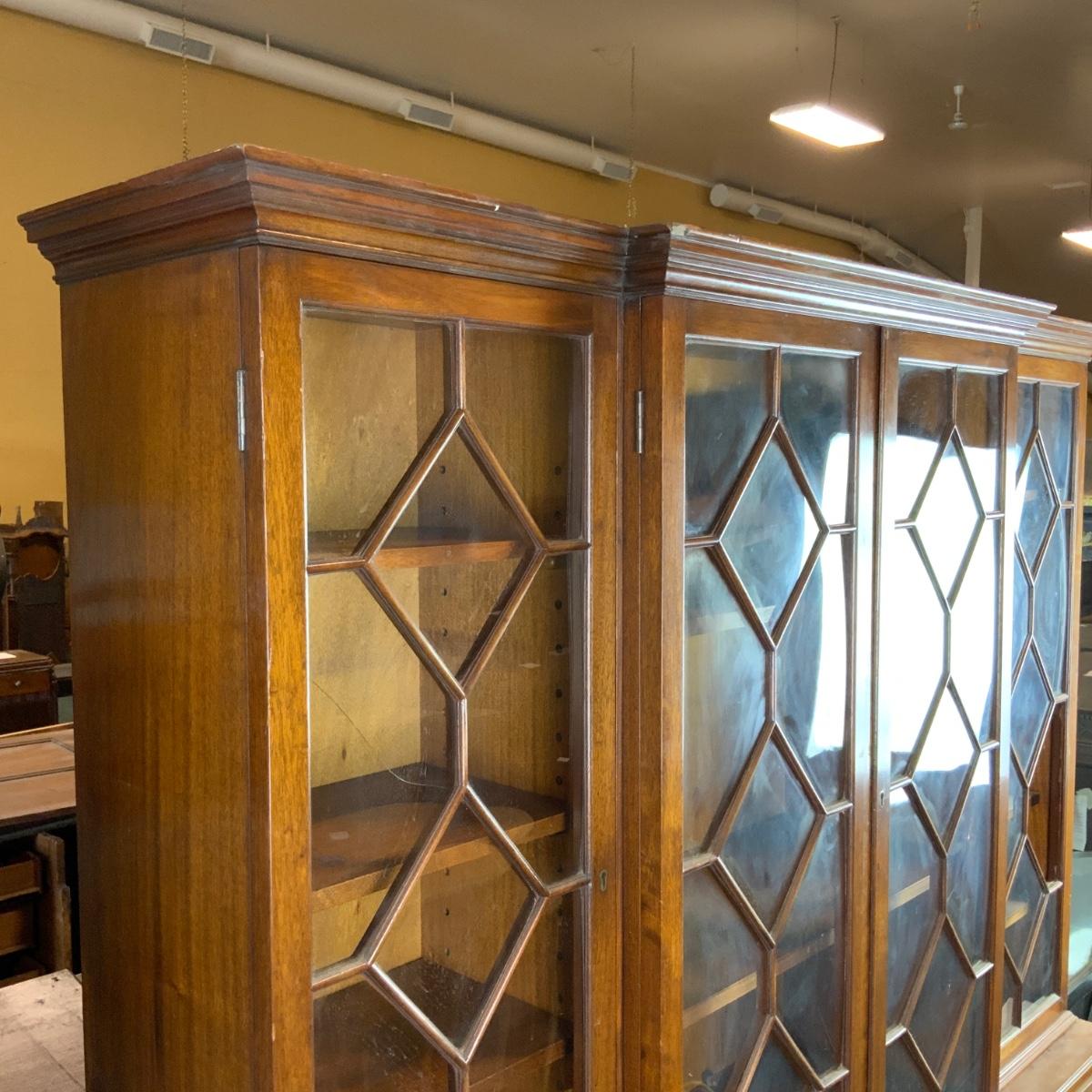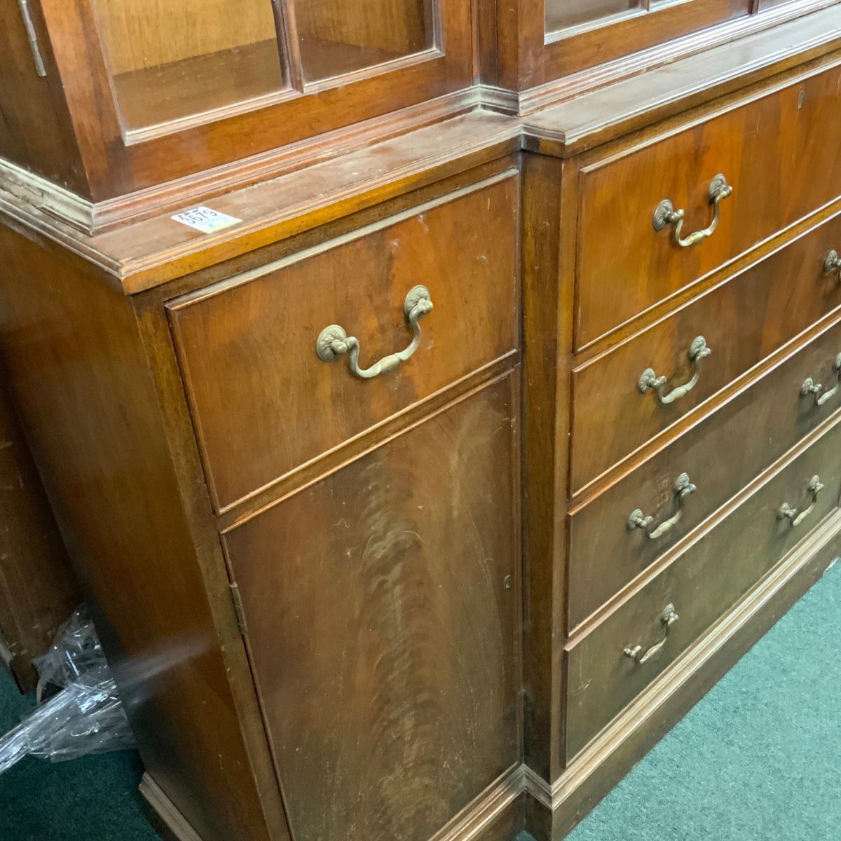 Large Lattice-Front Cabinet. Lovely solid piece. Glass needs to be replaced on the left. A real nice statement piece for your home. //::\\ Please see photos for details and condition. No attempt has been made to hide any imperfections. All items listed in this auction are warehouse items, and need to be cleaned. A majority of the items need restoration as well. All items are sold AS IS and WITHOUT GUARANTEE. If you are uncertain about an item, DO NOT BID. Due to the nature of this online auction in-person inspection is HIGHLY recommended. All Sales are FINAL. Pick Up Times are FIRM. Please confirm with your own schedule that you can pick up in the scheduled times listed in the Terms and Conditions. Any questions please message the auctioneer. DO NOT Contact The Harp Gallery.