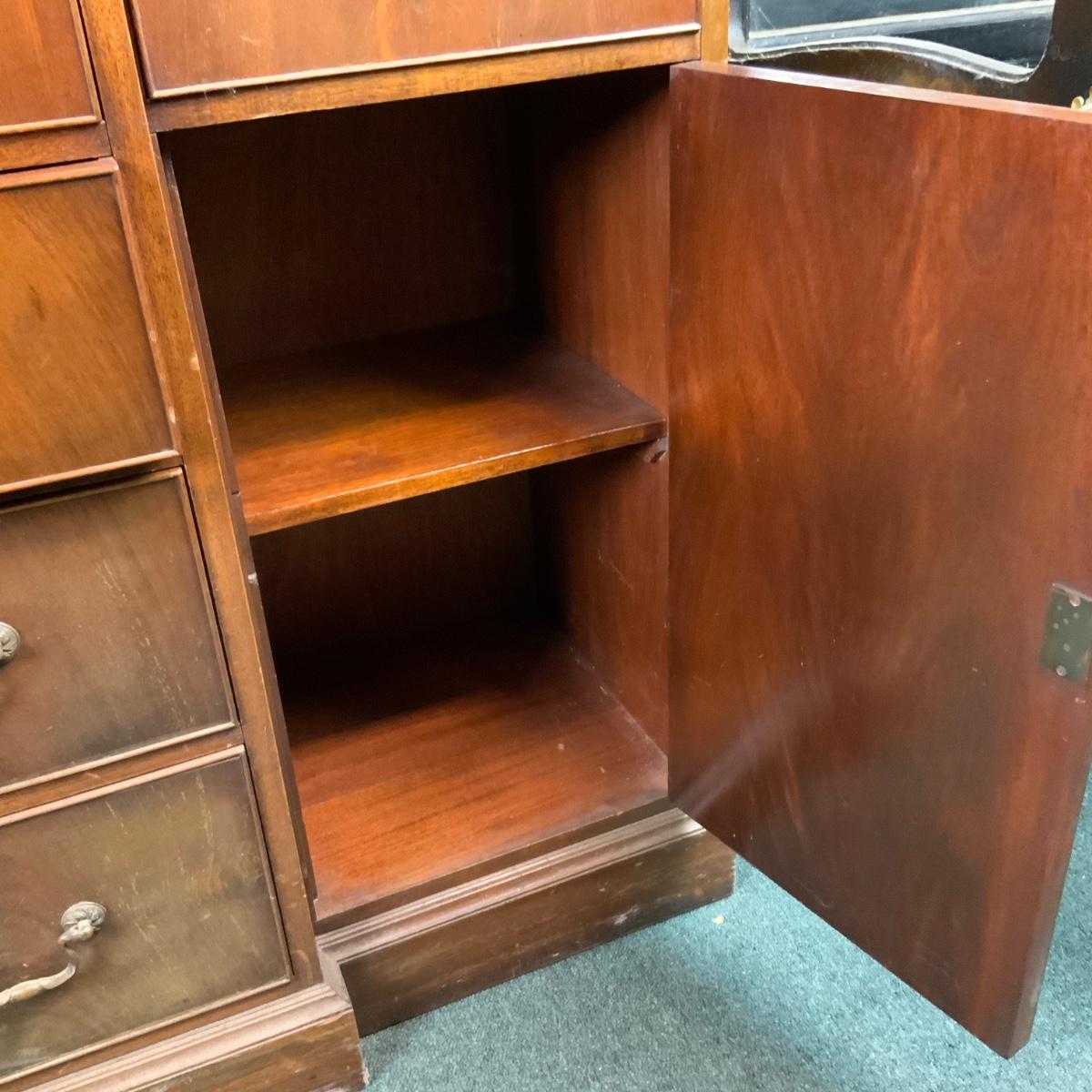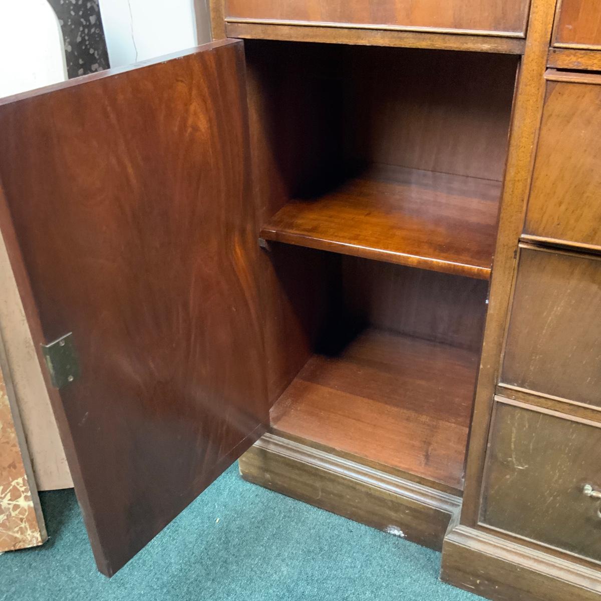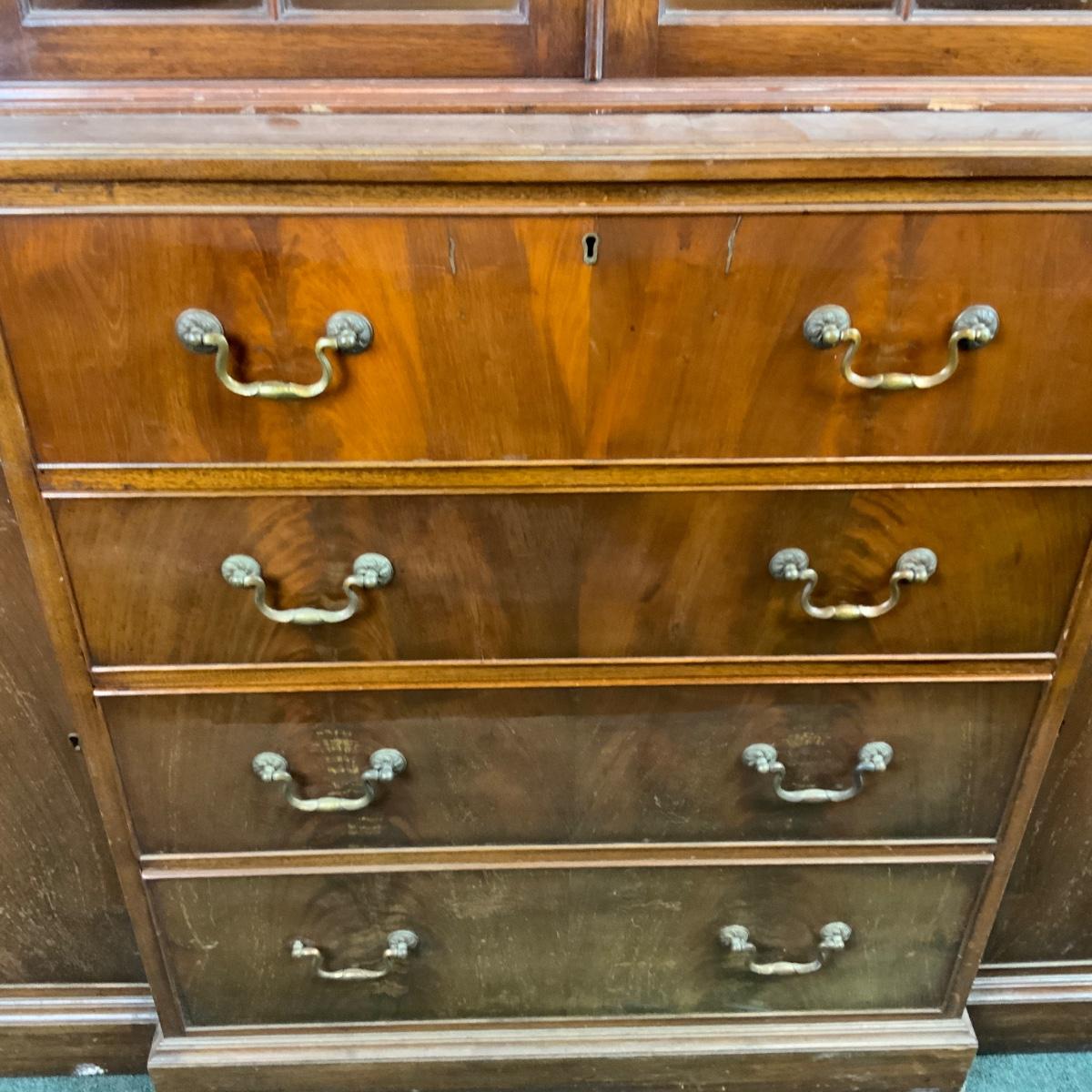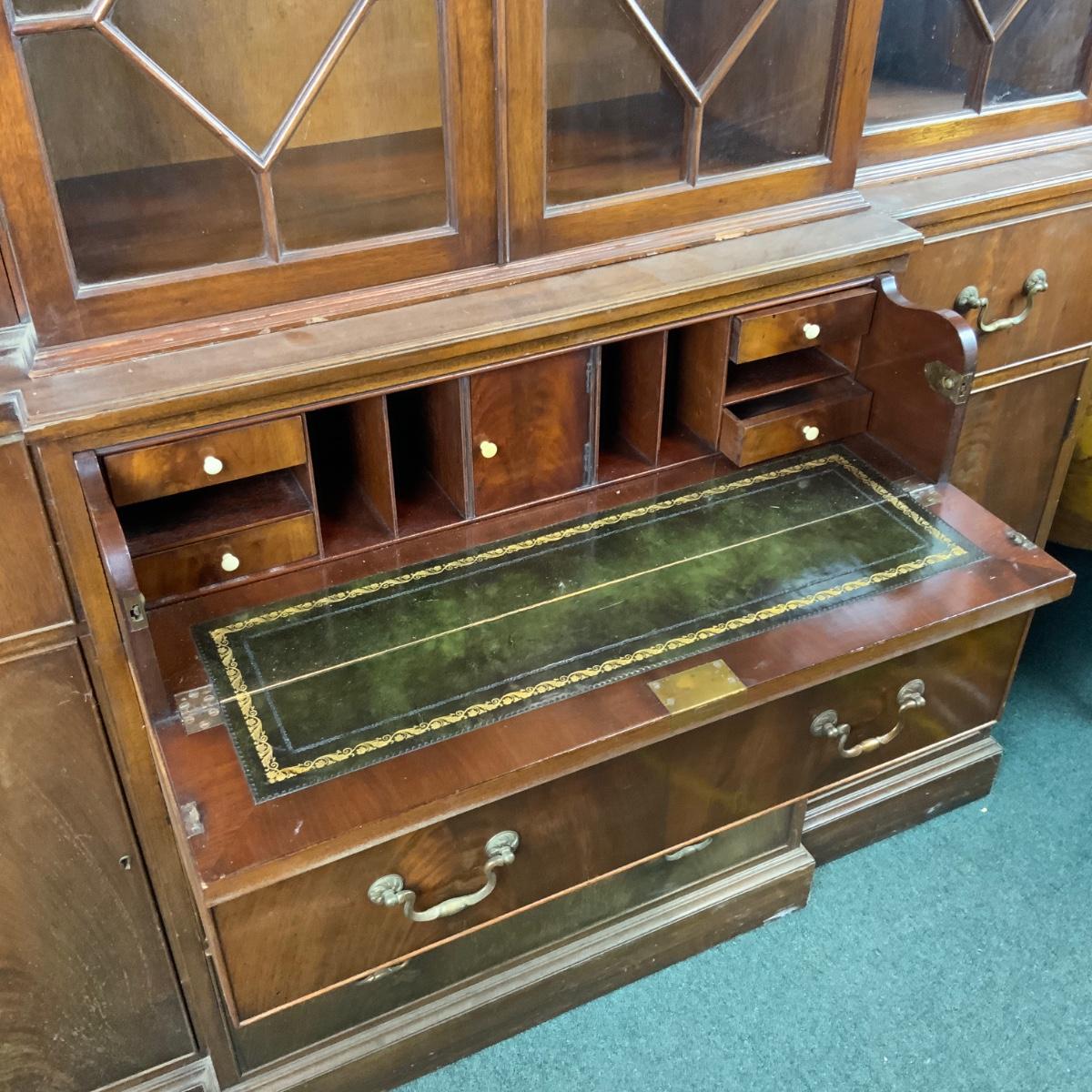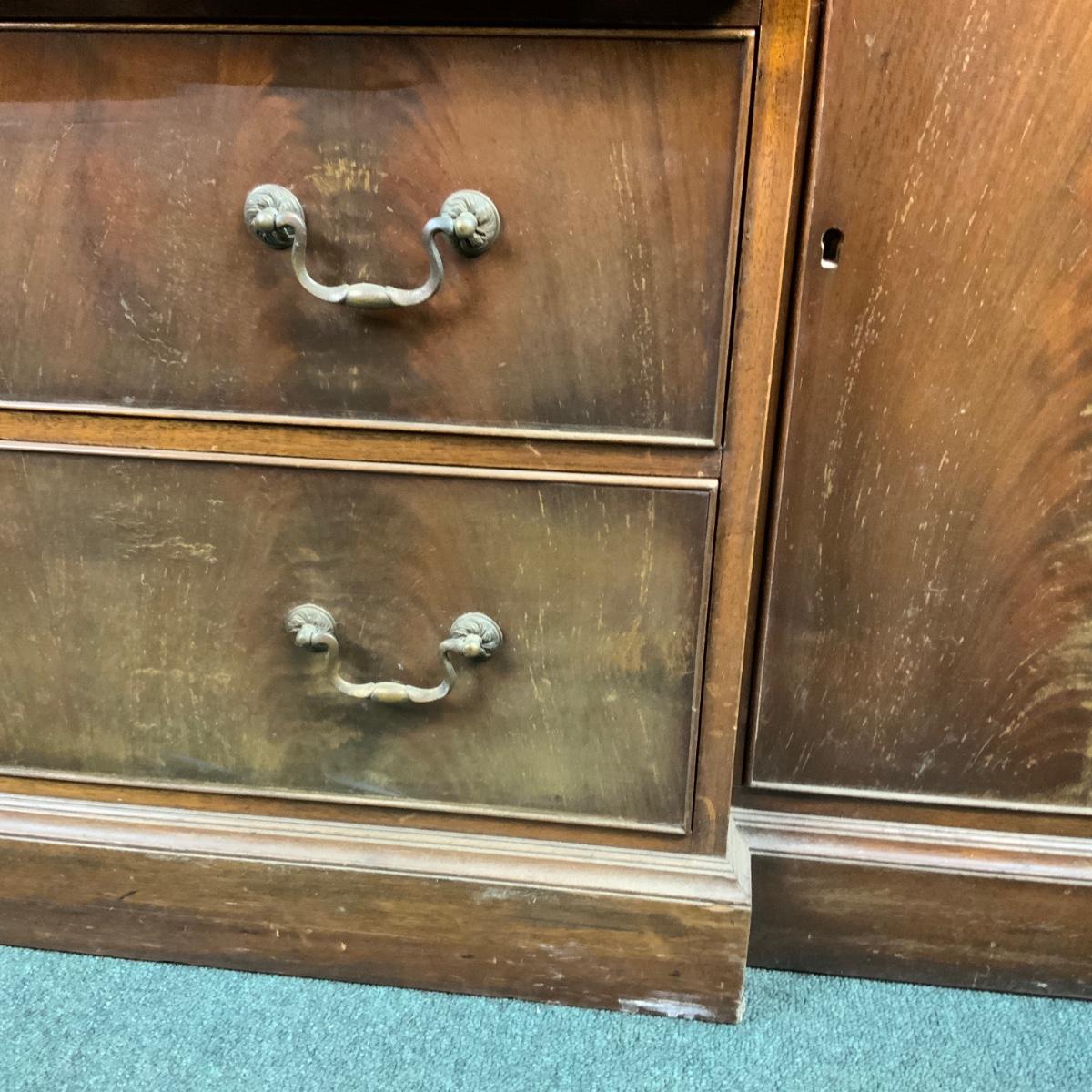 Large Lattice-Front Cabinet. Lovely solid piece. Glass needs to be replaced on the left. A real nice statement piece for your home. //::\\ Please see photos for details and condition. No attempt has been made to hide any imperfections. All items listed in this auction are warehouse items, and need to be cleaned. A majority of the items need restoration as well. All items are sold AS IS and WITHOUT GUARANTEE. If you are uncertain about an item, DO NOT BID. Due to the nature of this online auction in-person inspection is HIGHLY recommended. All Sales are FINAL. Pick Up Times are FIRM. Please confirm with your own schedule that you can pick up in the scheduled times listed in the Terms and Conditions. Any questions please message the auctioneer. DO NOT Contact The Harp Gallery.