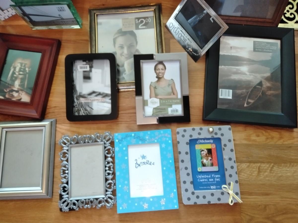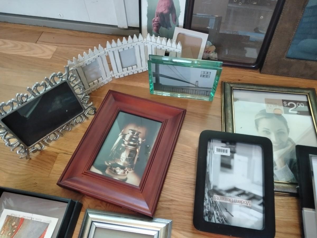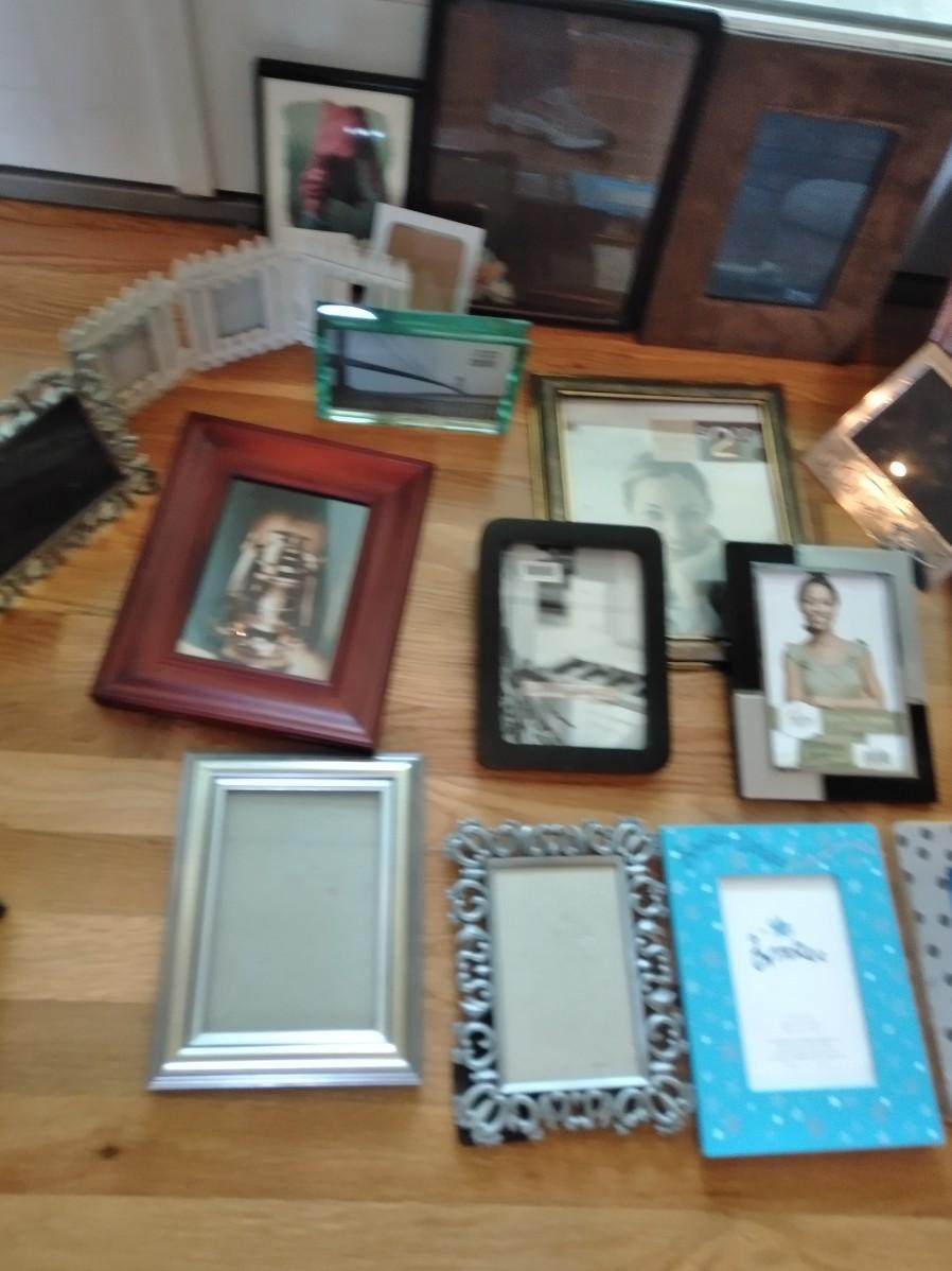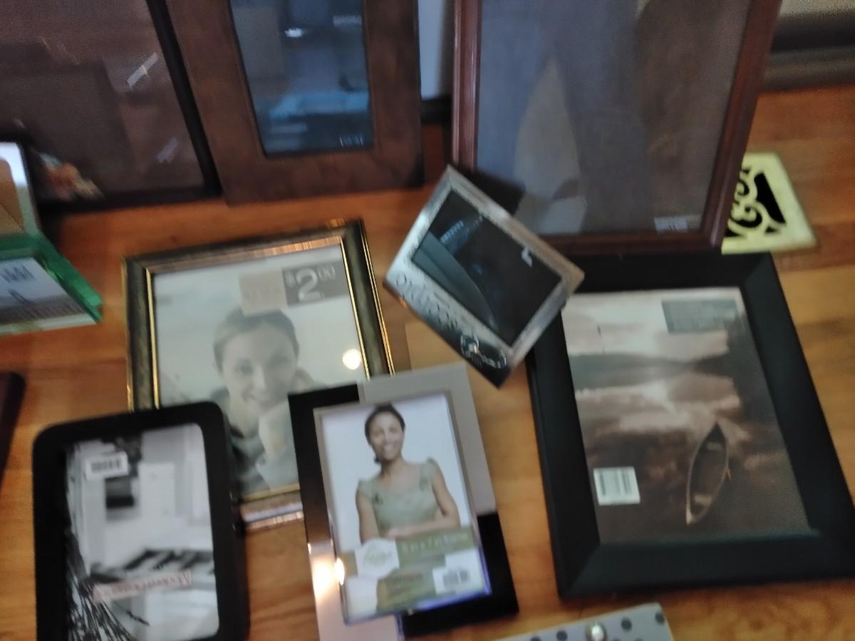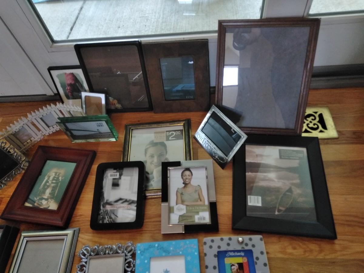 MANY PICTURE FRAMES WITH DIFFERENT DECORATIVE FRAMES, AND DIFFERENT SIZES.