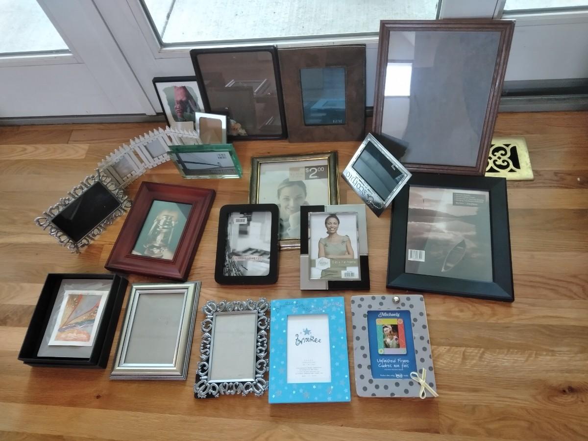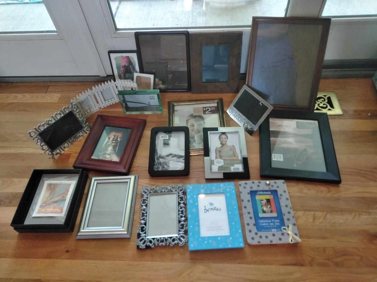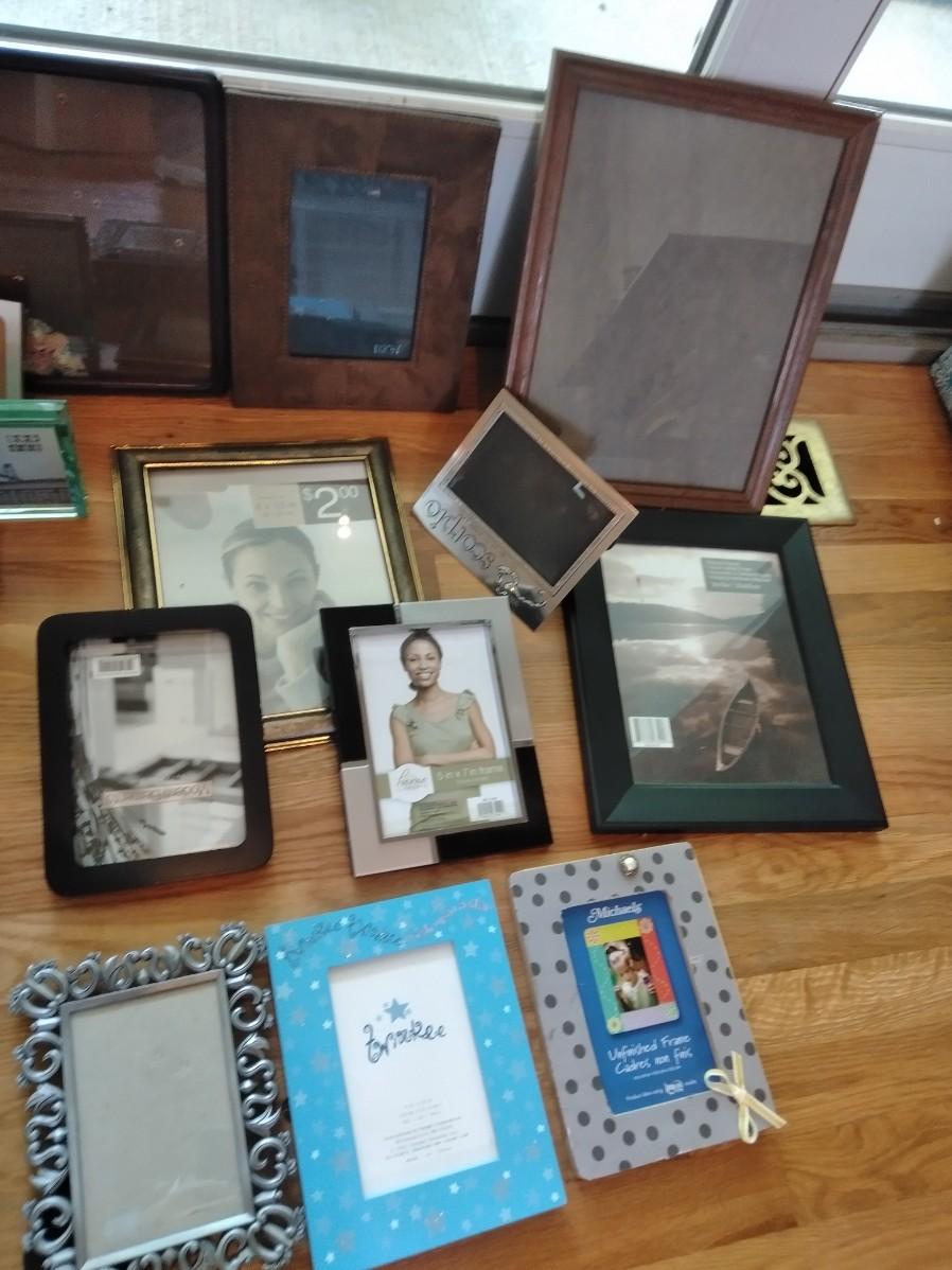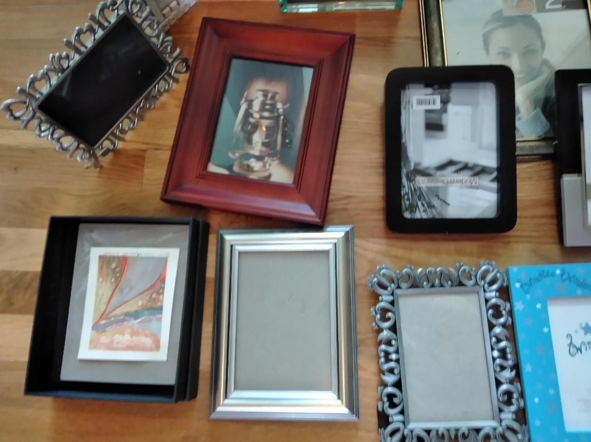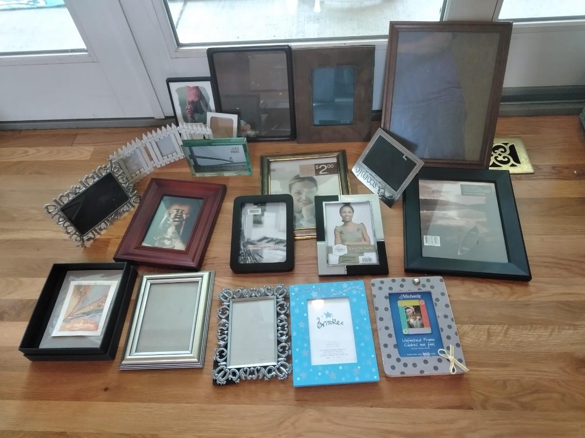 MANY PICTURE FRAMES WITH DIFFERENT DECORATIVE FRAMES, AND DIFFERENT SIZES.