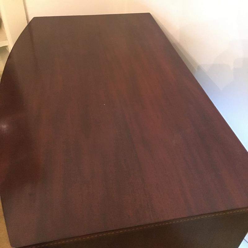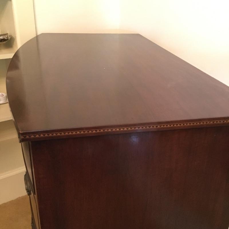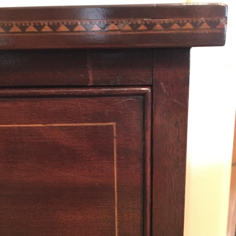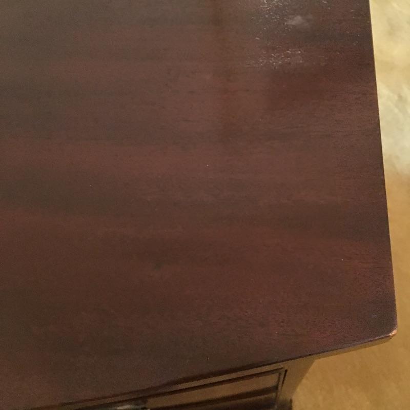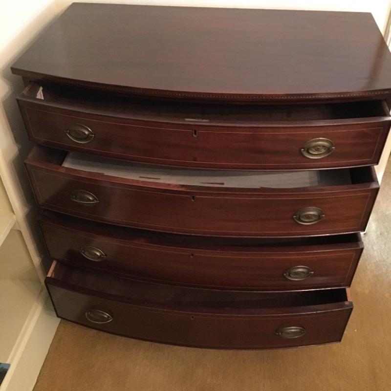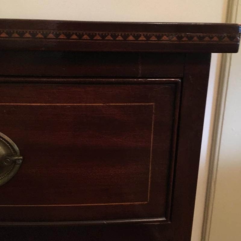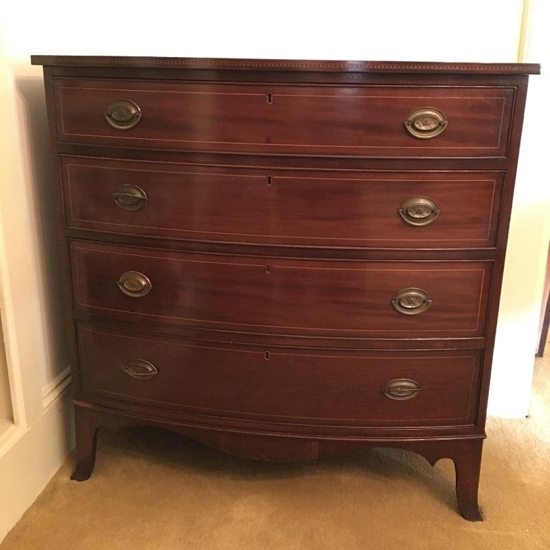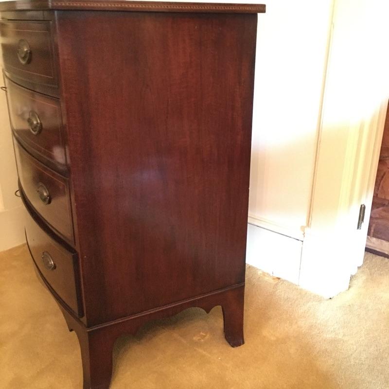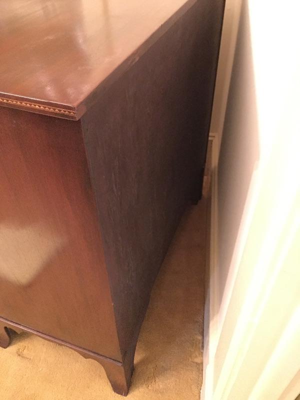 This Stunning Marlboro Manor by Sacks Bachelor chest in a rich mahogany color is in pristine shape with inlay around the top edge and four dovetailed drawers. This chest will stand out in any room in your home. Chest measures 21.5” x 37” x 37”. Bring help item is substantial.