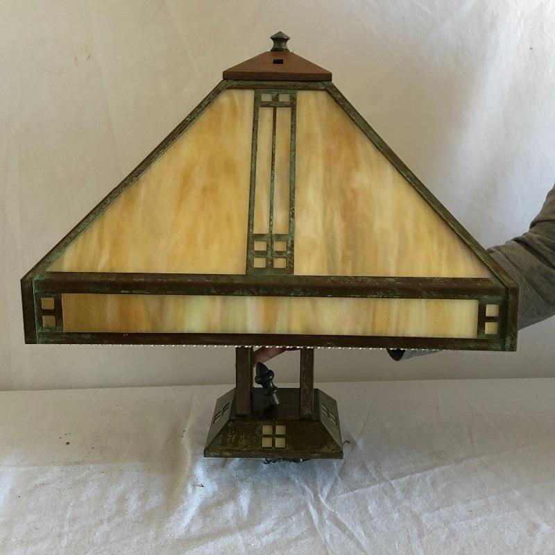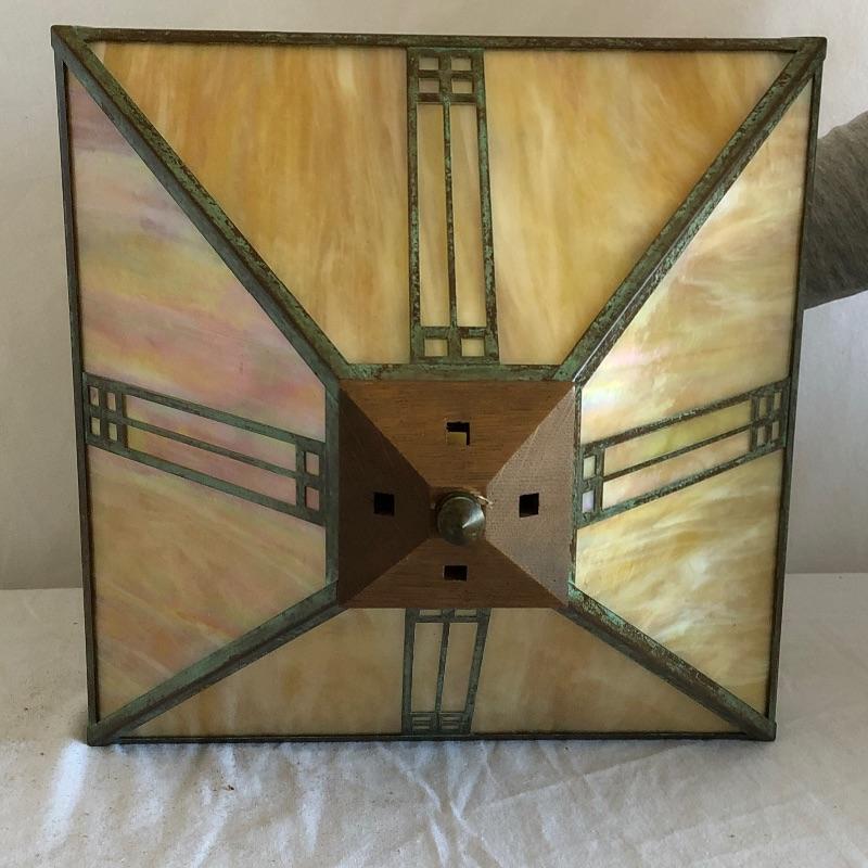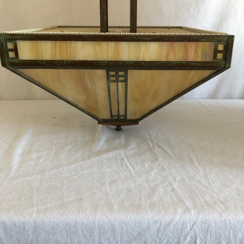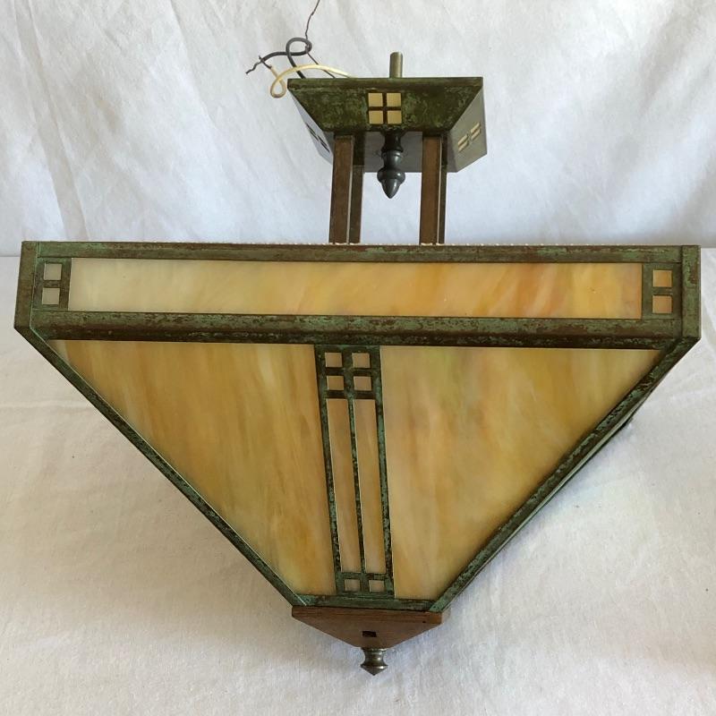 Lovely neutral colored stained glass and metal mission style ceiling lamp by Arroyo Craftsman. Three bulb lighting by Underwriters Labratories.