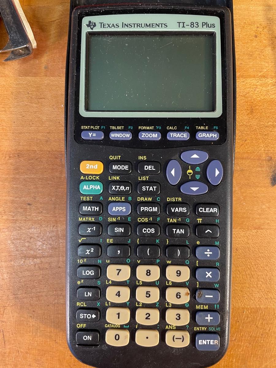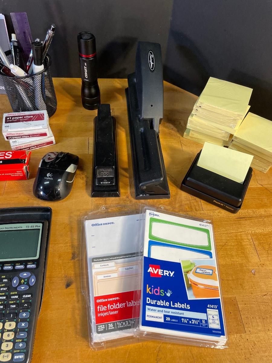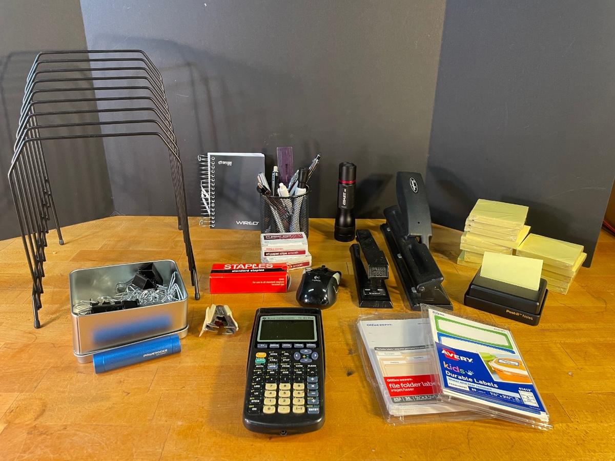 includes TI-83 plus calculator, heavy-duty 3-hole punch, post-it notes with dispenser, pen cup paperclips, labels, notebook, stapler and a file rack