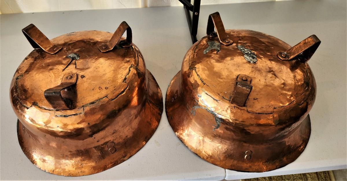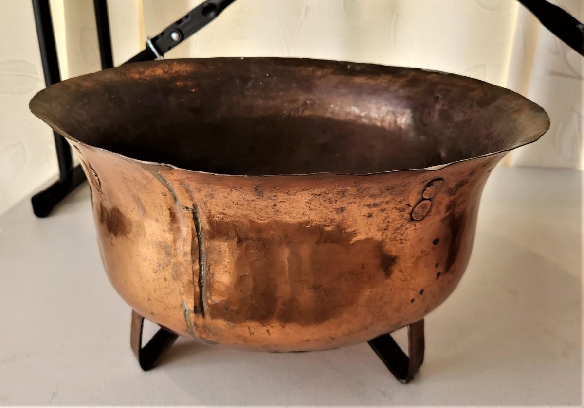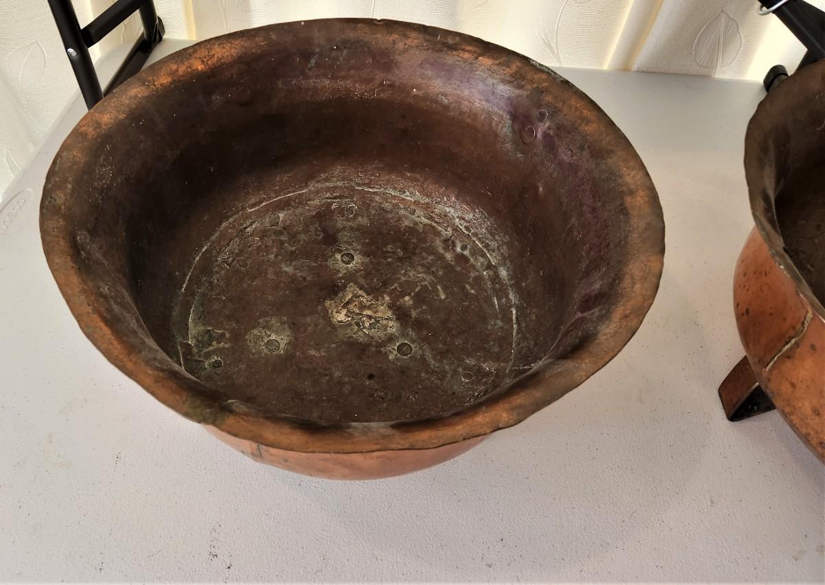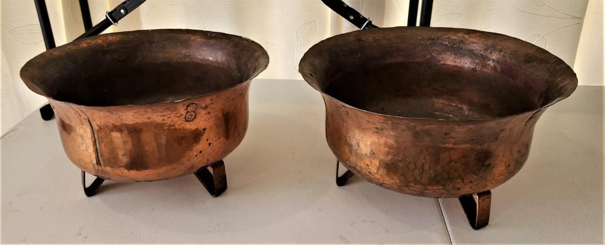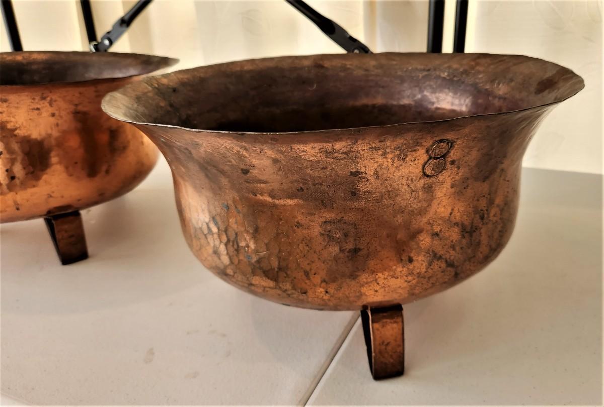 Two good-looking vintage copper planters/pots - each 16" across, 9" tall. Appear to be hand-forged. Vintage condition, as shown. These would look great on your patio.