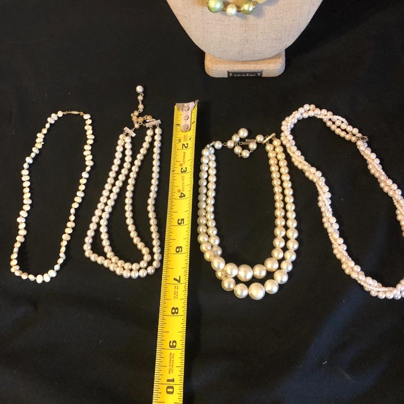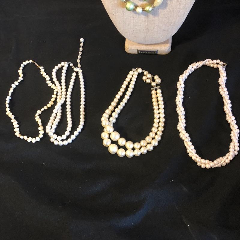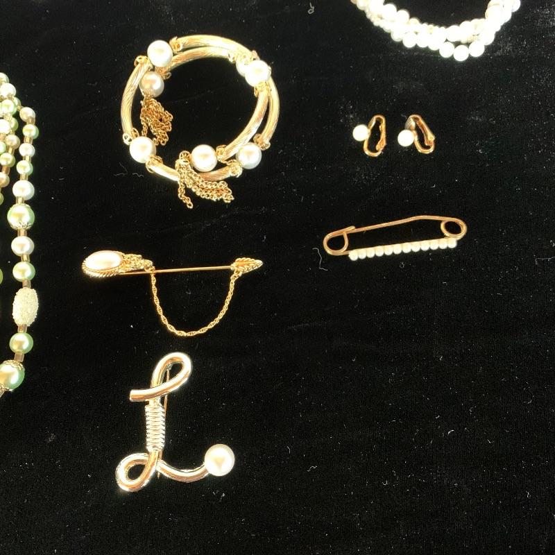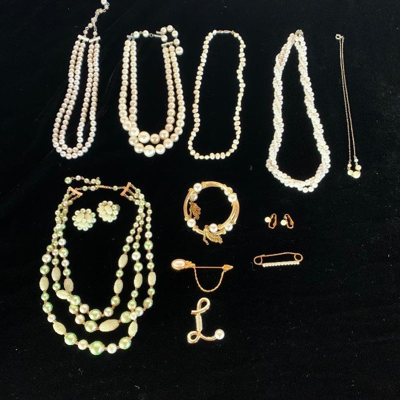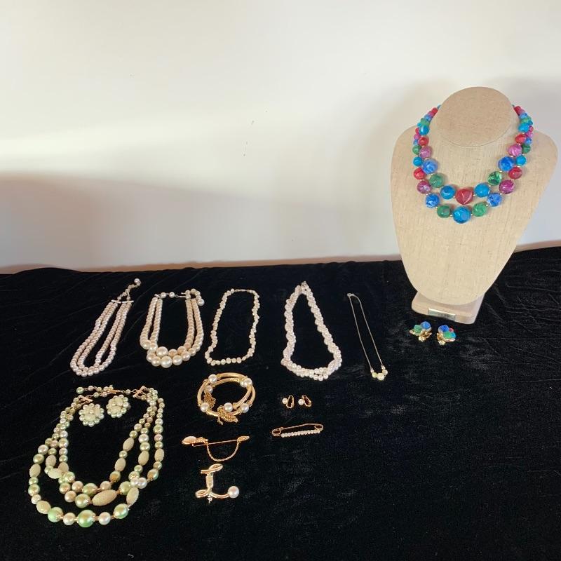 This lot contains some perfectly pearly pieces! There are a variety of several strands including freshwater pearls, three pins and one pair of clip pearl earrings. There are two sets of necklaces with clip earrings with one having a pearl hue in green and the other very bold colorful, possibly resin beads. Shipping is available for this lot.
