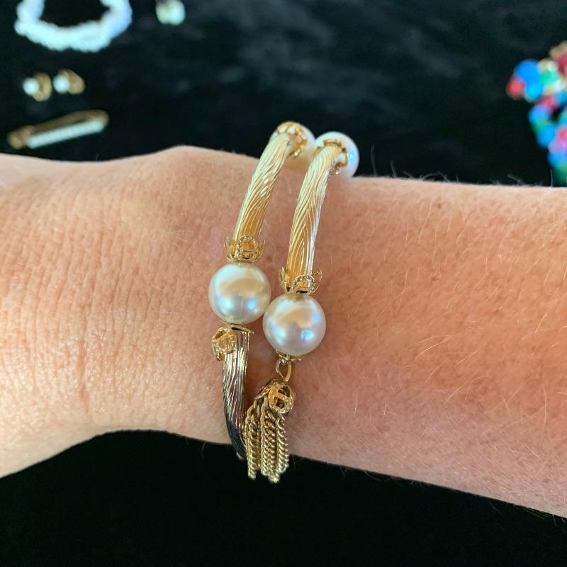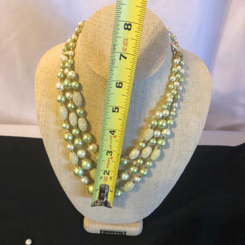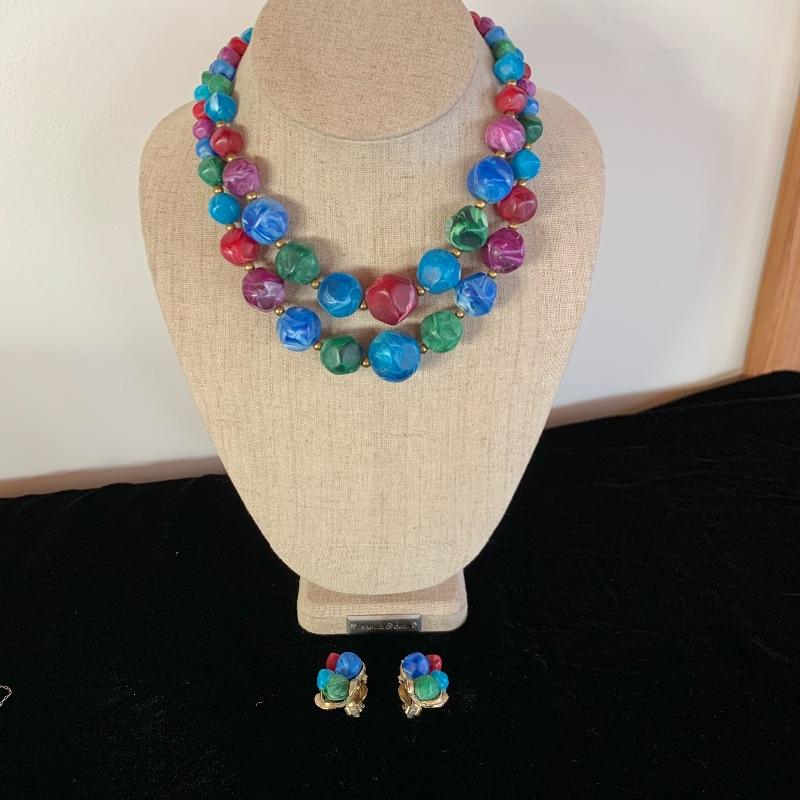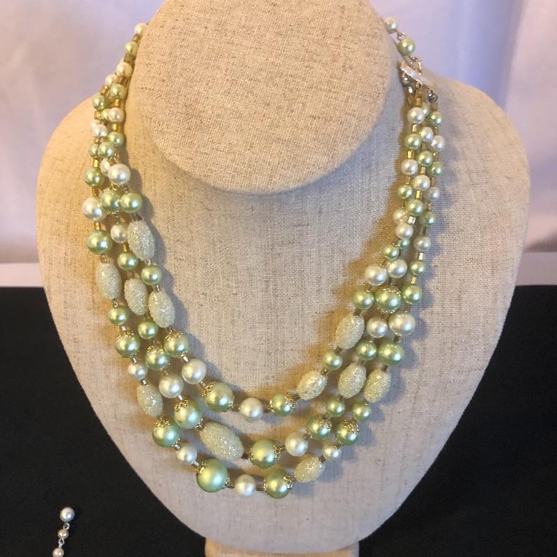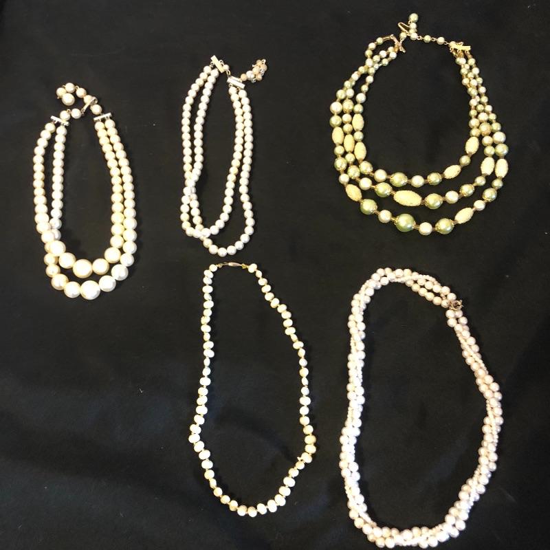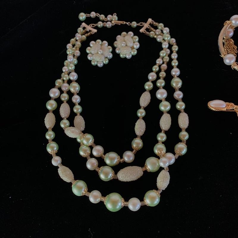 This lot contains some perfectly pearly pieces! There are a variety of several strands including freshwater pearls, three pins and one pair of clip pearl earrings. There are two sets of necklaces with clip earrings with one having a pearl hue in green and the other very bold colorful, possibly resin beads. Shipping is available for this lot.
