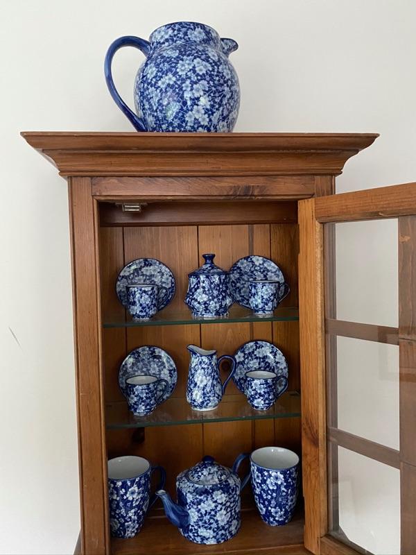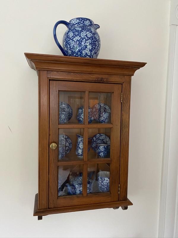Beautiful Pine Wall Cabinet measures 20”x31” tall x 8” deep comes with 14pc set of Blue Calico China