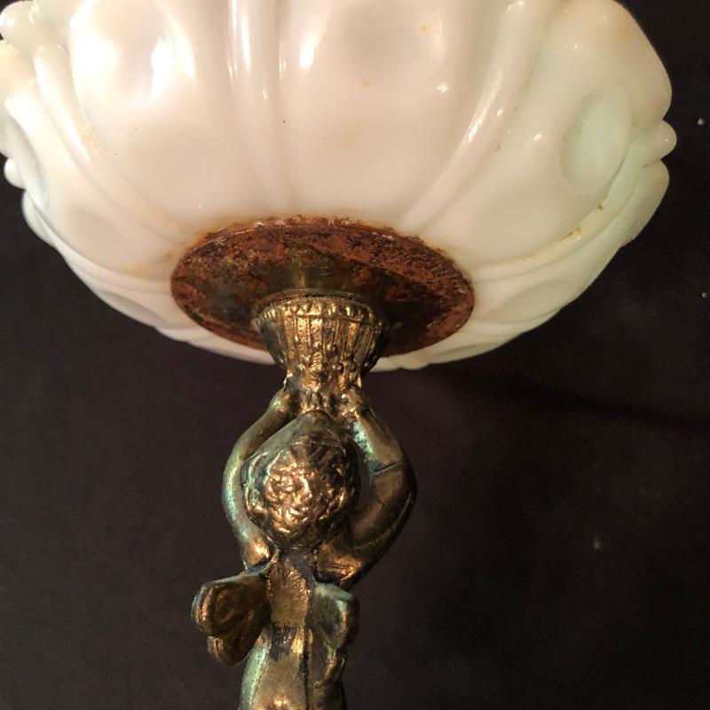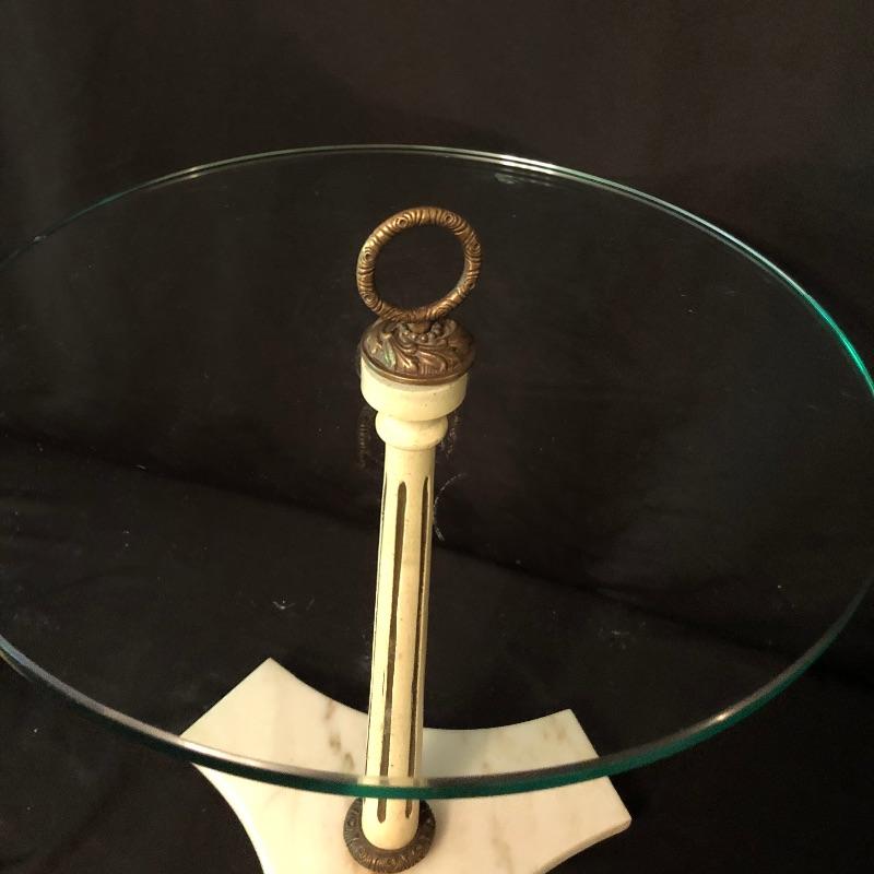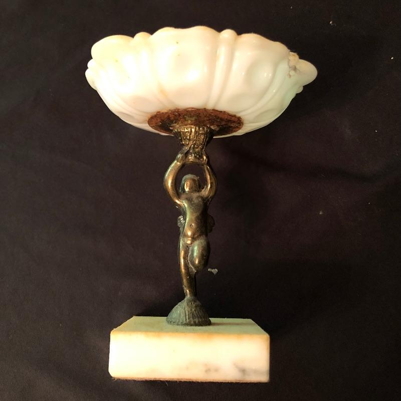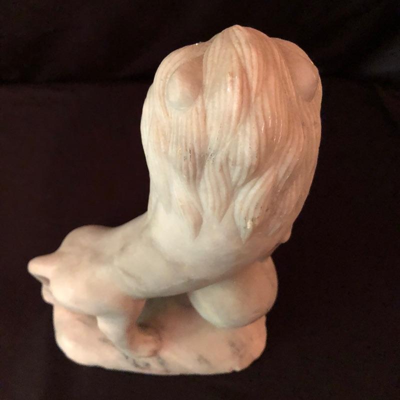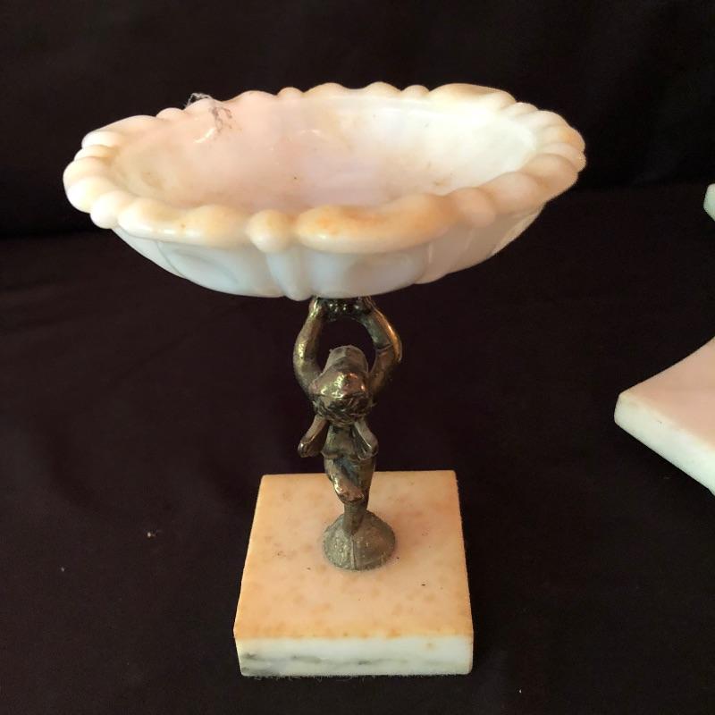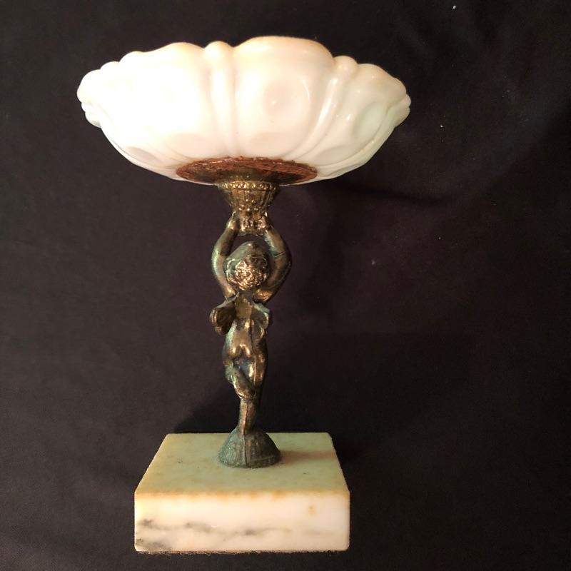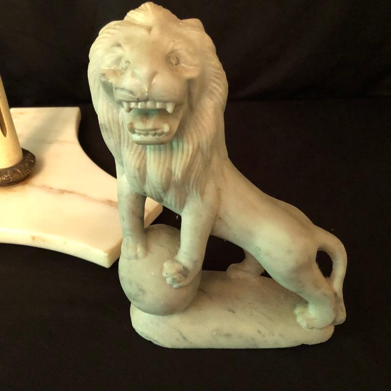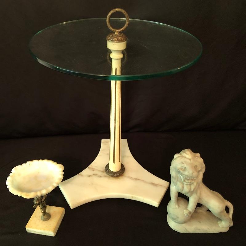 This stunning marble based pedestal stand comes with a nice thick glass top. The marble base is set on three wood feet as despite its size it is quite a heavy piece due to the weight of the marble. It’s an elegant piece. We have added a small angel also mounted on a marble base, holding a small dish and a lion that is possibly made from marble or possibly stone, it’s also a heavy piece.