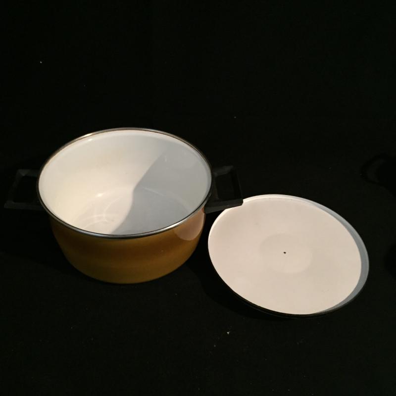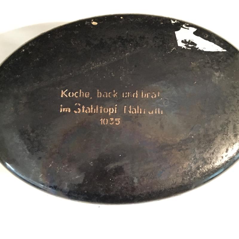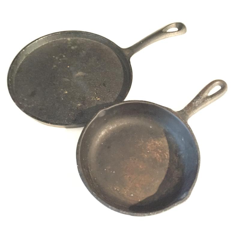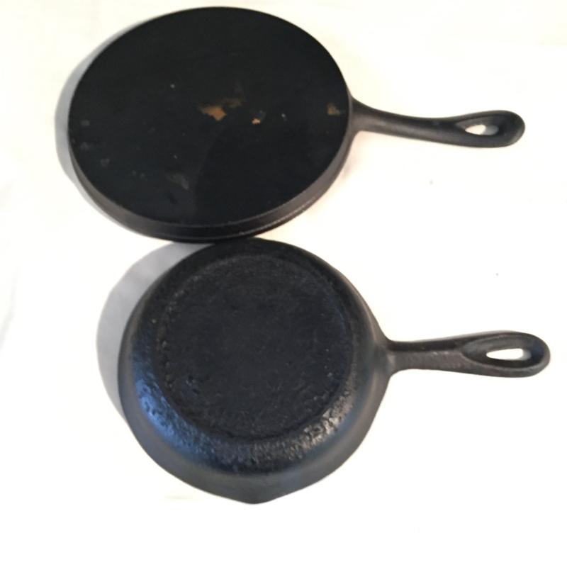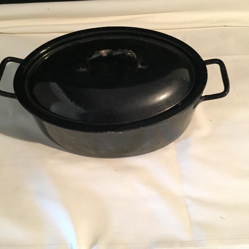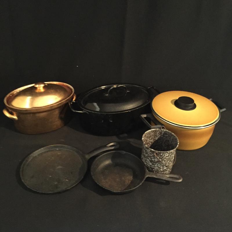 Nice Selection of Cast Iron Pans, Enamel covered Pot and More. Black Roasting Pan needs cleaning and Measures 11” x 7.75” x 4.5”.