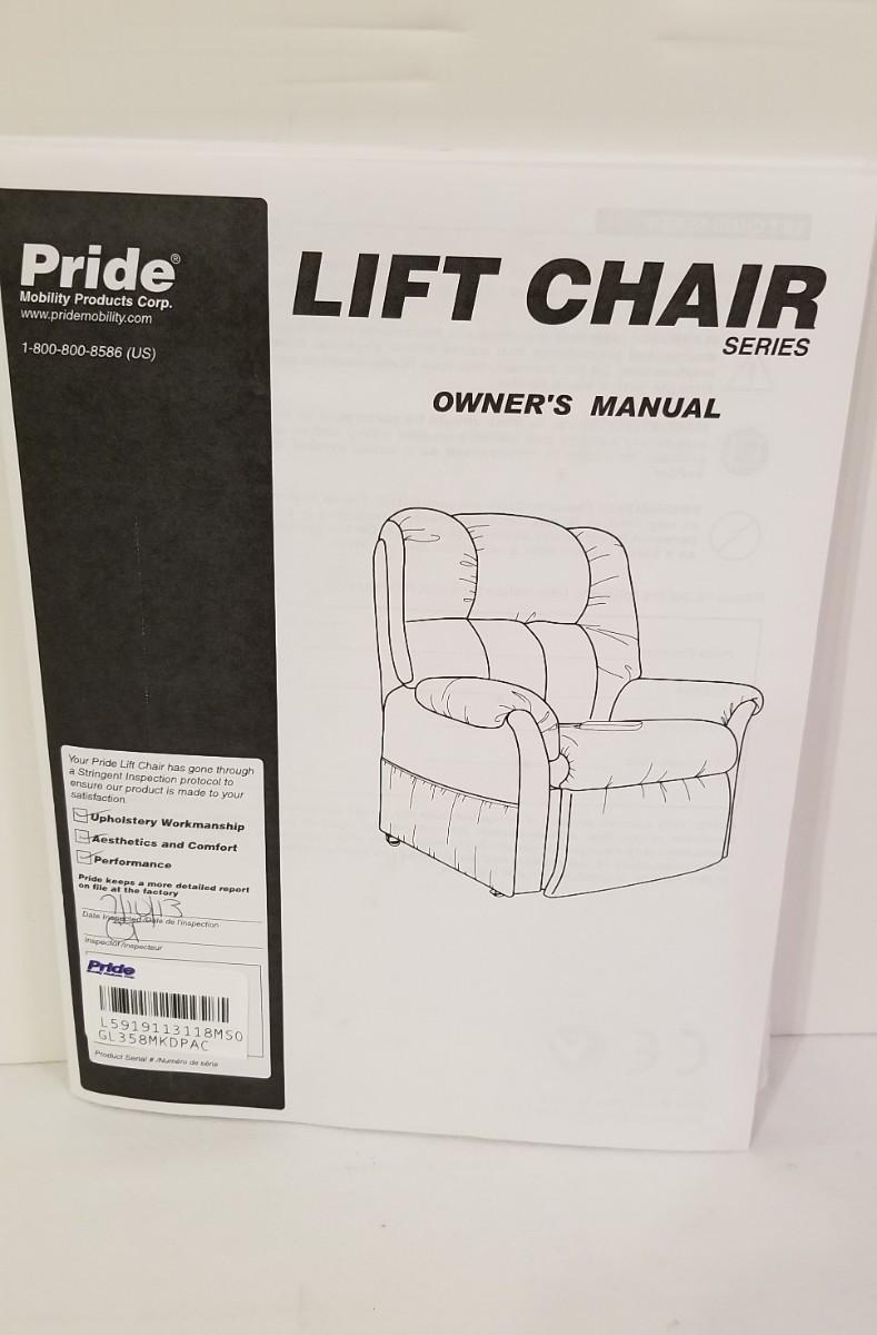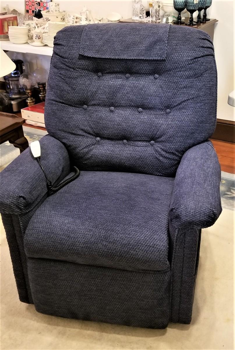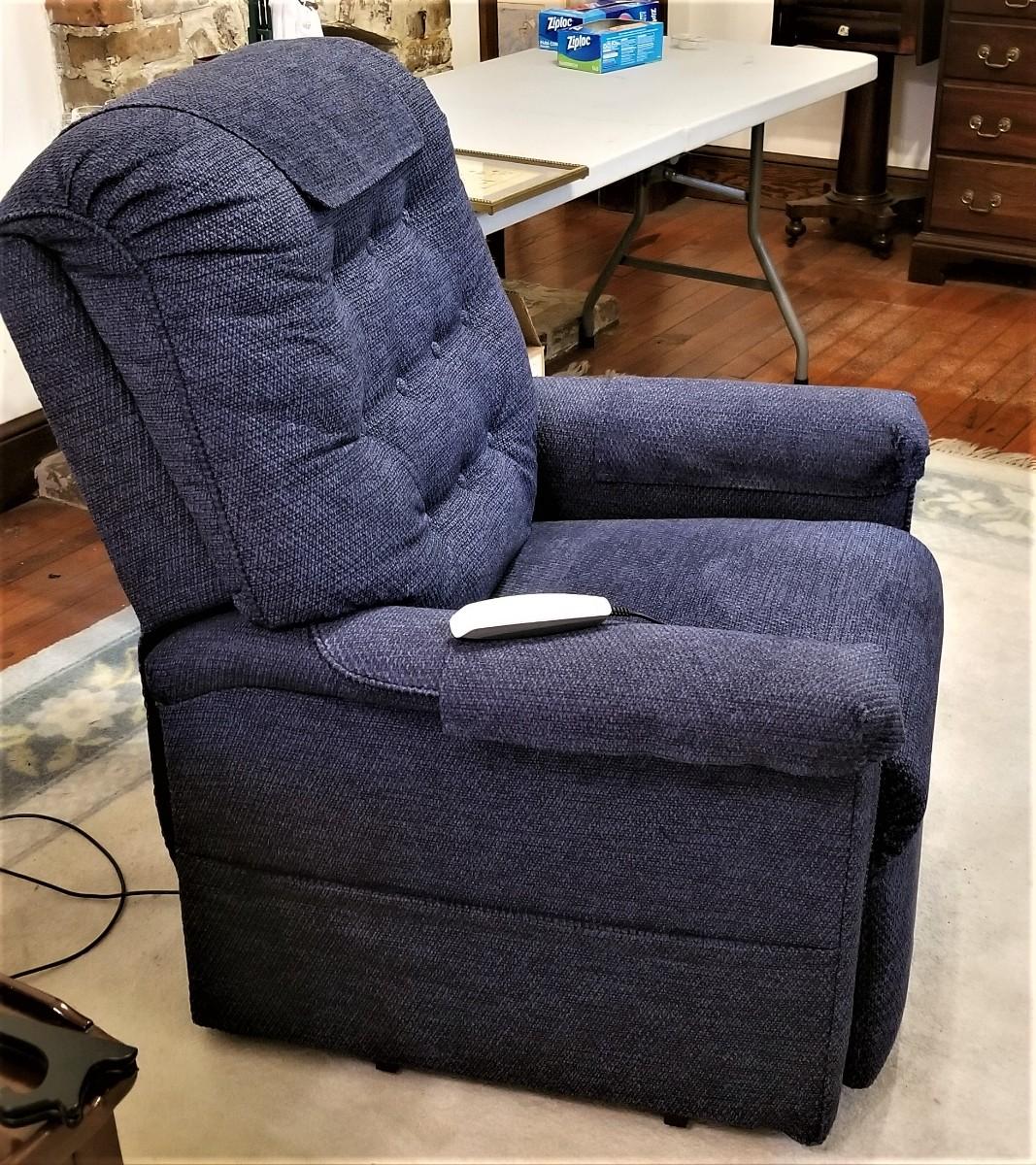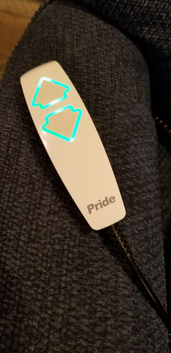 This PRIDE brand Lift Chair is in very good used condition - works fine - adjusts all the way back to sleeping position. 33" across, 39" tall, 28.5" deep.