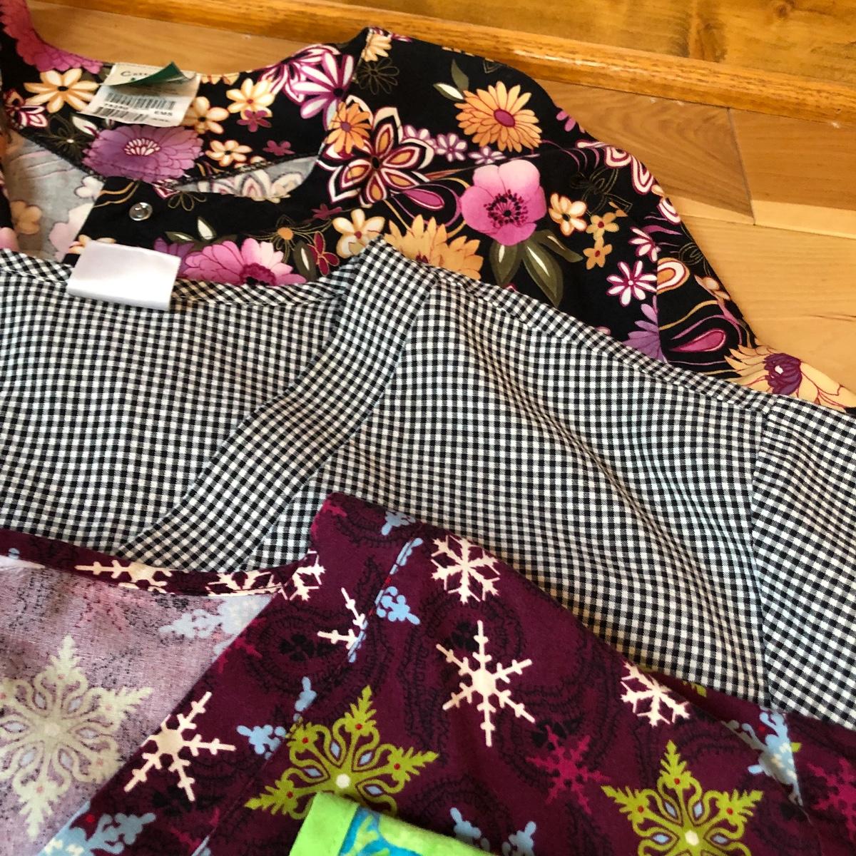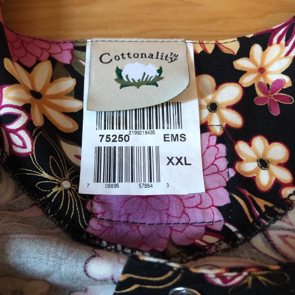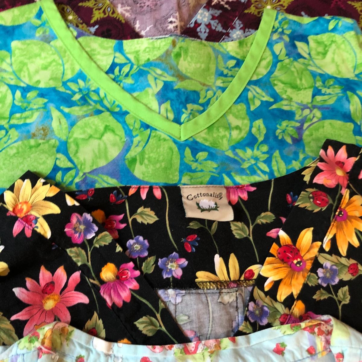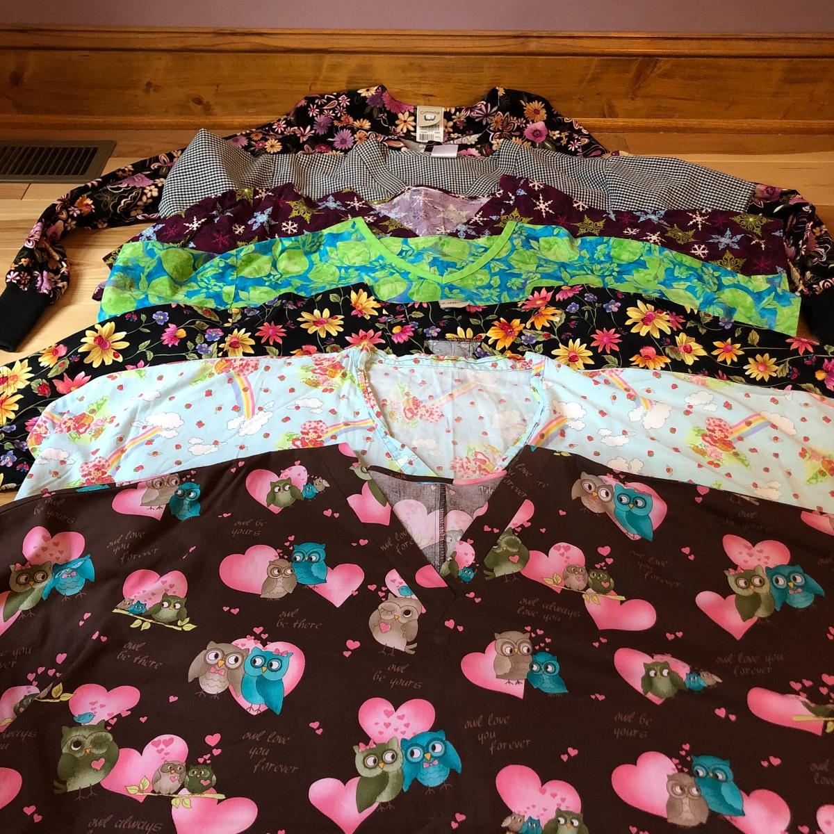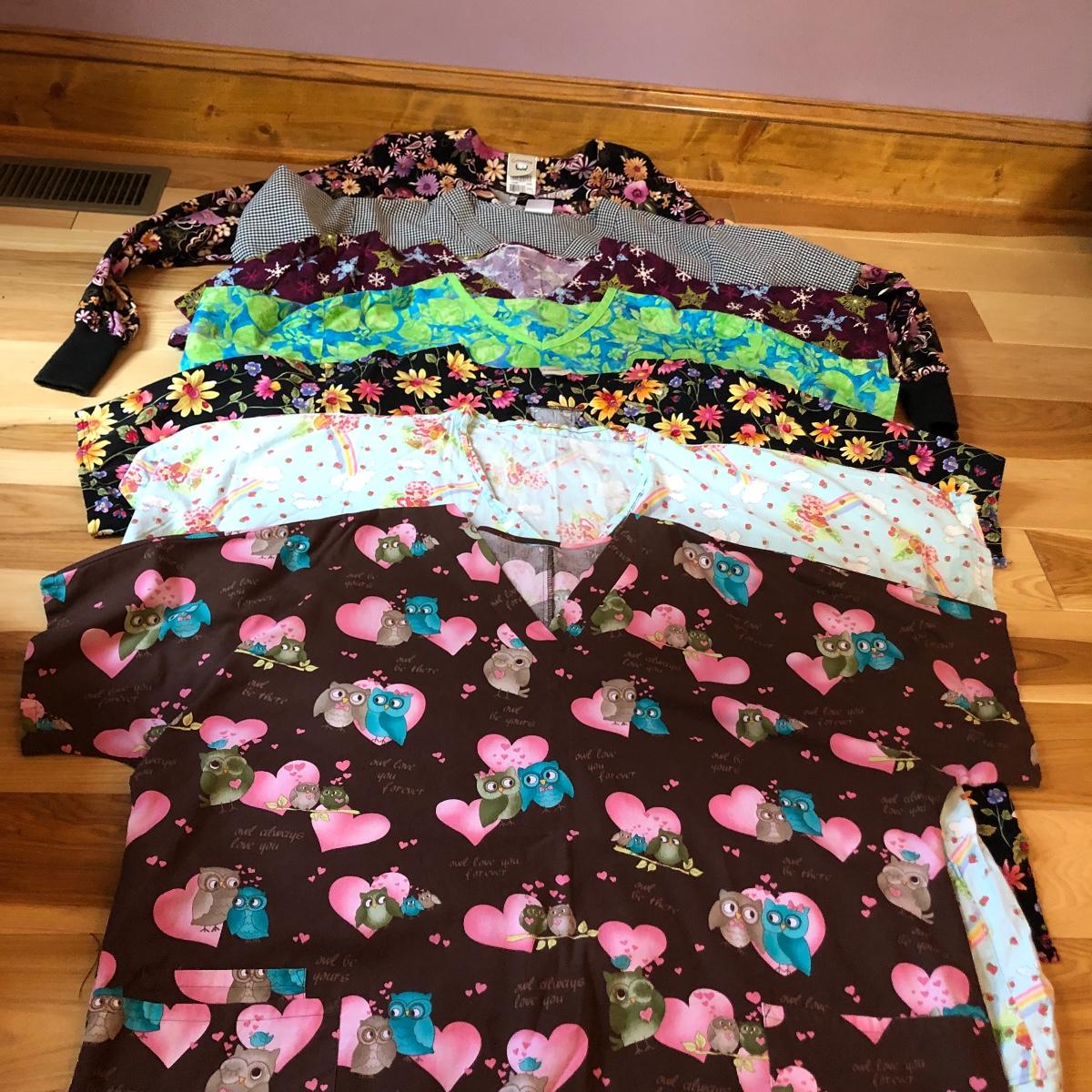There are seven colorful scrubs tops in this lot. 6 of the 7 are short sleeve. Some of the tags have been cut out so sizes are not known but they all seem to be the same size as the Cottonality tops that are XXL.