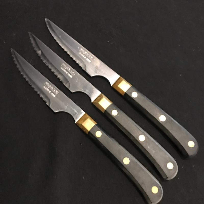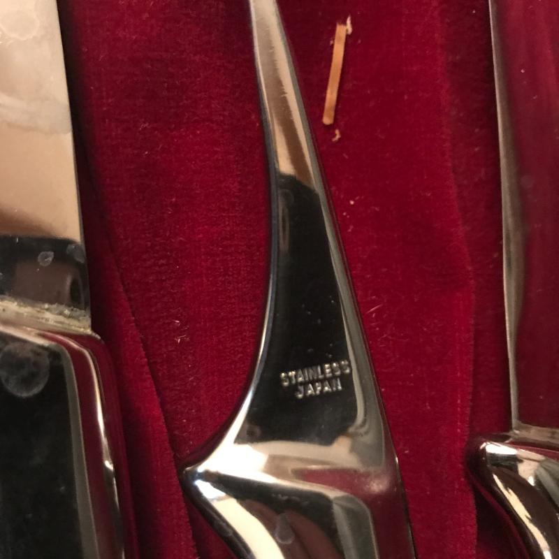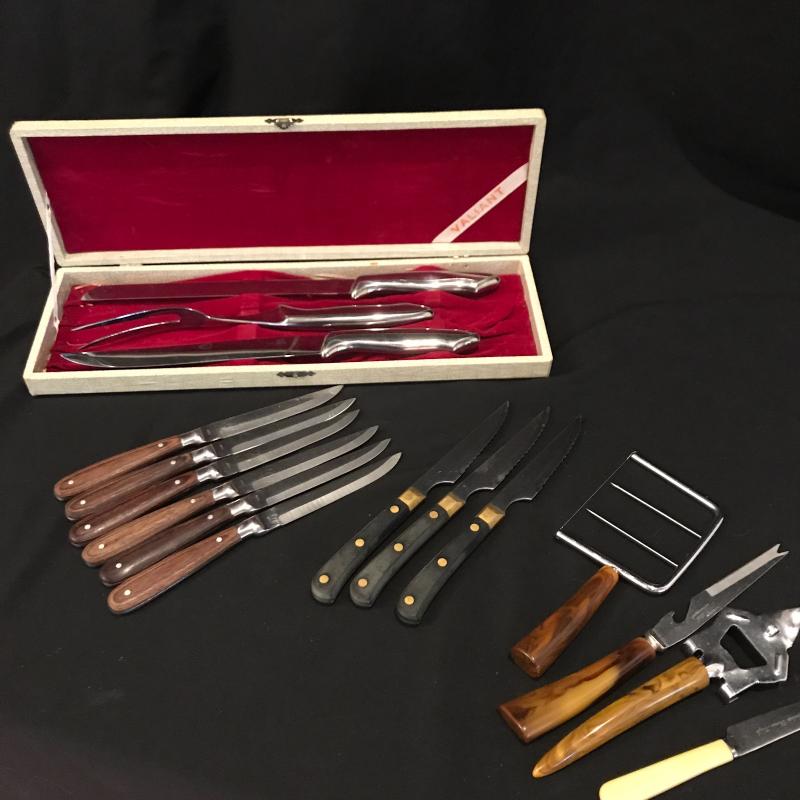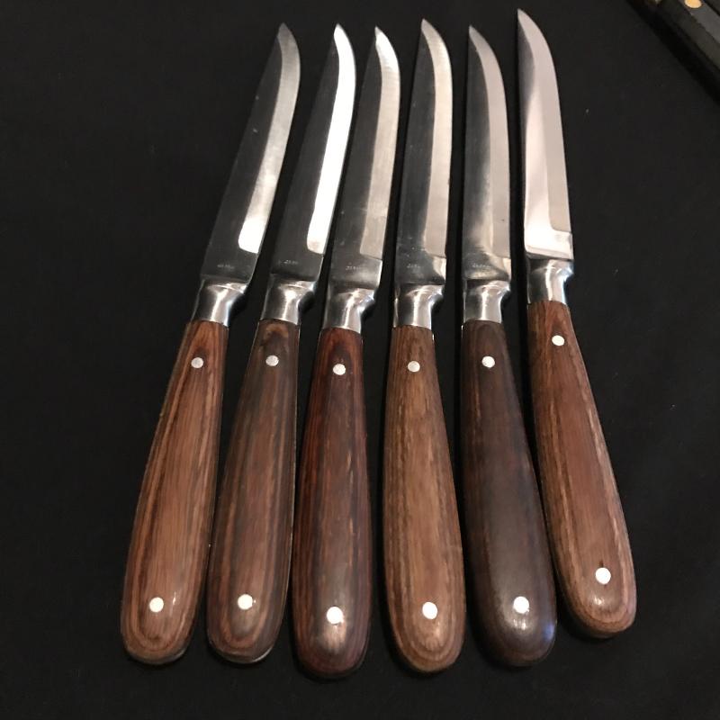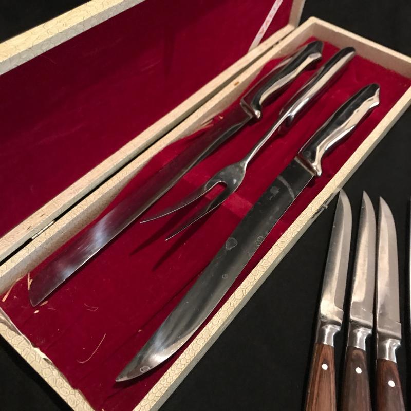 Nice stainless steel serving set in box. Box hinge is broken. Lot also includes resin handled set and steak knives by Hull and Inox Arcos. Shipping or local pick up in Asheville, NC.