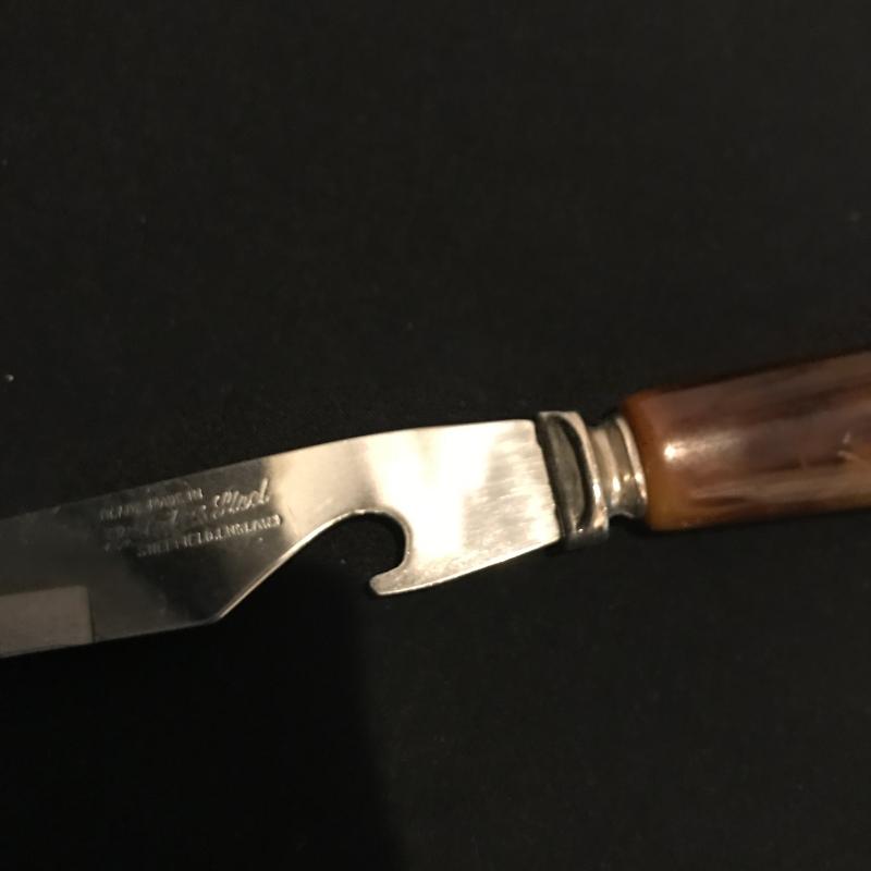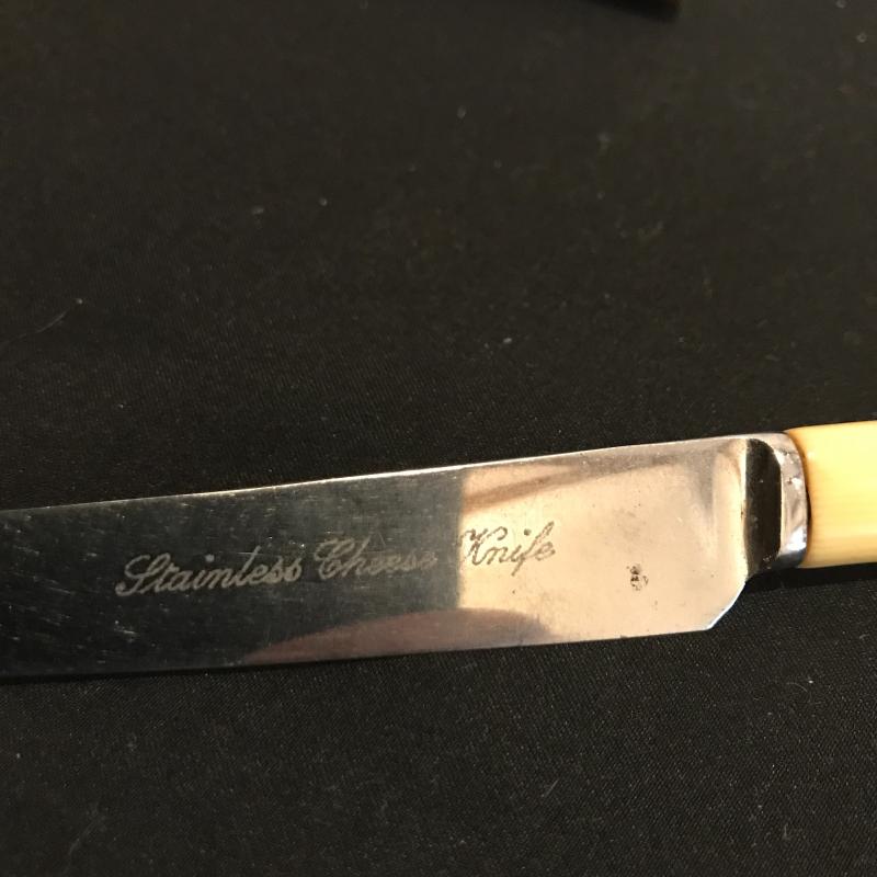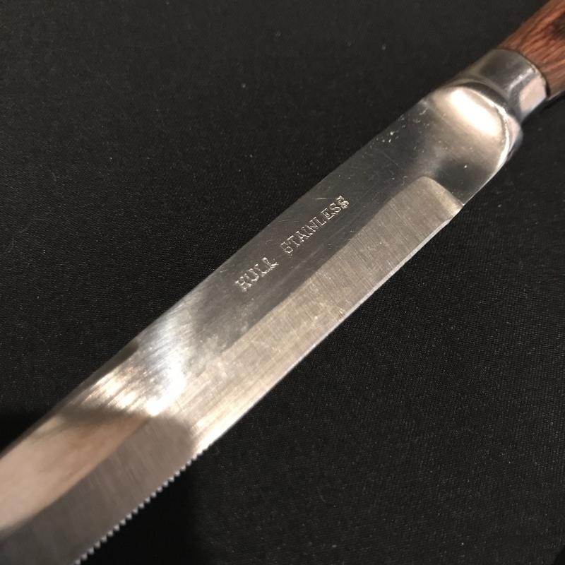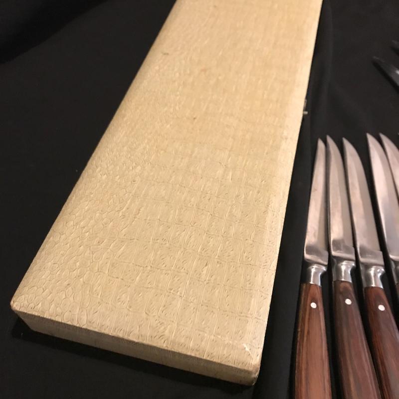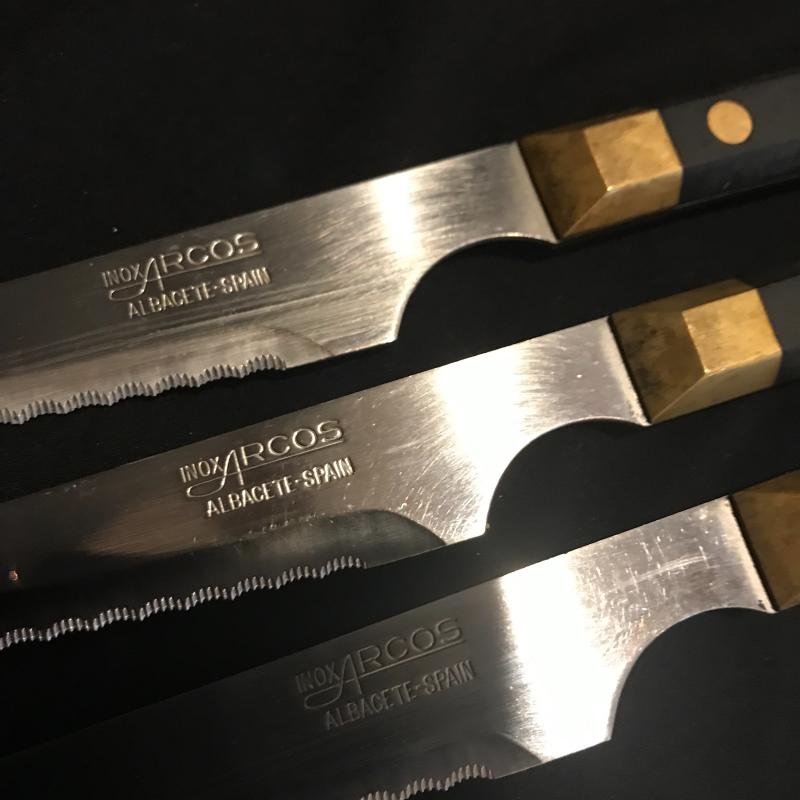 Nice stainless steel serving set in box. Box hinge is broken. Lot also includes resin handled set and steak knives by Hull and Inox Arcos. Shipping or local pick up in Asheville, NC.