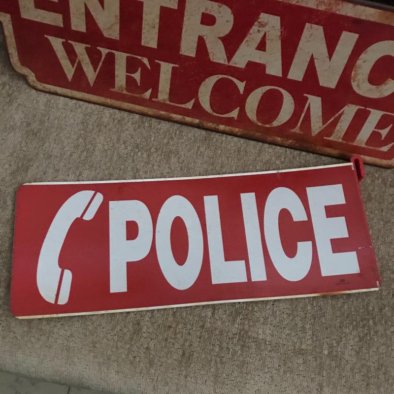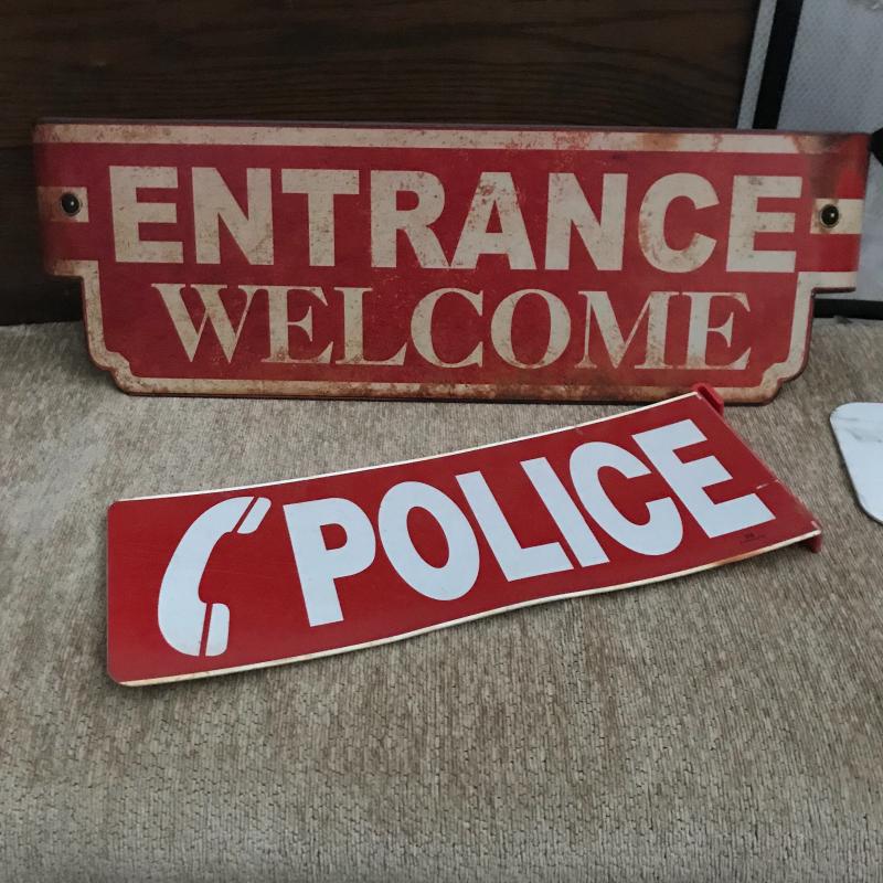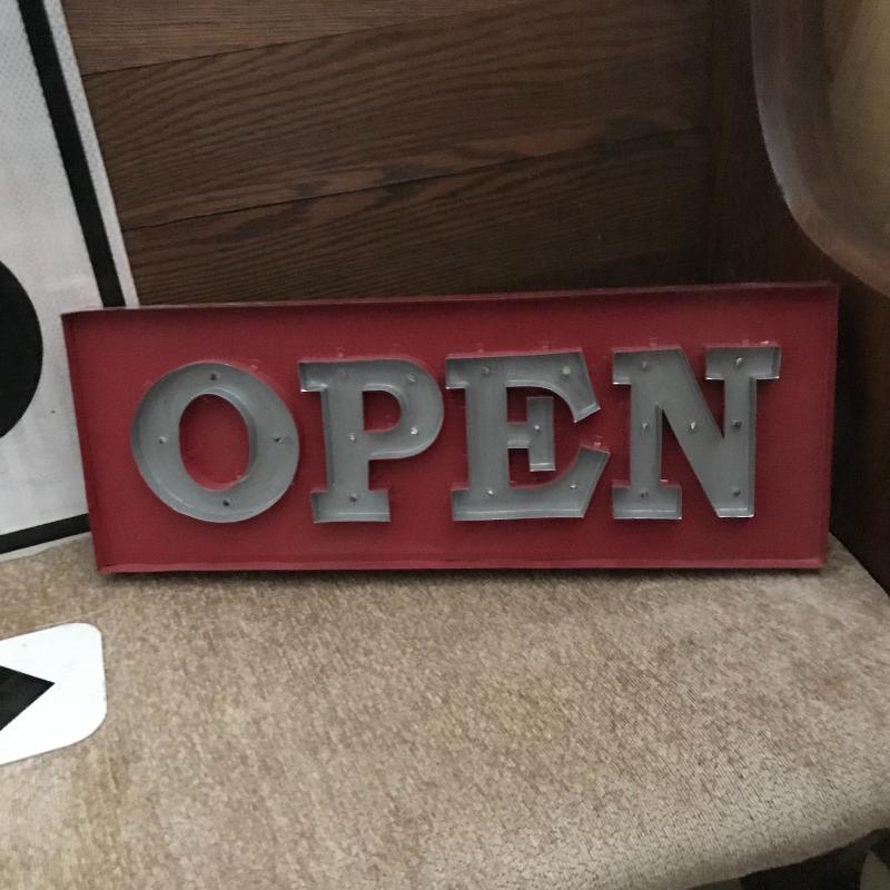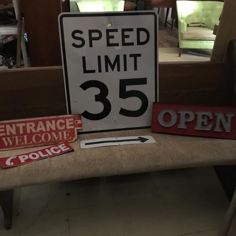 5 signs, all metal but one (police sign is plastic). Open sign takes batteries and has a switch. Cannot verify whether it works. Speed Limit sign measures 30” x 24”. Lot is available for local pick up in Maggie Valley, NC only.