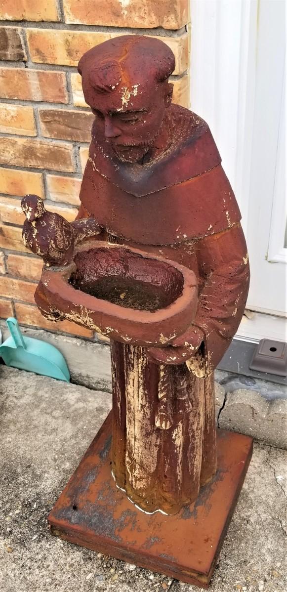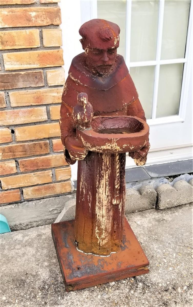 Interesting St. Francis Yard decoration - small birdbath when rain water collects in it - 40" tall. Appears to be made of some sort of hollowed wood fiber. Weathered condition, but still good looking for your garden.