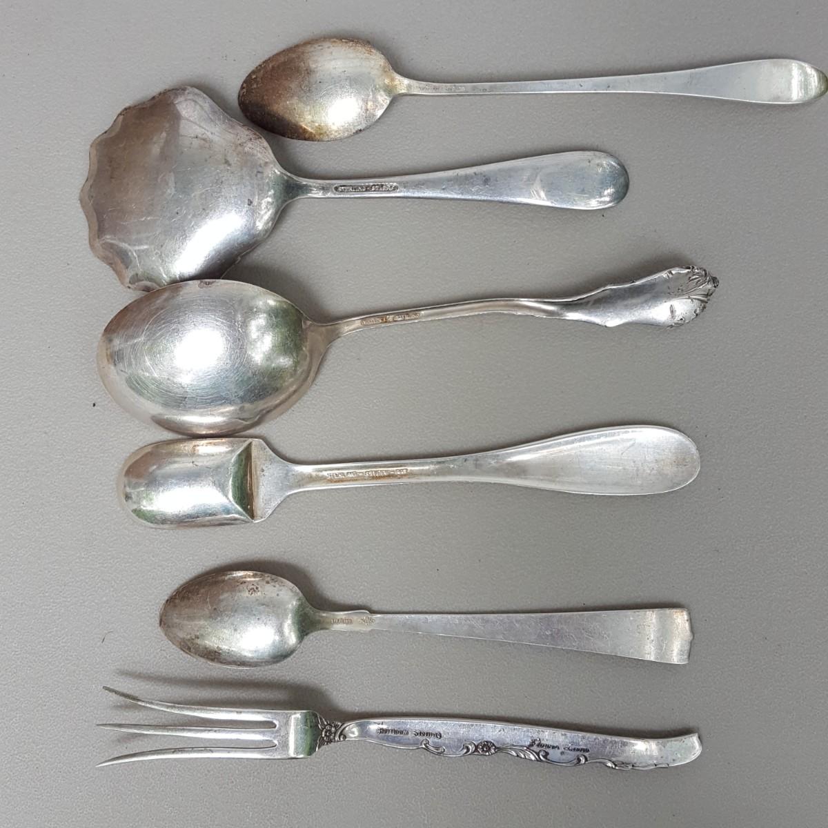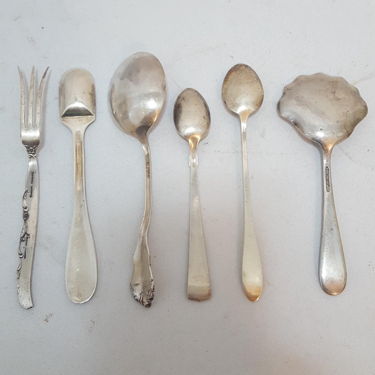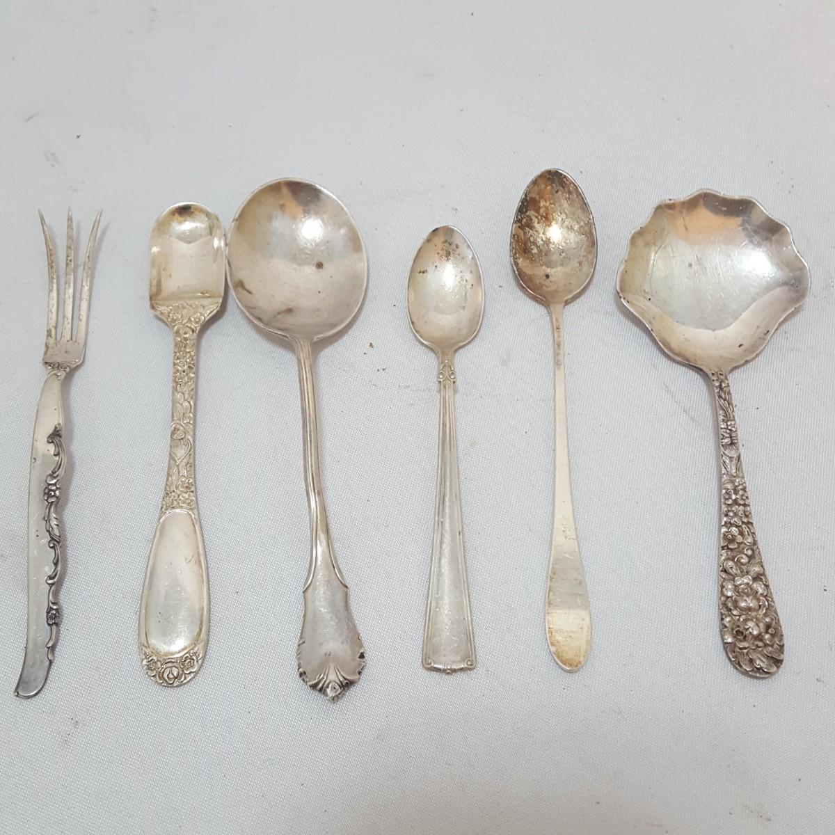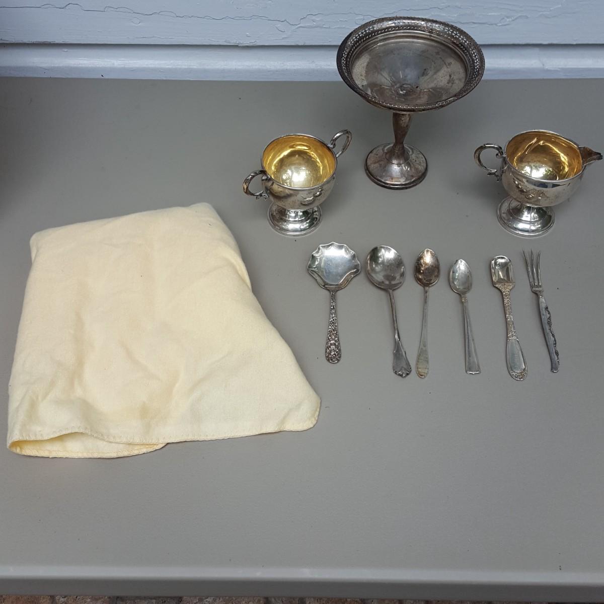 This lot contains 10 Sterling Silver items and more. The lot starts off with a creamer and a sugar bowl measuring 3.5" x 5", a candy bowl measuring 5.5" x6", 5 unique spoons measuring 6", a fork also measuring 6", 5 polishing cloths that are labelled 100% cotton, made in Pakistan. Starting price based on melt value of Sterling.