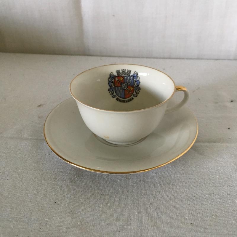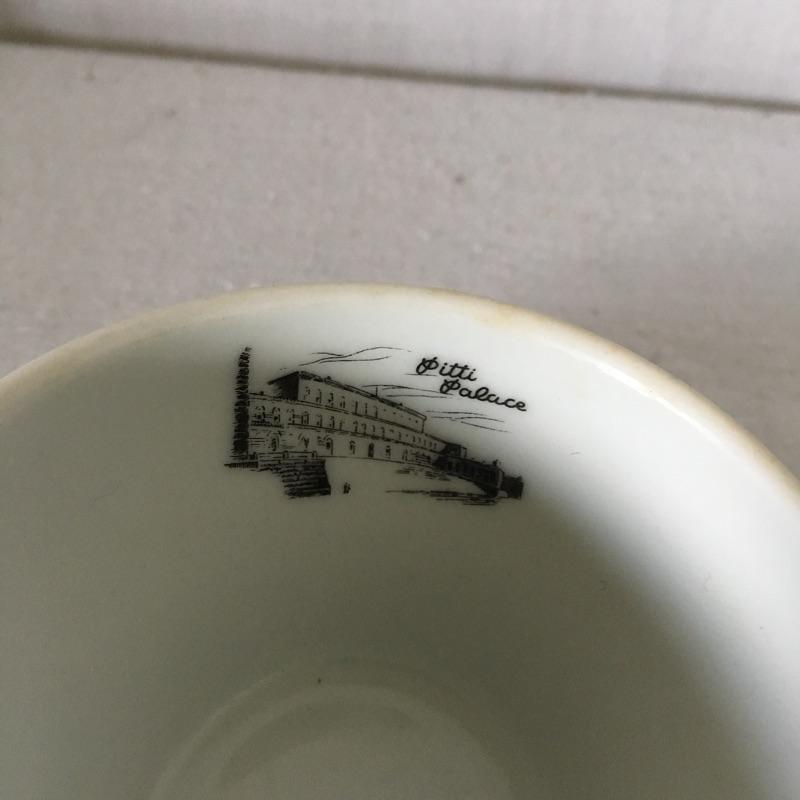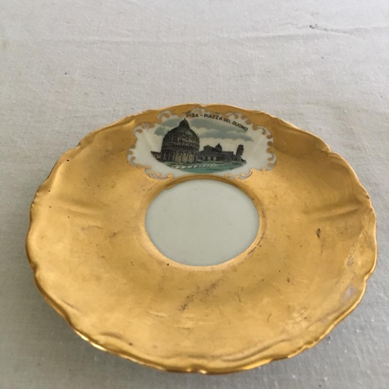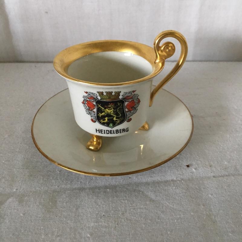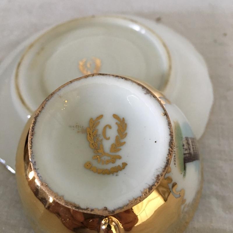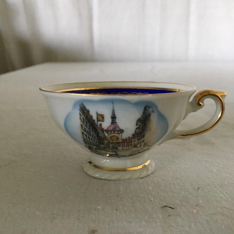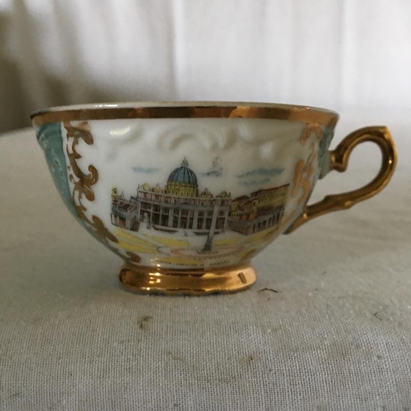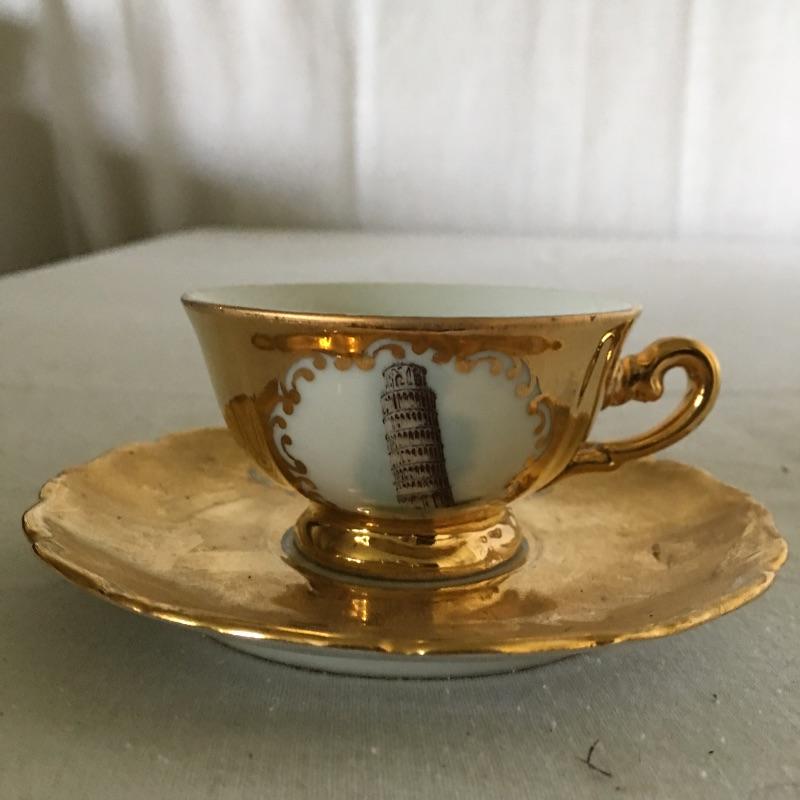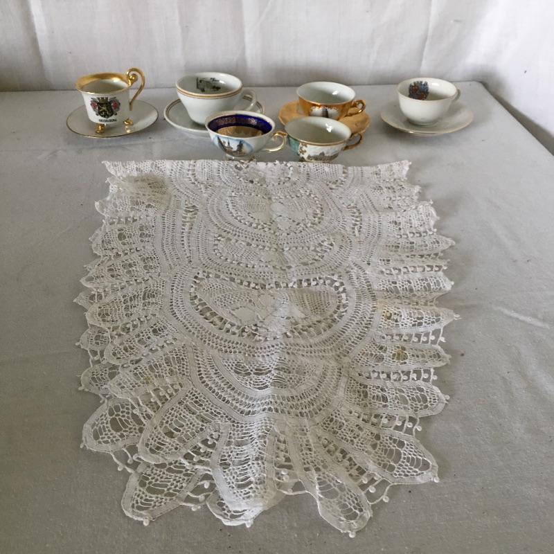 Six teacups, four saucers and one piece of lace. Delicate teacups with places from around the world including Pisa, Heidelberg, Pitti Palace and more. Lace has two small spots, see pictures.