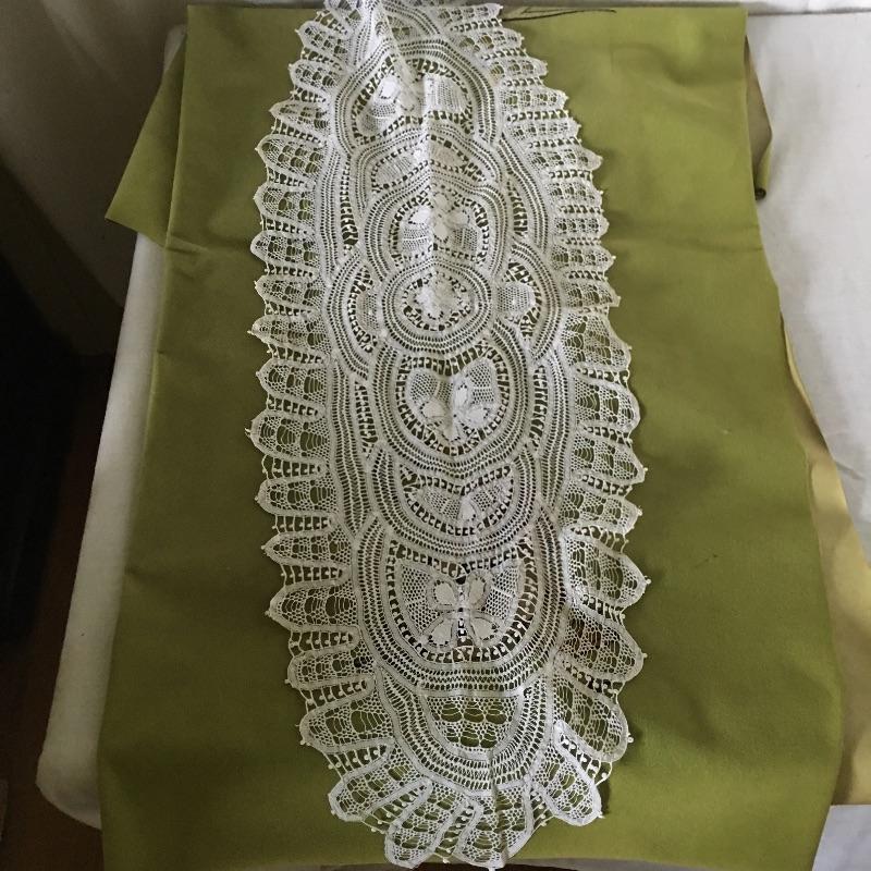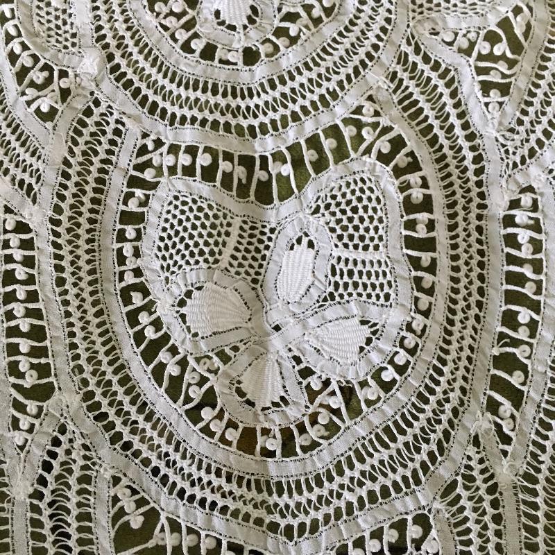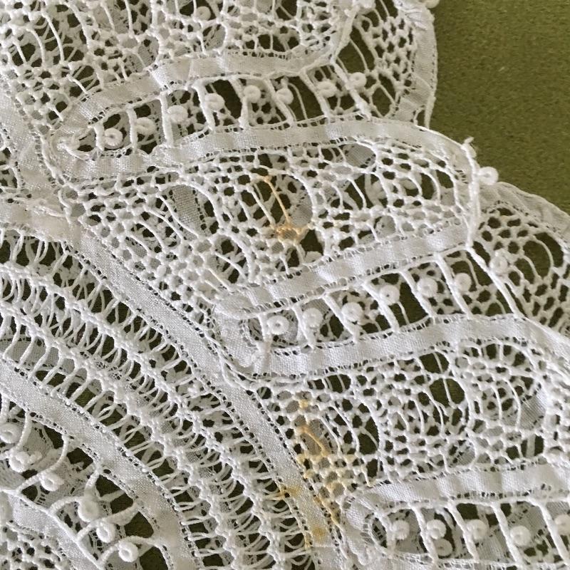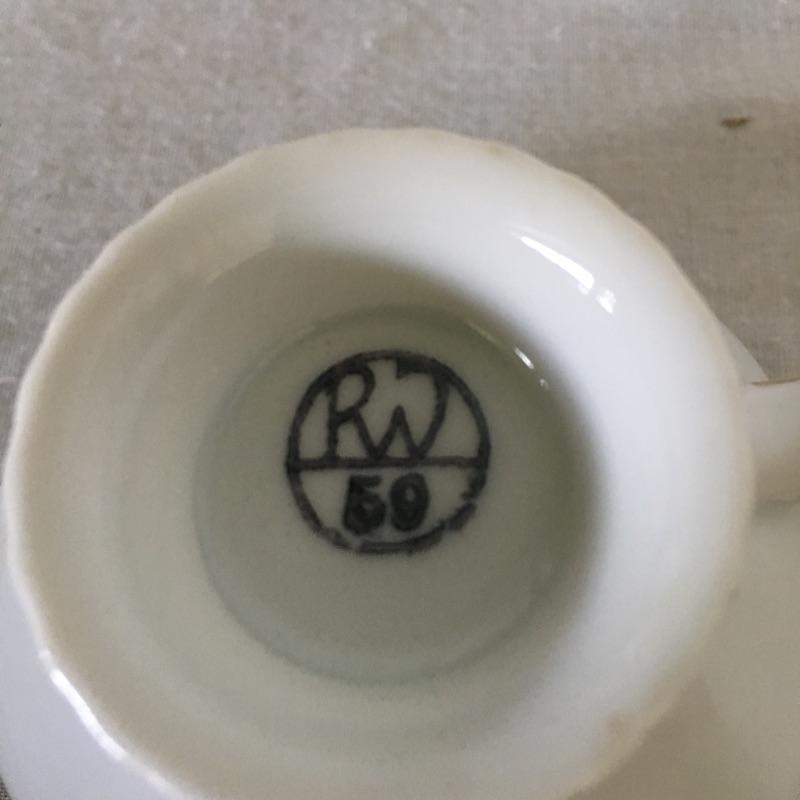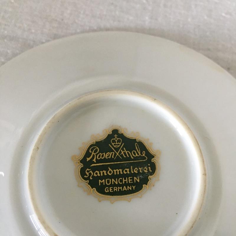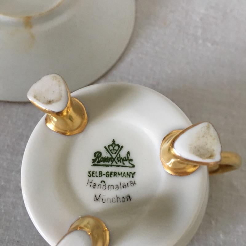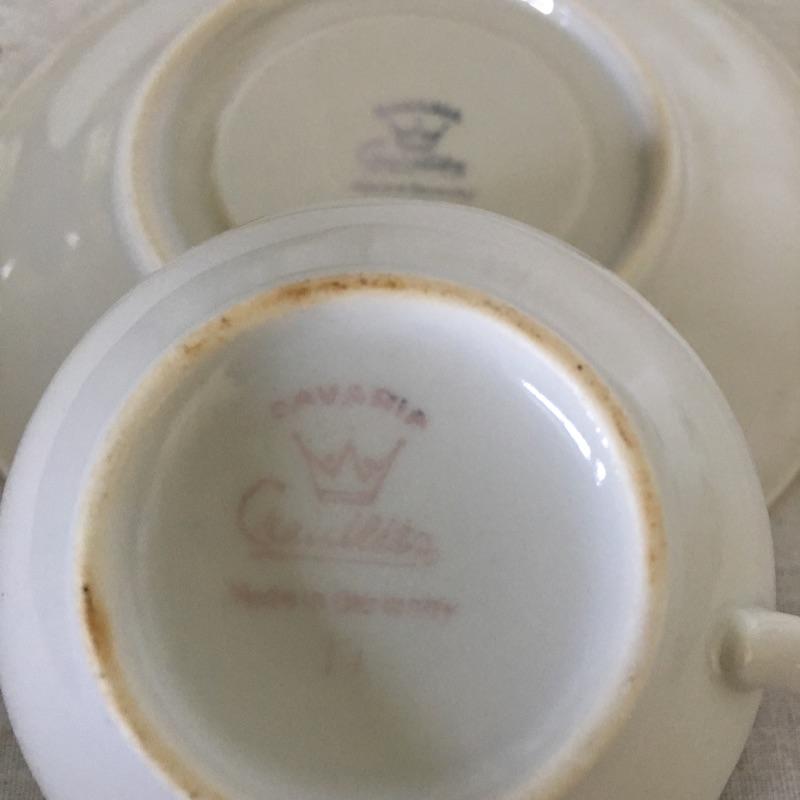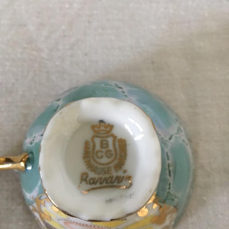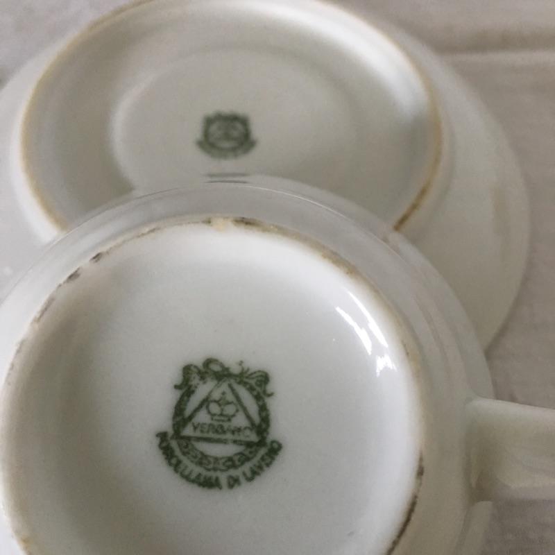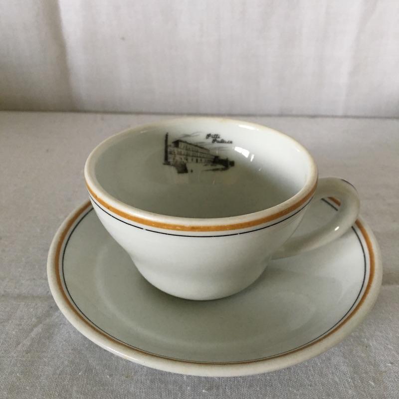 Six teacups, four saucers and one piece of lace. Delicate teacups with places from around the world including Pisa, Heidelberg, Pitti Palace and more. Lace has two small spots, see pictures.