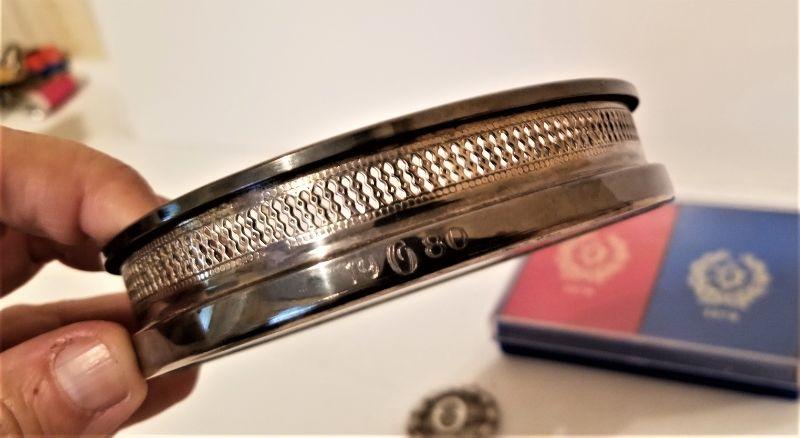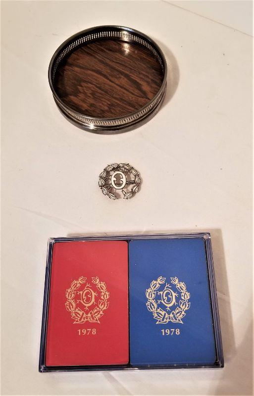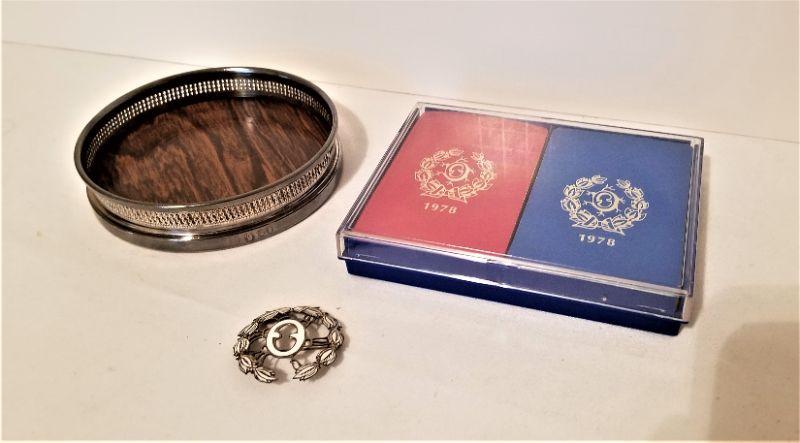 You get all you see here - silverplate Olympians Wine coaster dated 1980 (4.25" across), Sterling Silver/enamel Olympians brooch dates 1973 (2 inches tall), and a Bridge Set (playing cards) dated 1978 (corner of plastic box is chipped).