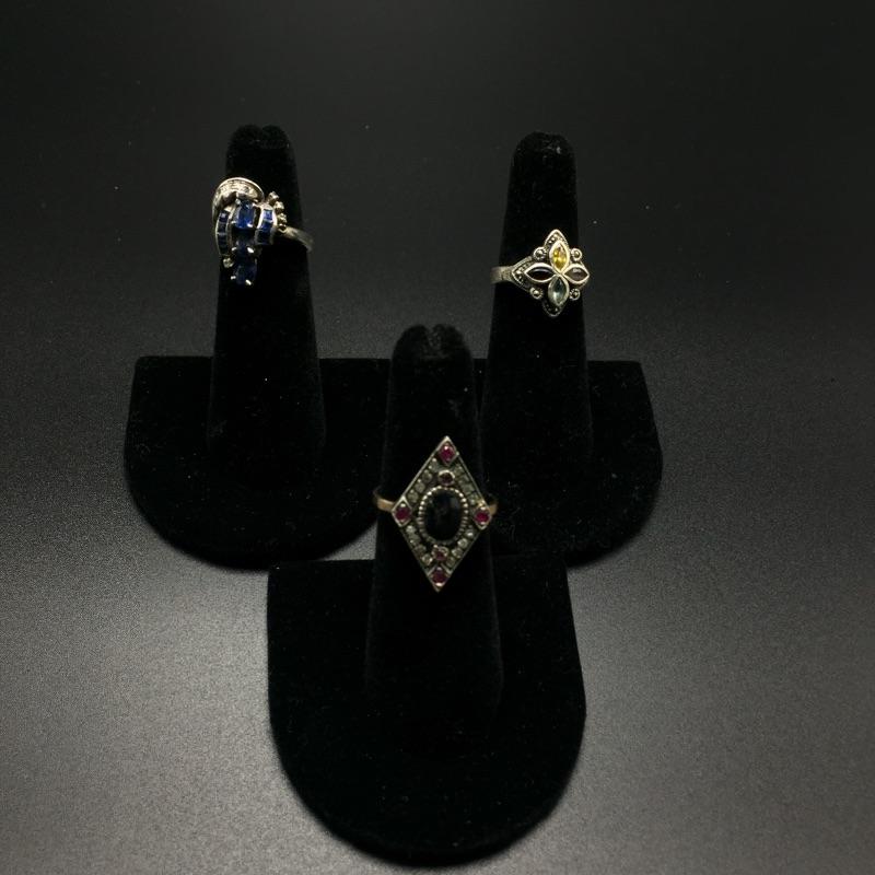 Three rings includes rhombus ring, Star shaped ring and ring with blue stones. See pictures for ring sizes.