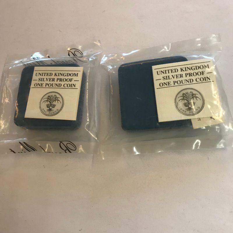 Two UK Silver Proof One Pound Coins. Still in plastic.