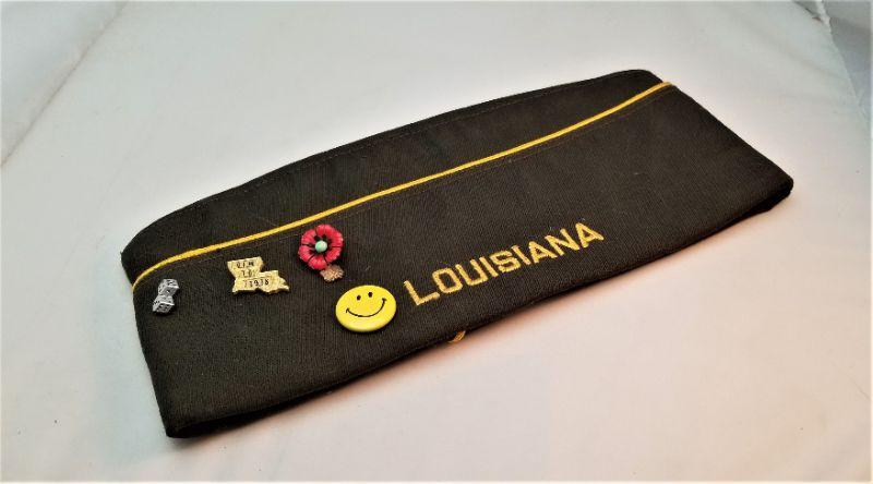 Hardcover book detailing the 6 month South China seas naval tour of the USS O'Brien, which sailed from Long Beach, CA. 128 pages. The Commander was Wm. H.C. Self. Lots of photos of those on board, various activities, detailed tour information, etc. Small print run - scarce. Included is a Veterans of Foreign Wars hat from Louisiana VFW post 3085 with various pins attached. Hat measures 11 inches long.