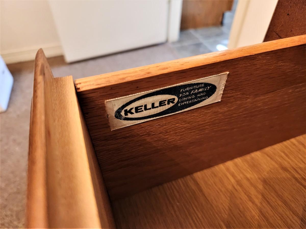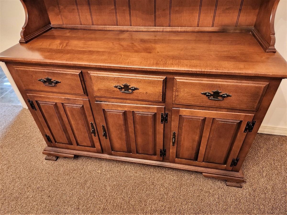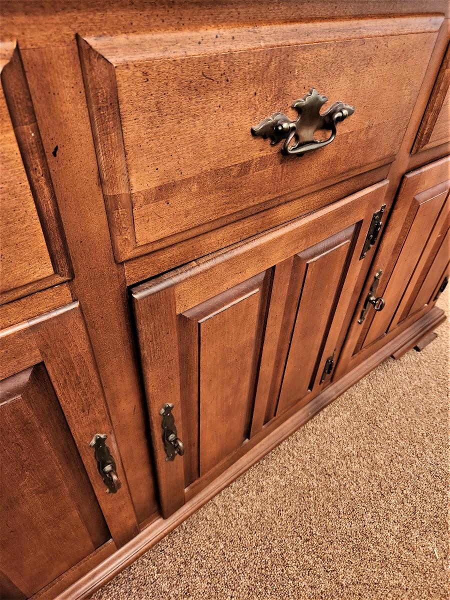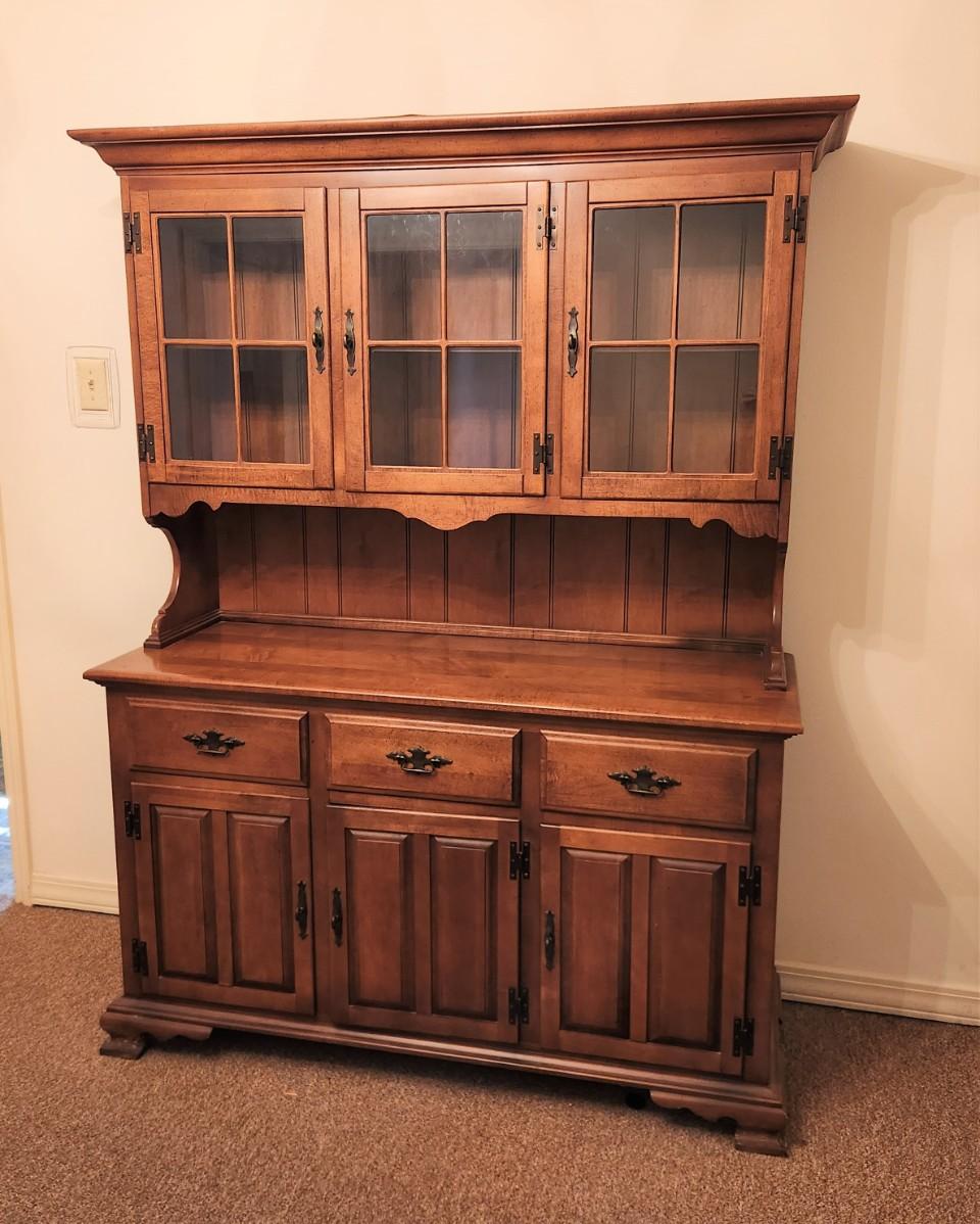 Mid Century KELLER Colonial style China Cabine with Maple finish. 19" deep, 54" across, 60.5" tall. Breaks down into 2 pieces. Lots of storage here. Note: Middle door at bottom "stick's" a bit.