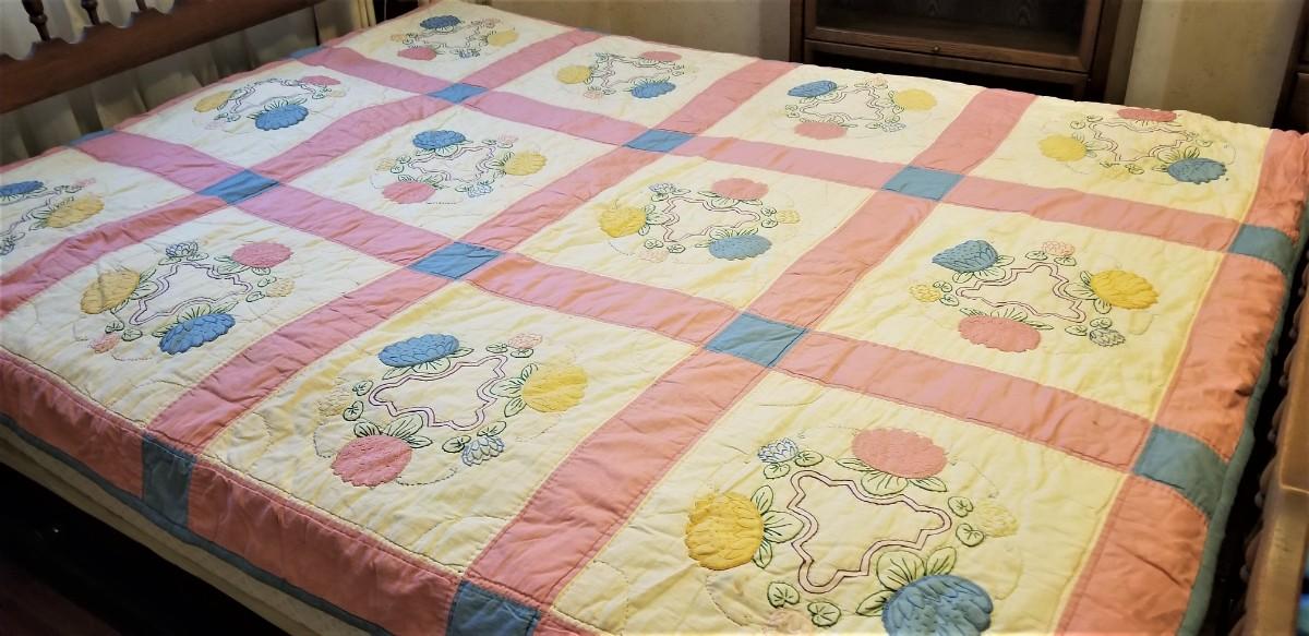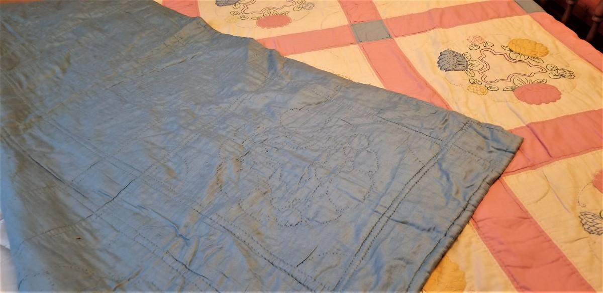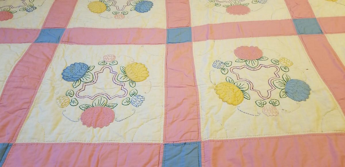 Another great vintage quilt - handsewn cotton with floral design. Back is a solid blue. Measures 82" long, 67" wide.