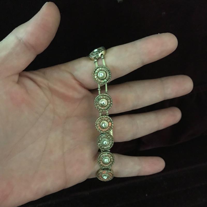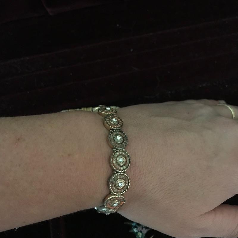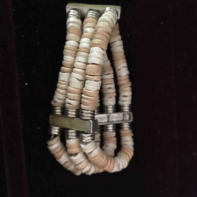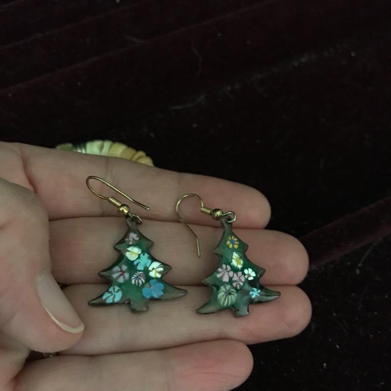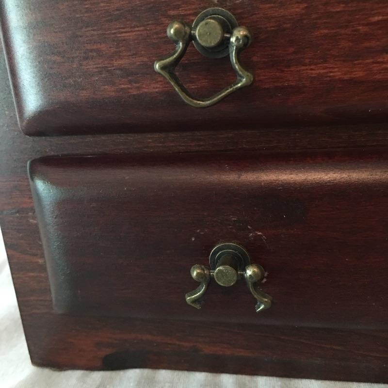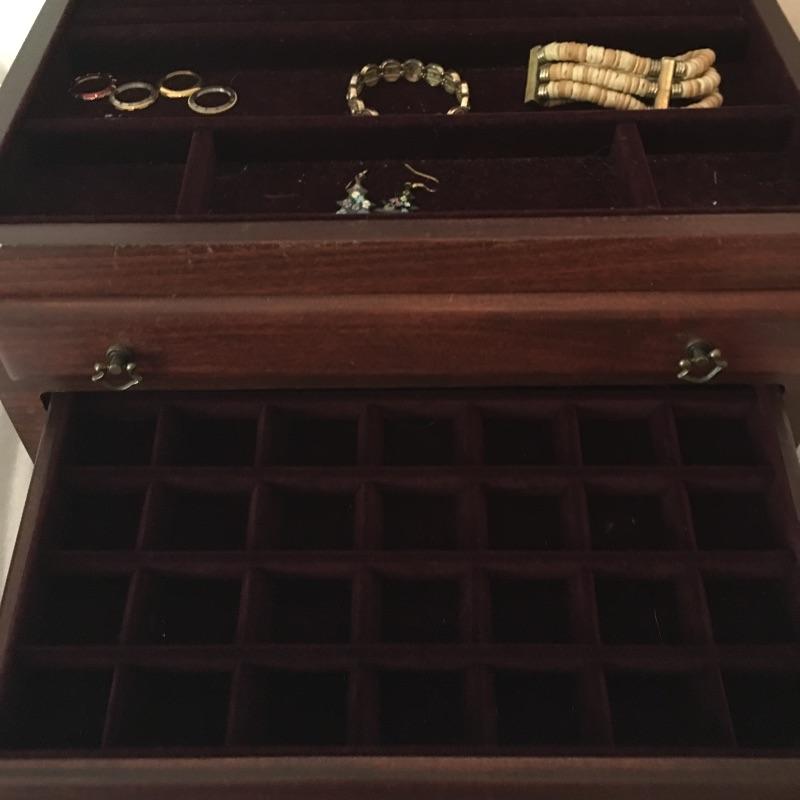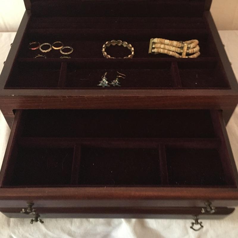 Nice wooden jewelry box comes with a couple of compartment drawers as well as the top storage and includes two elastic bracelets and a pair of earrings. One handle on the bottom drawer is broken but still works fine, see pictures. Box measures 9.5” x 15.25” x 7.25”.
