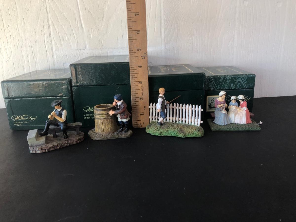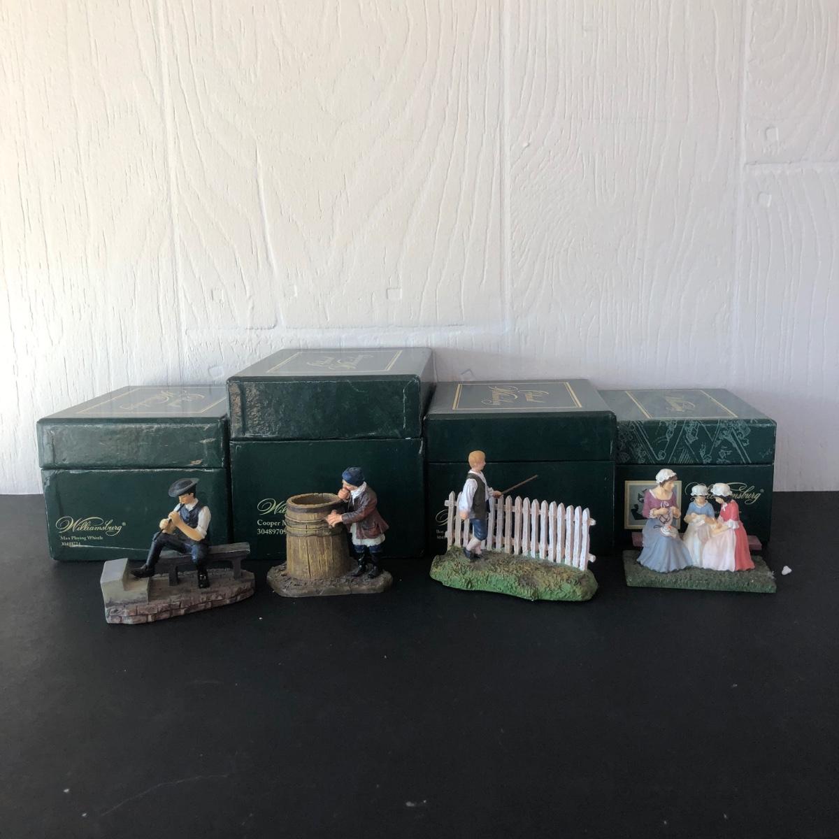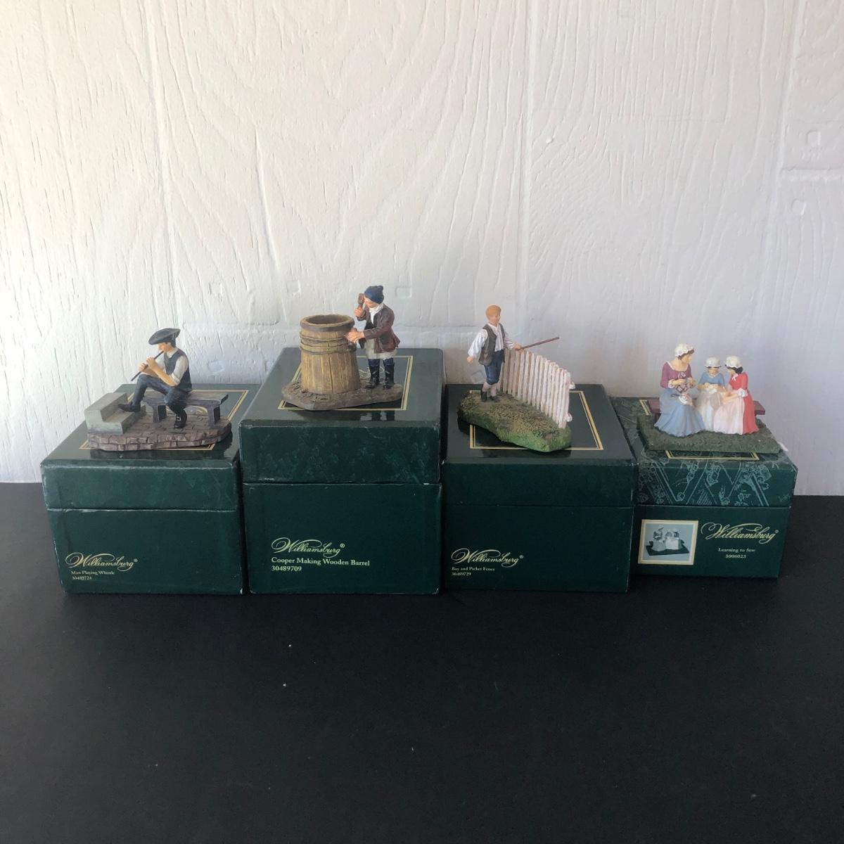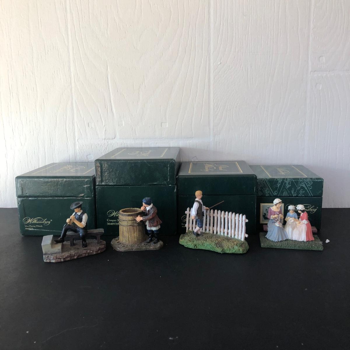LOT 15X: Colonial Williamsburg Collectibles w/ Boxes - 1998 Man Playing Whistle (30489724), 1997 Cooper Making Wooden Barrel (30489709), 1998 Boy & Picket Fence (30489729) & More
