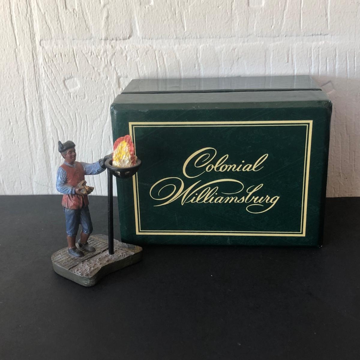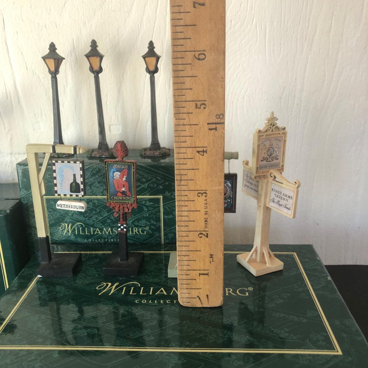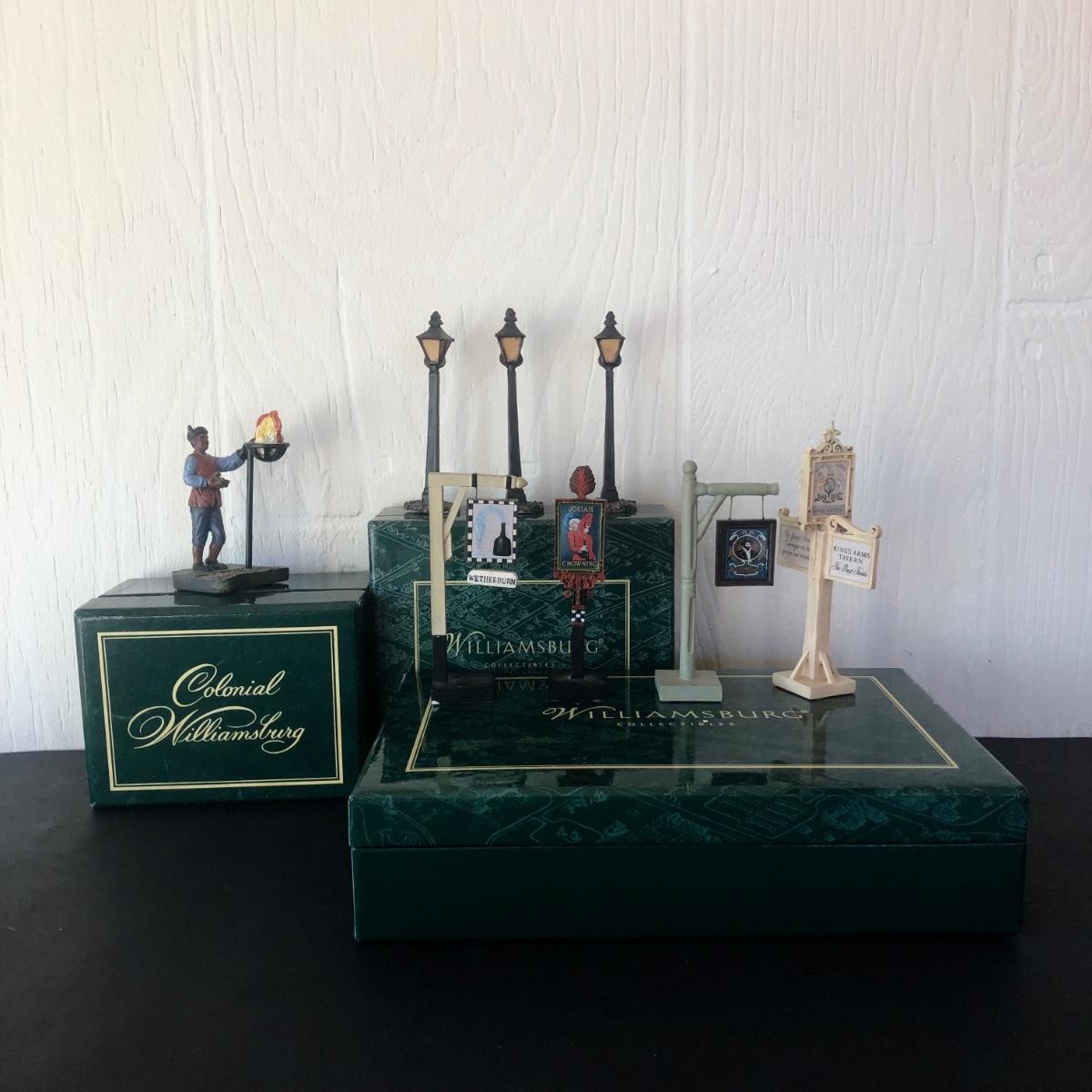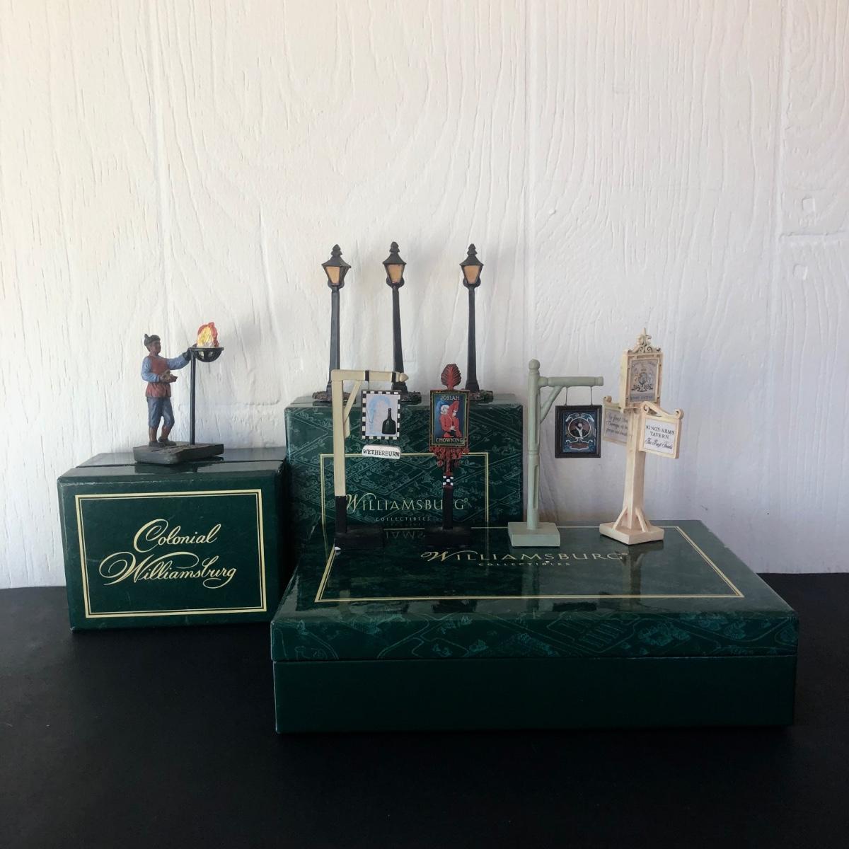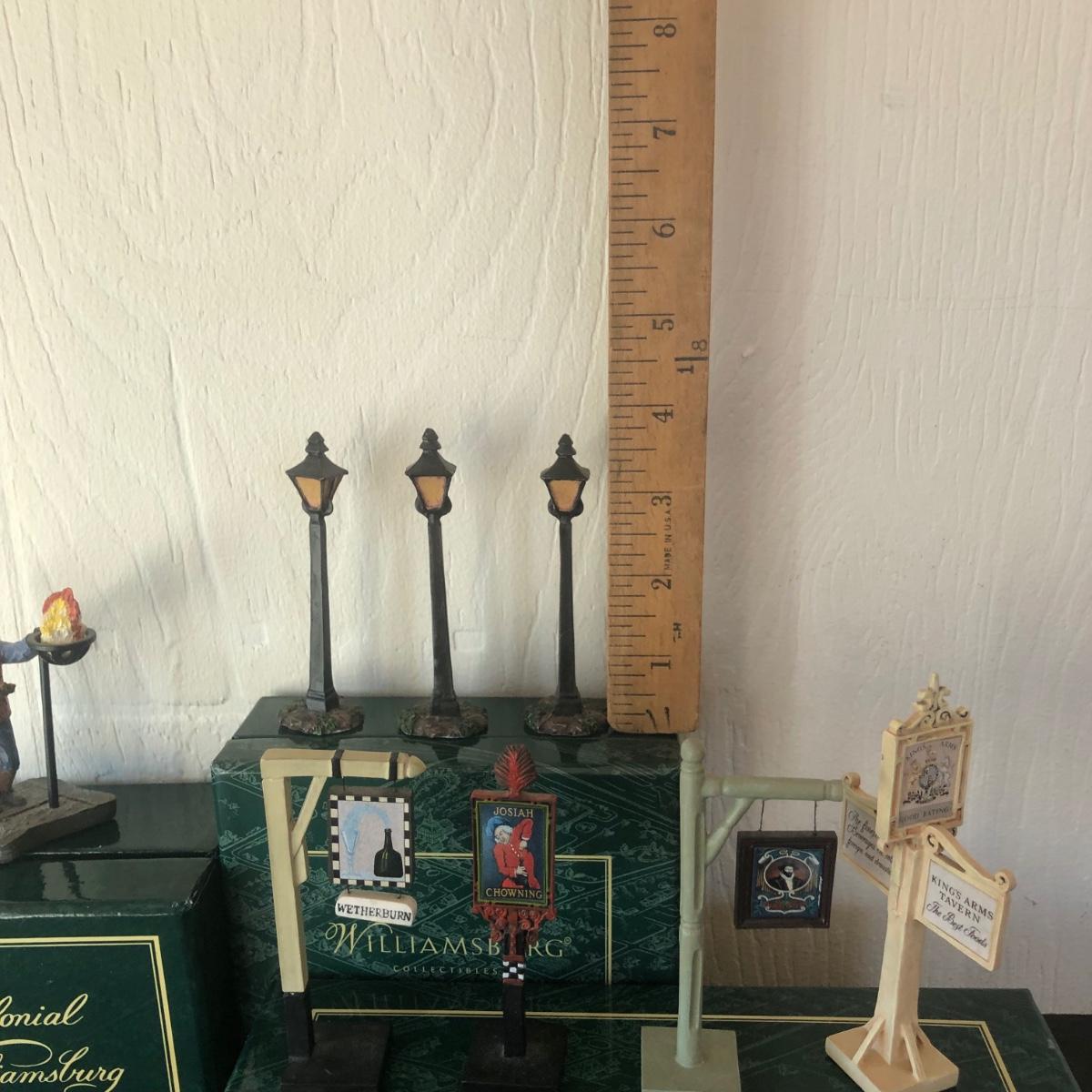 LOT 17X: Colonial Williamsburg Collectibles w/ Boxes - 2002 Lampposts (0506004), 1998 Man Tending Cresset (30489720) & 2004 Tavern Signs (0506013)