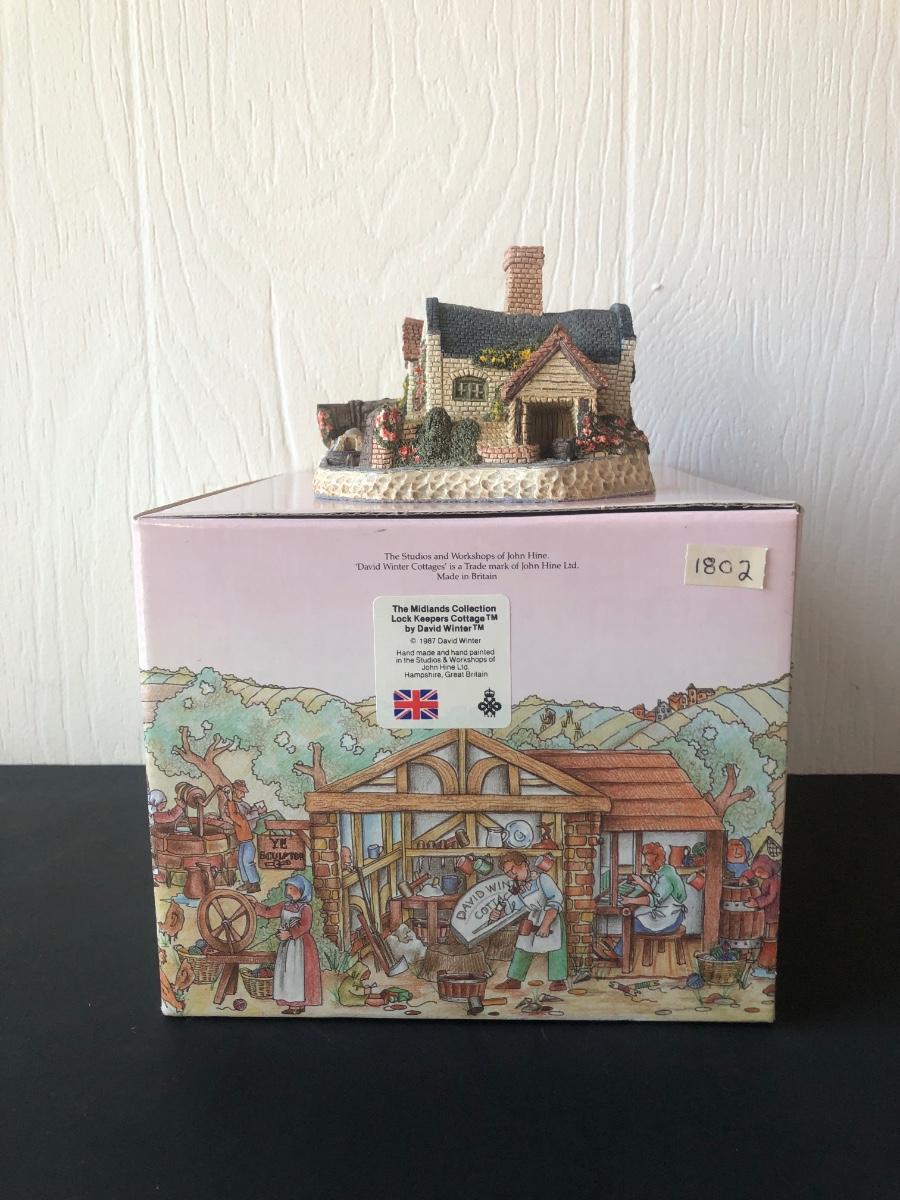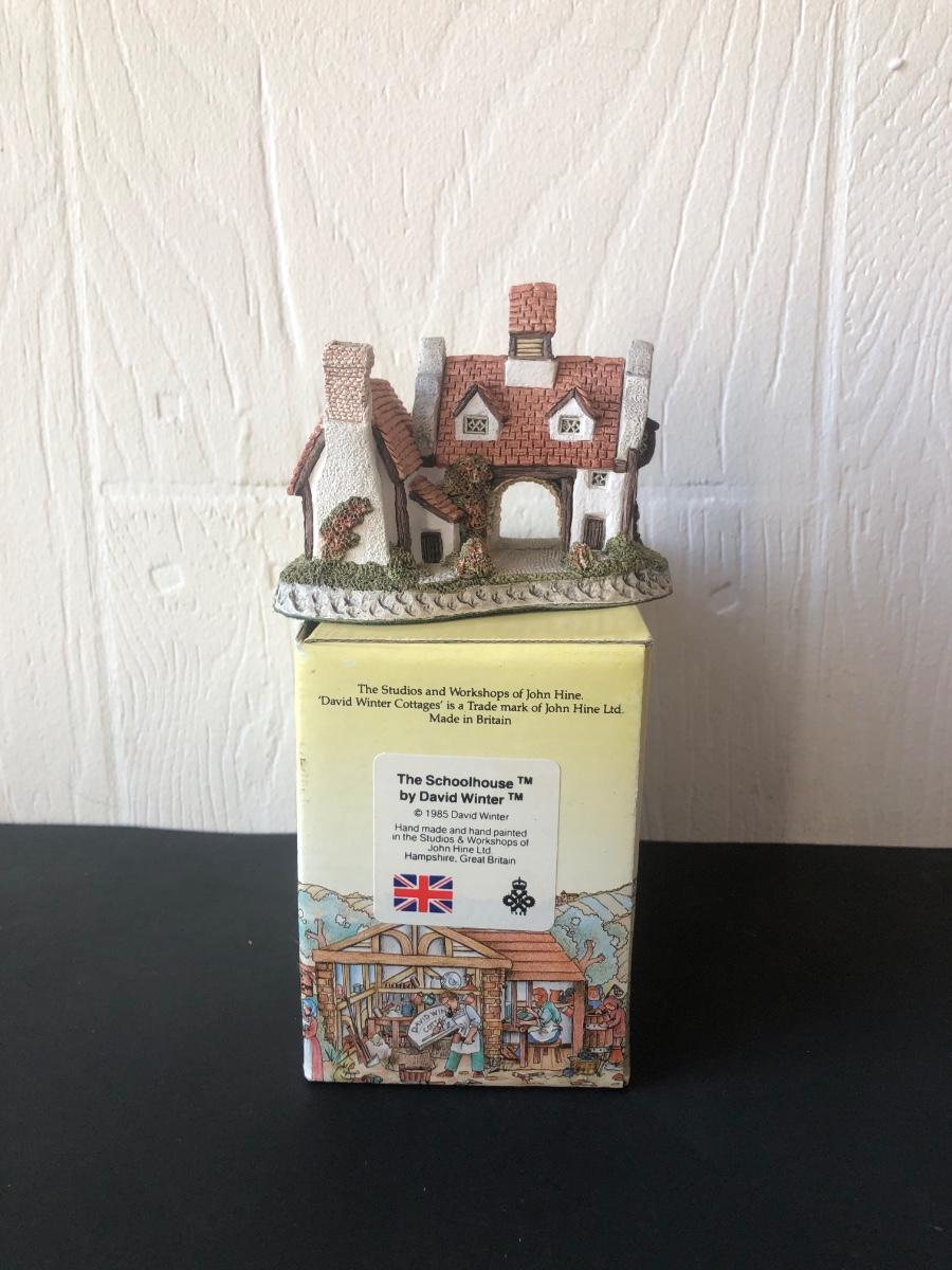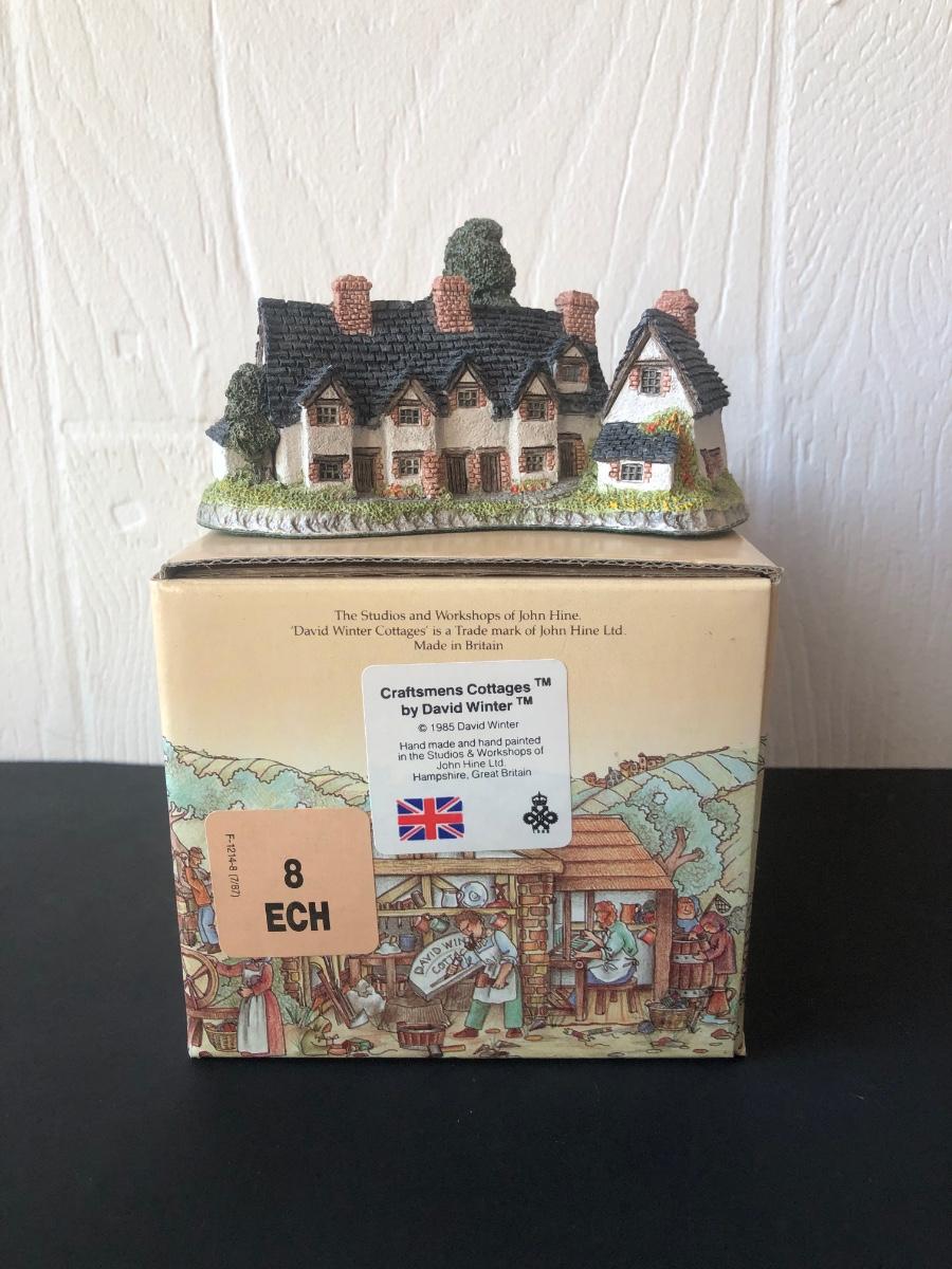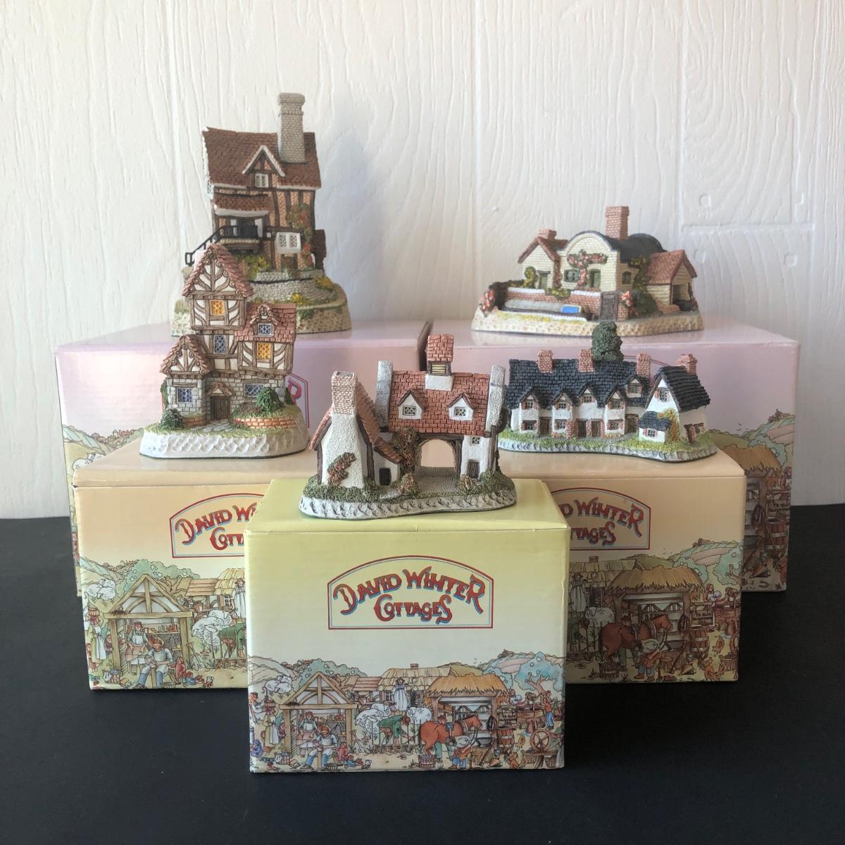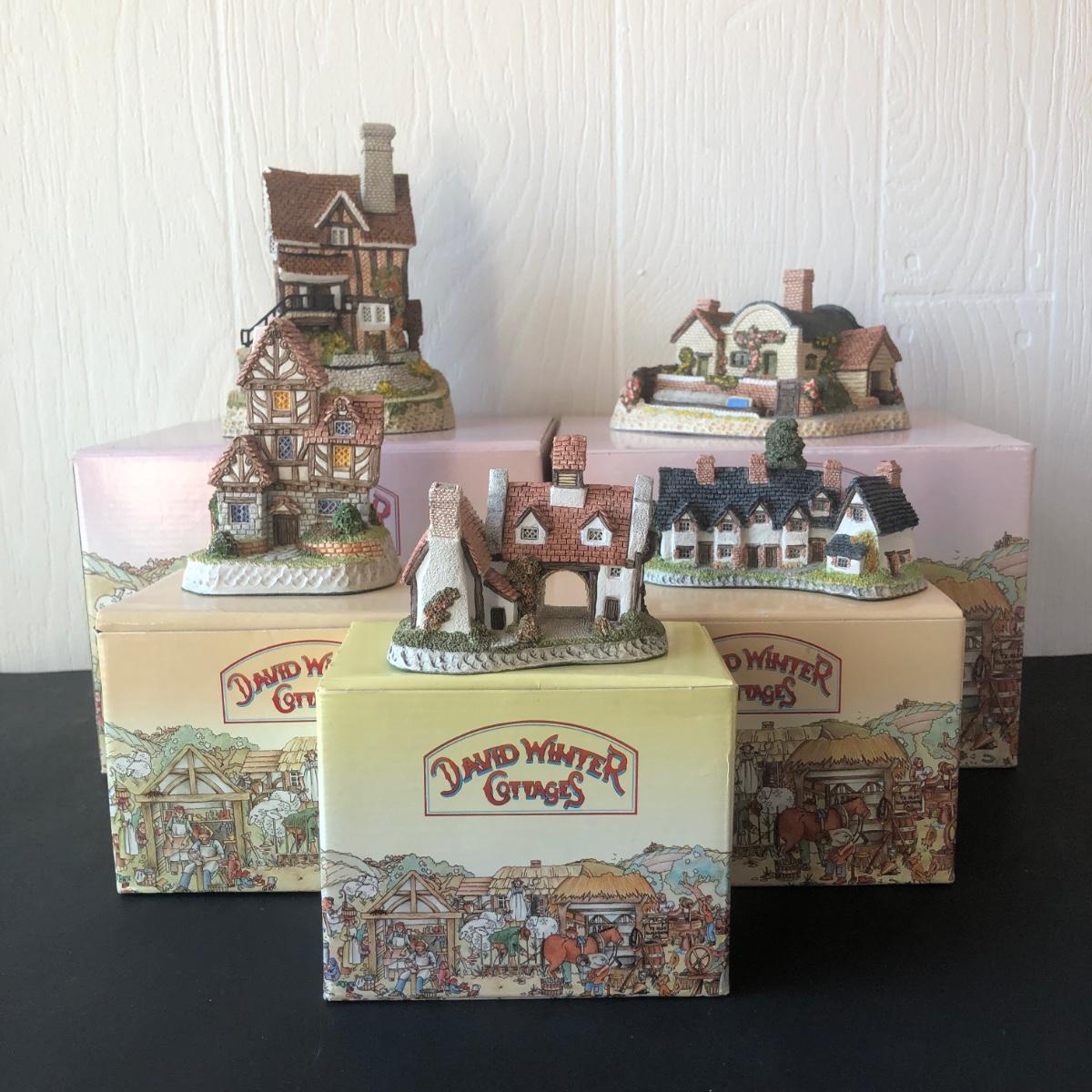 LOT 21X: David Winter Cottages w/ Boxes - 1987 Lace Makers Cottage, 1987 Lock Keepers Cottage, 1993 The Quack's Cottage, 1985 Craftsmens Cottages & 1985 The Schoolhouse