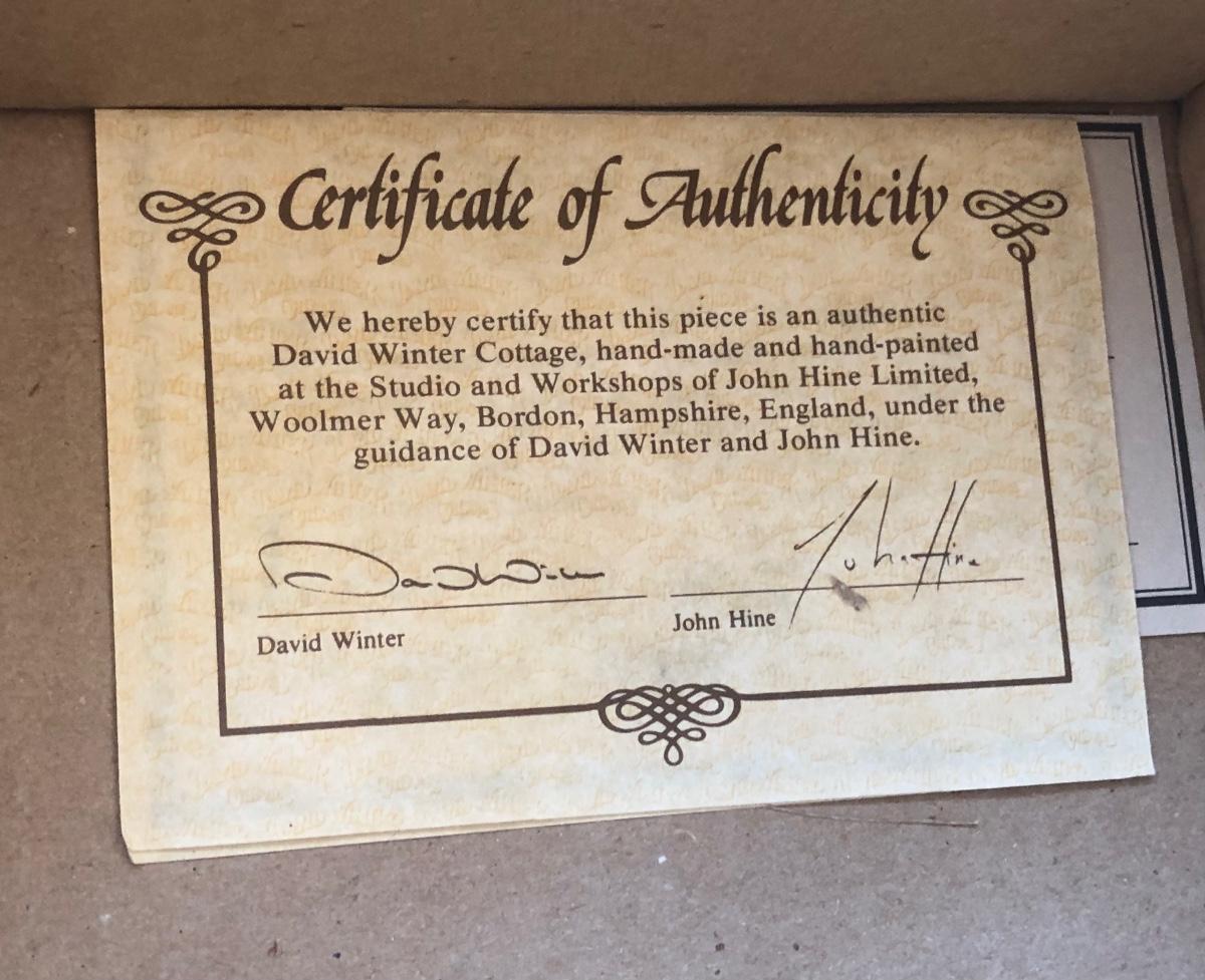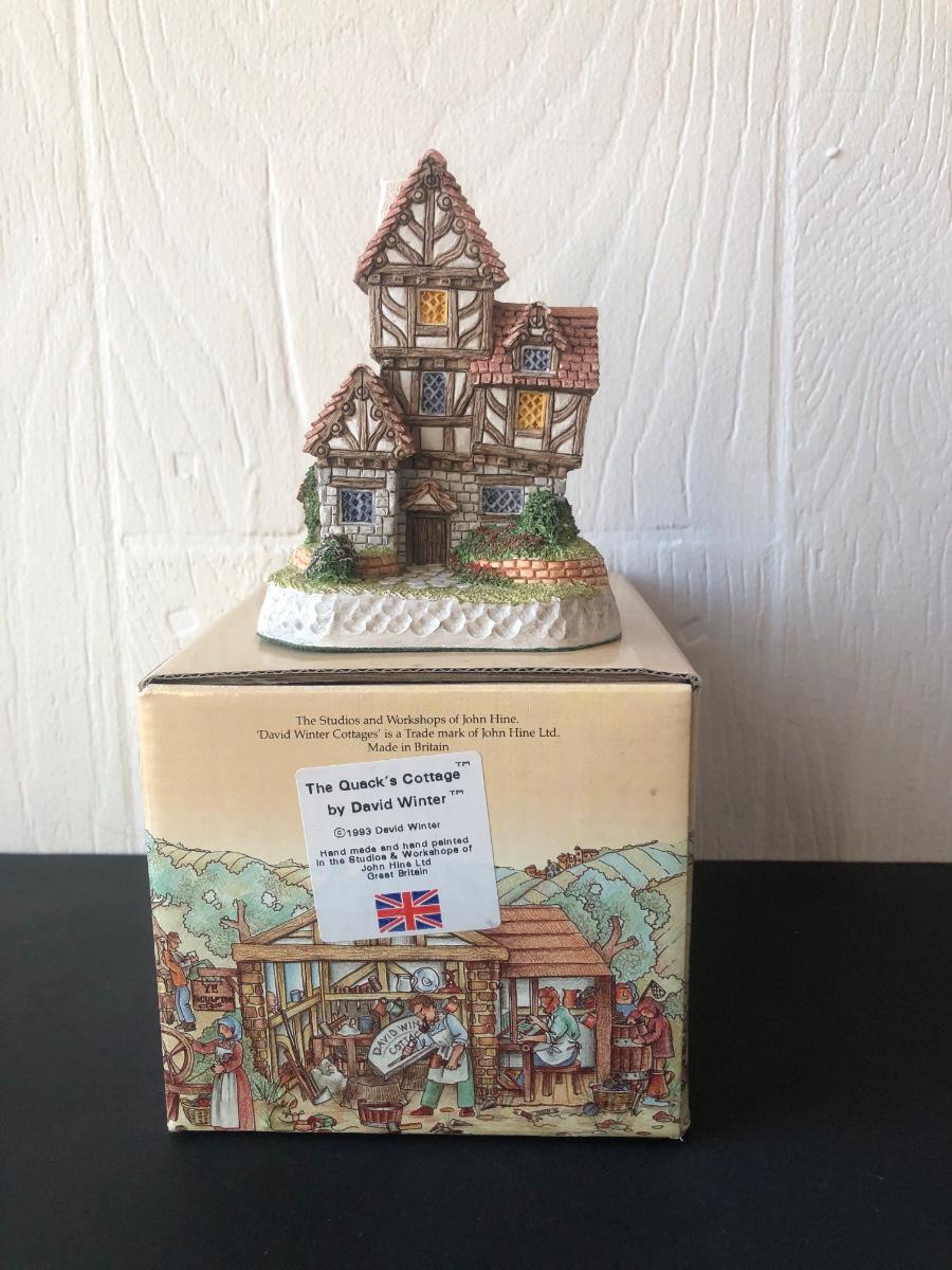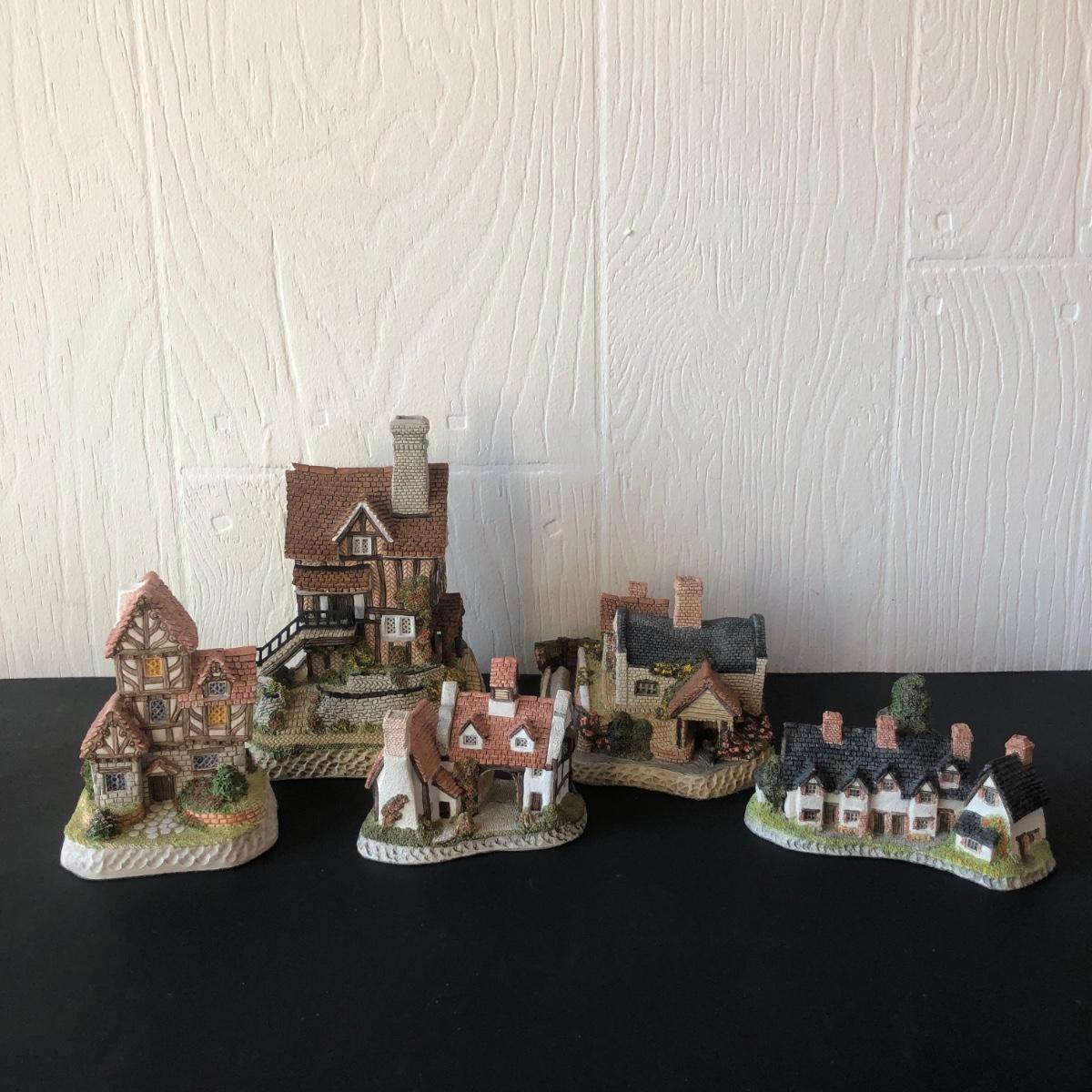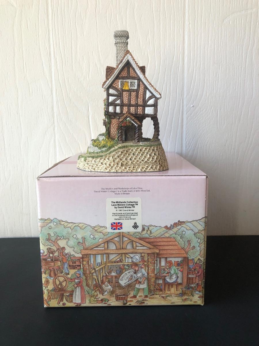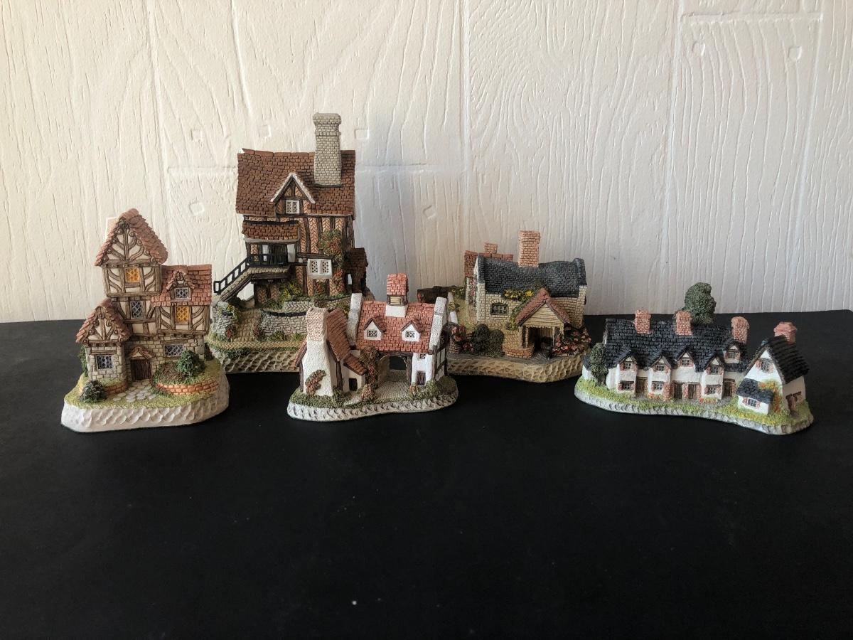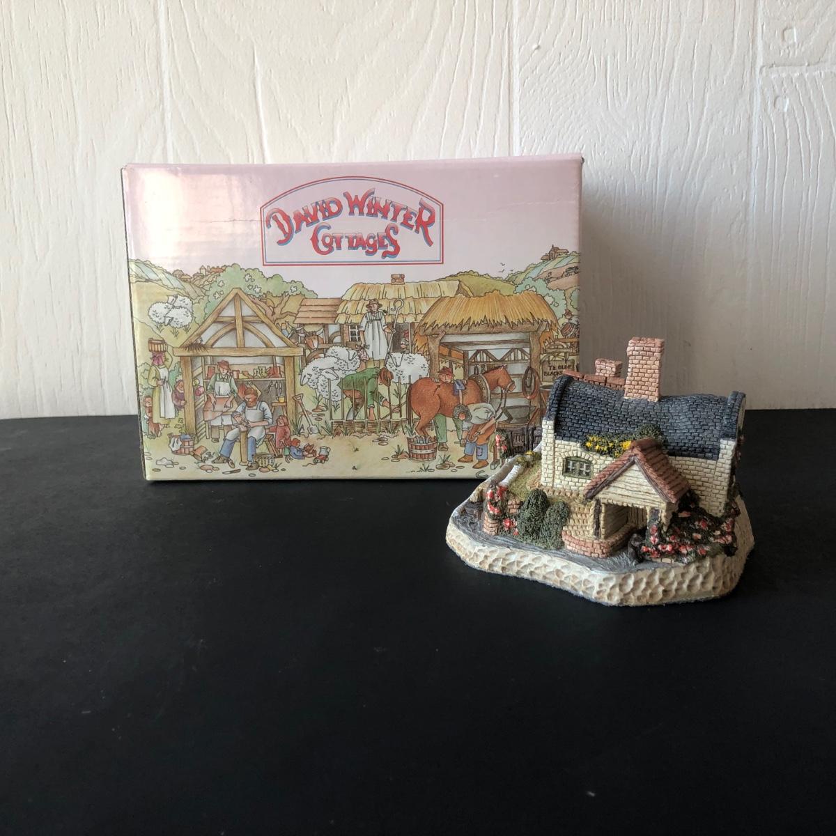 LOT 21X: David Winter Cottages w/ Boxes - 1987 Lace Makers Cottage, 1987 Lock Keepers Cottage, 1993 The Quack's Cottage, 1985 Craftsmens Cottages & 1985 The Schoolhouse