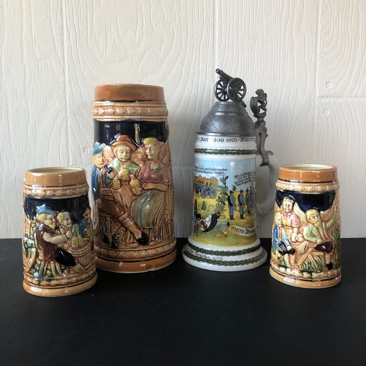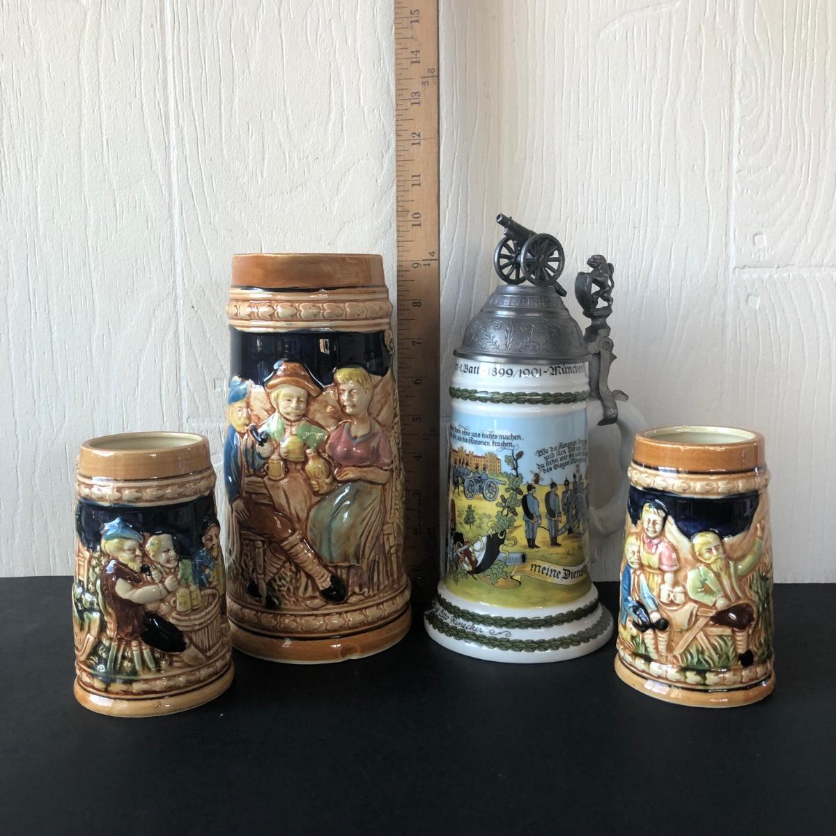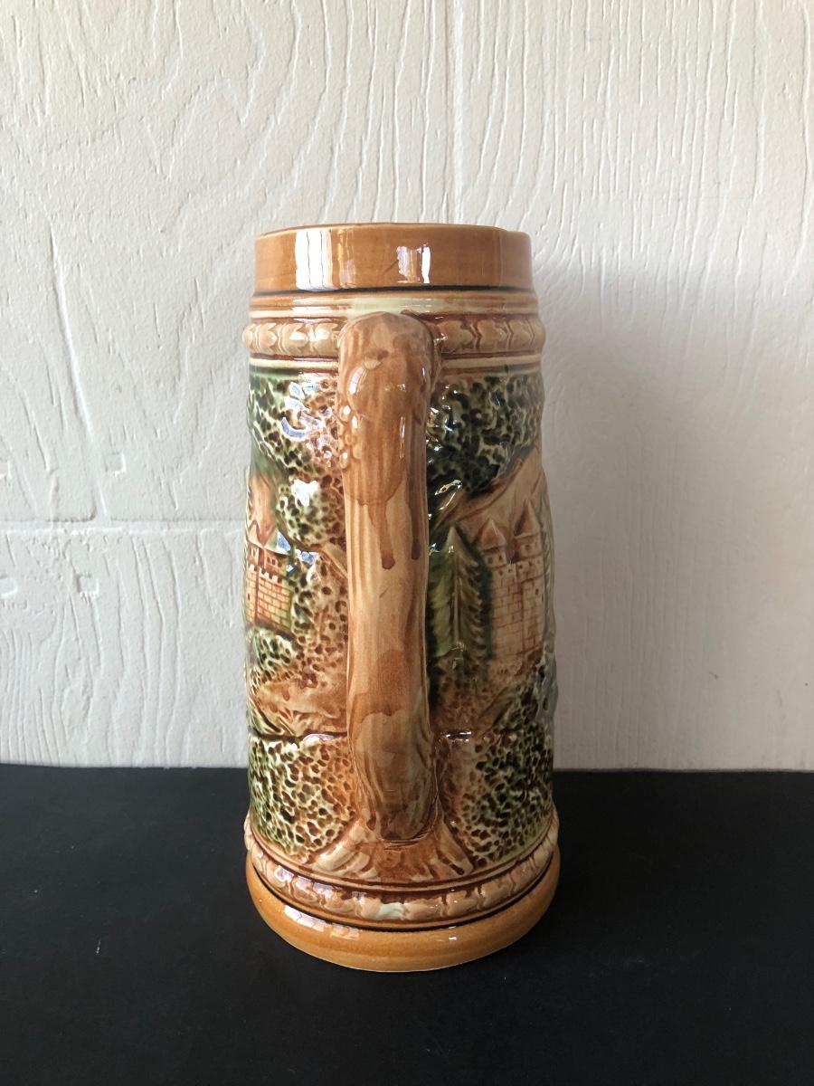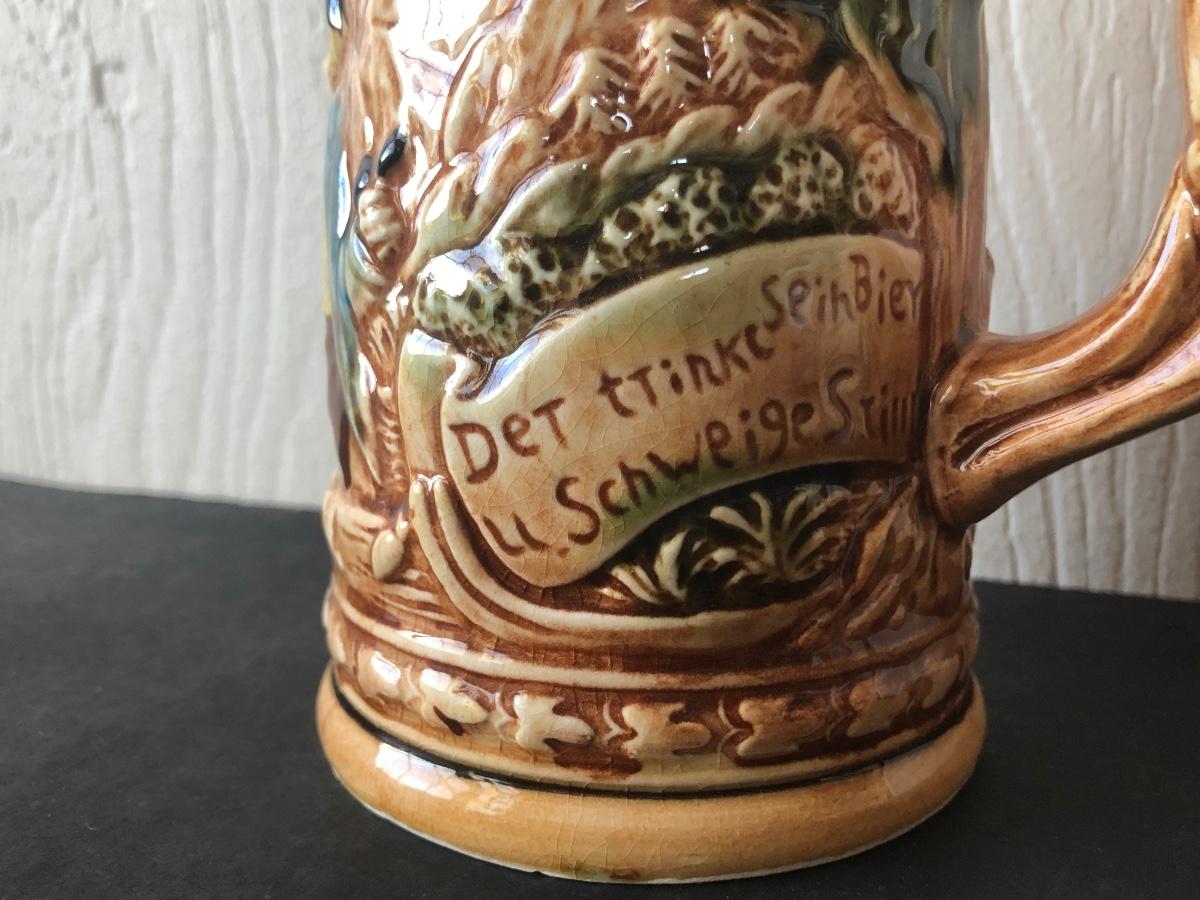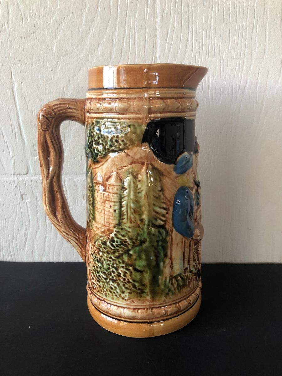 LOT 50L: Ceramic Stein w/ Canon Lid & Majolica Style Pitcher and Steins