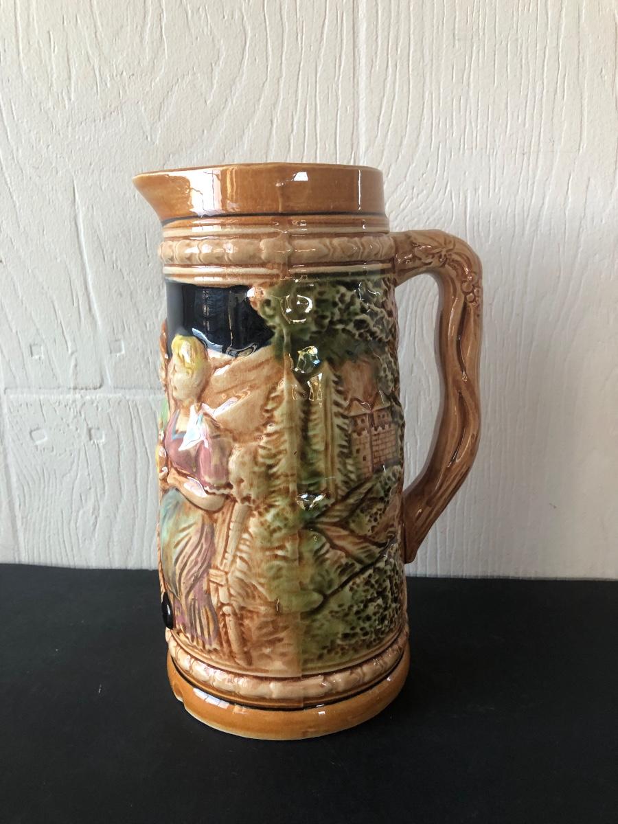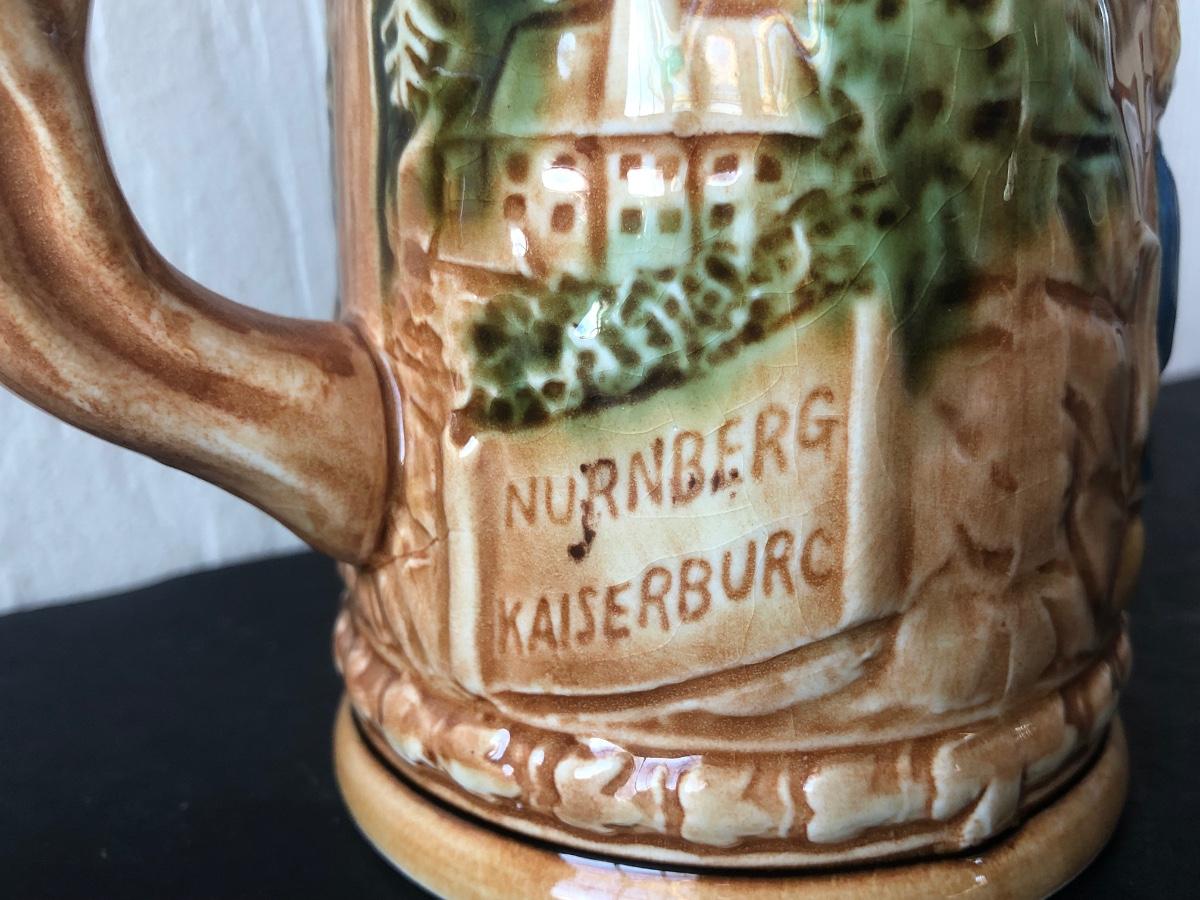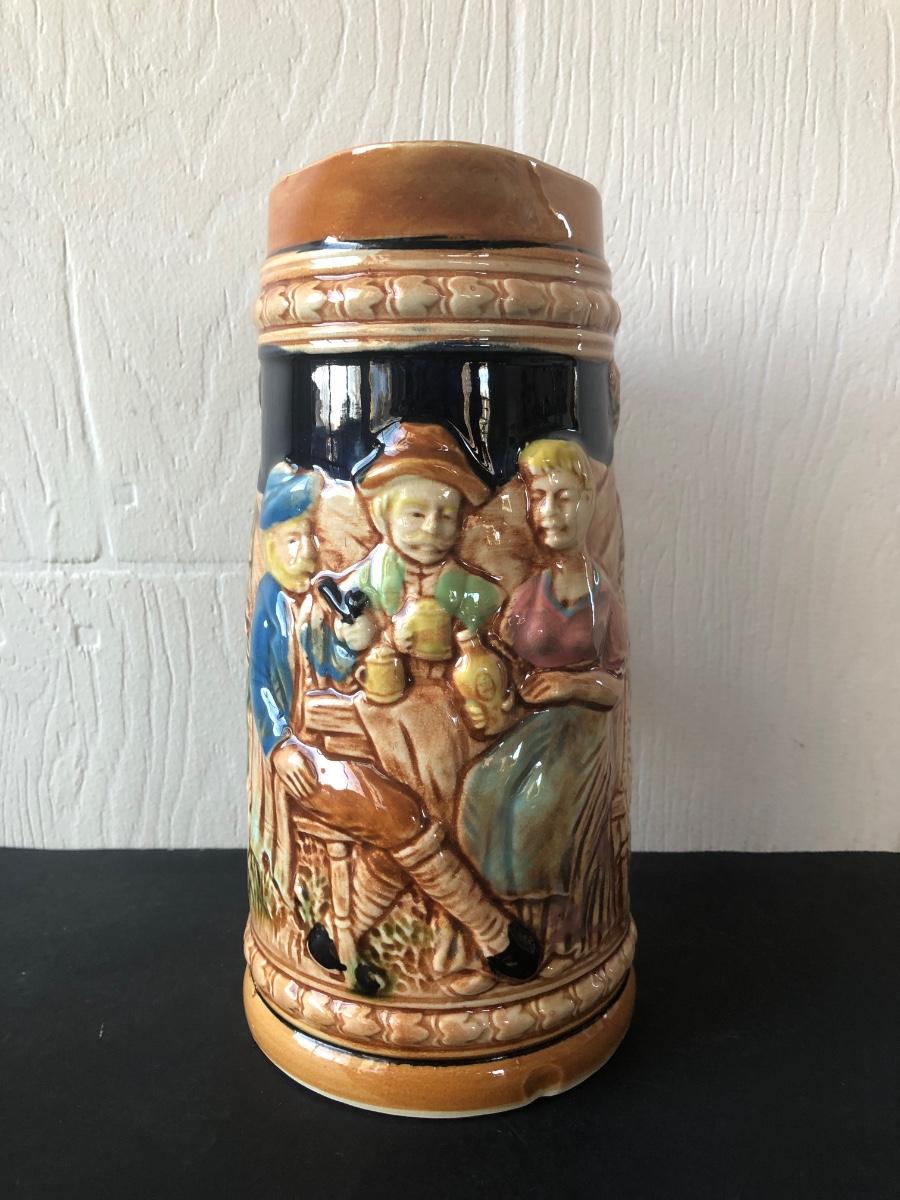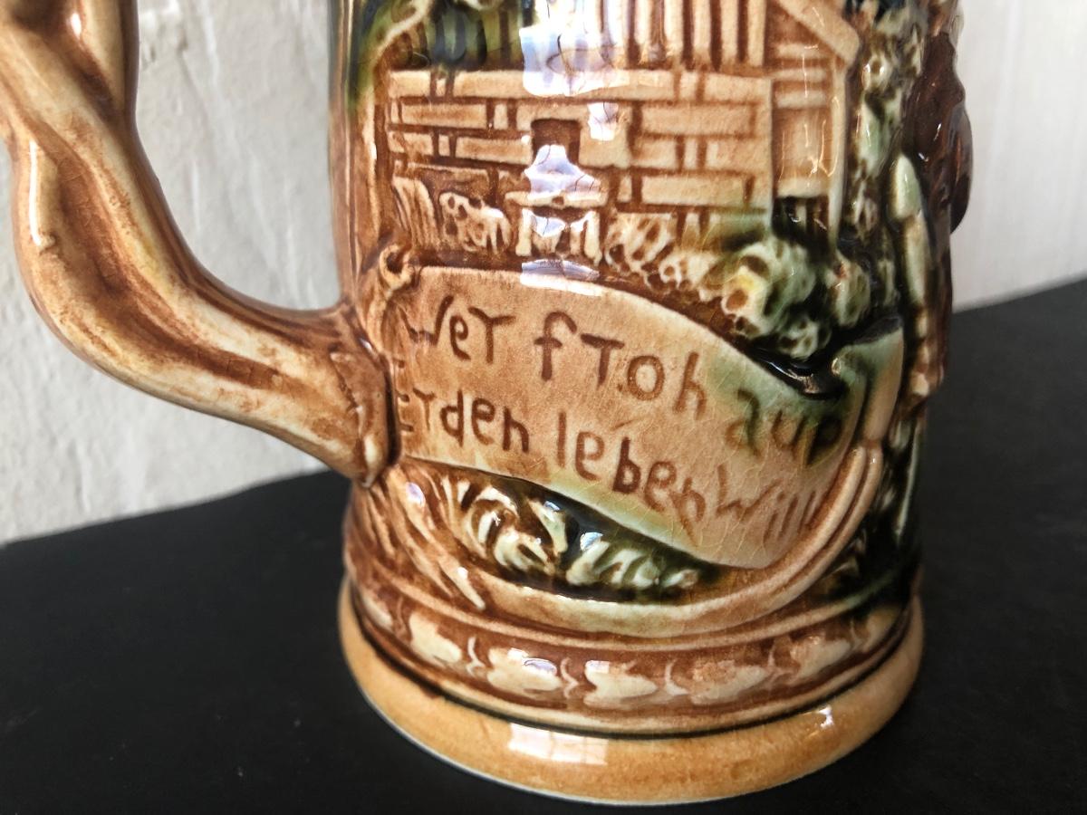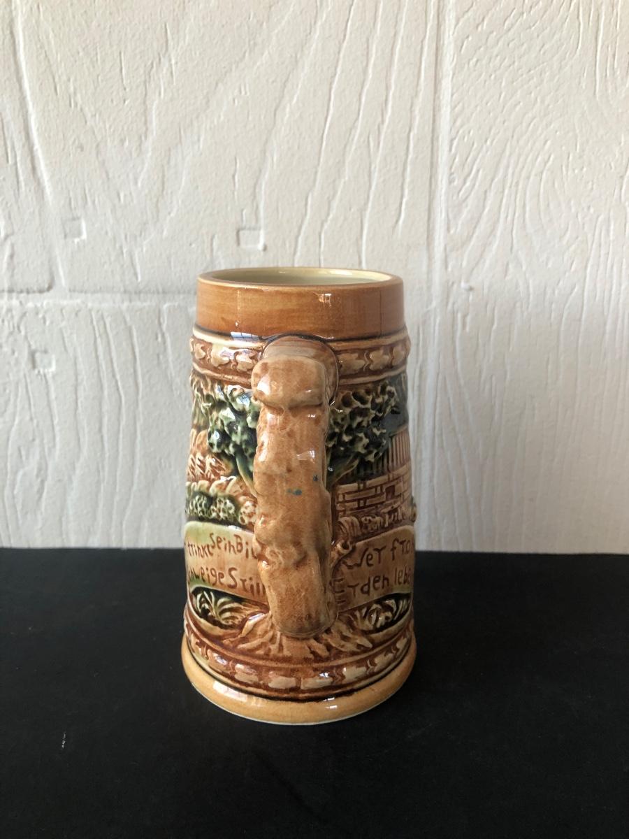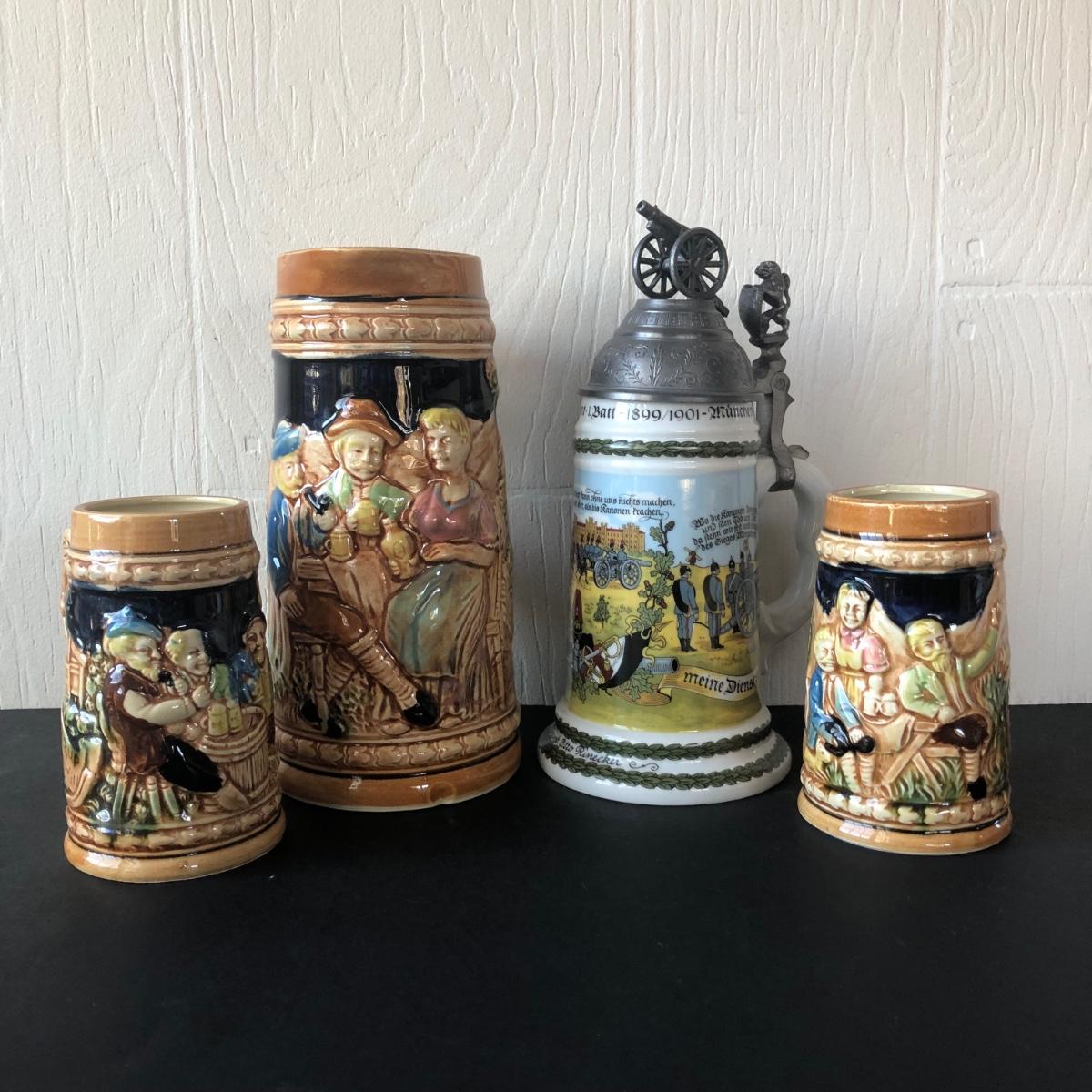LOT 50L: Ceramic Stein w/ Canon Lid & Majolica Style Pitcher and Steins