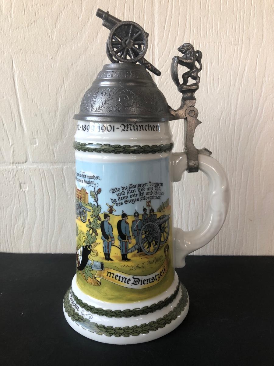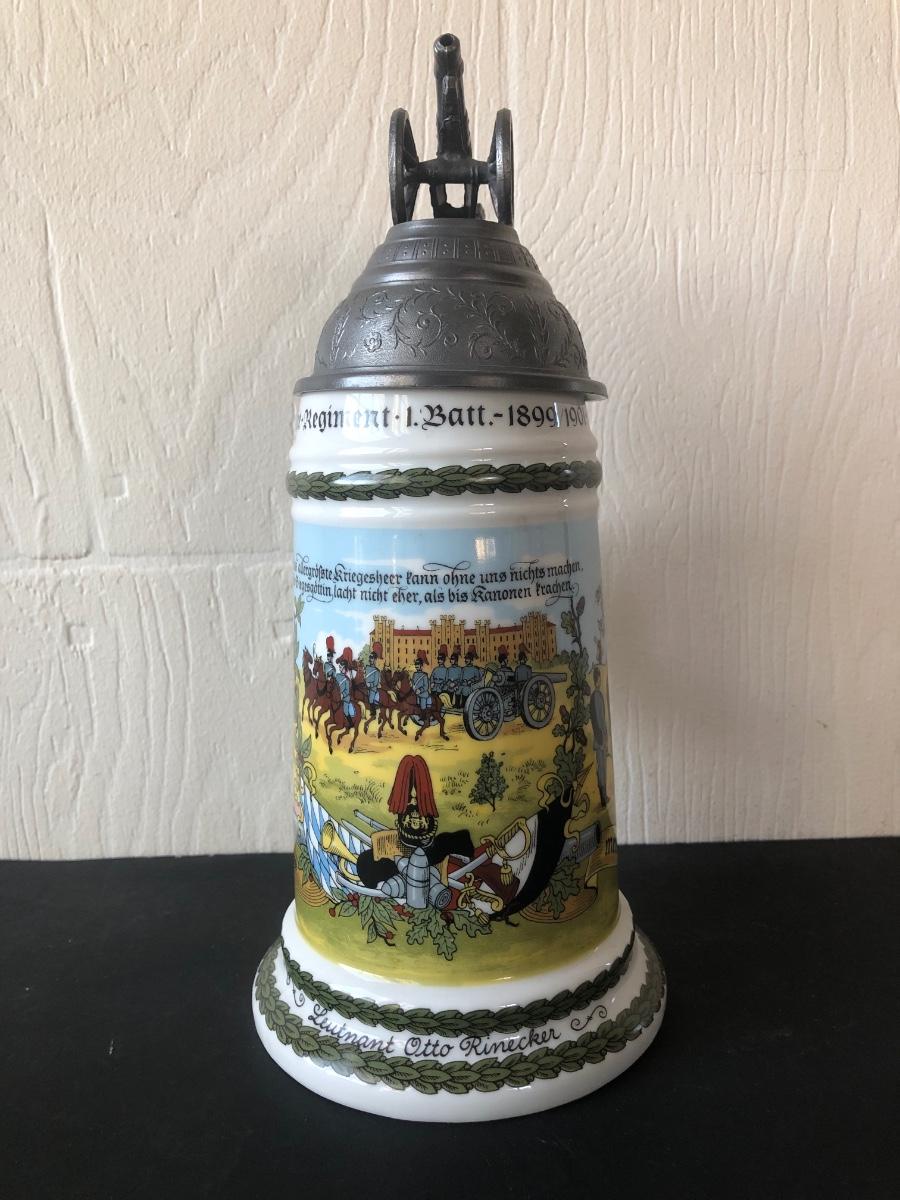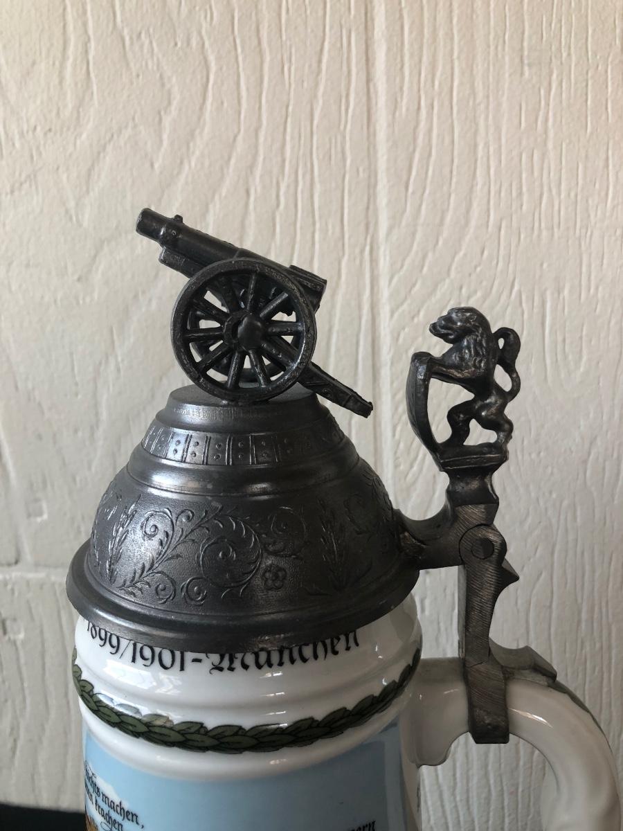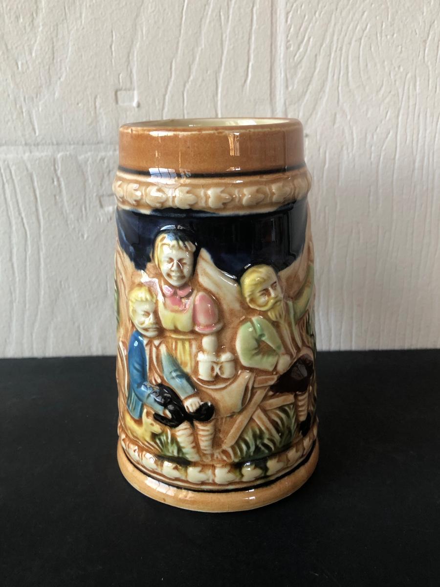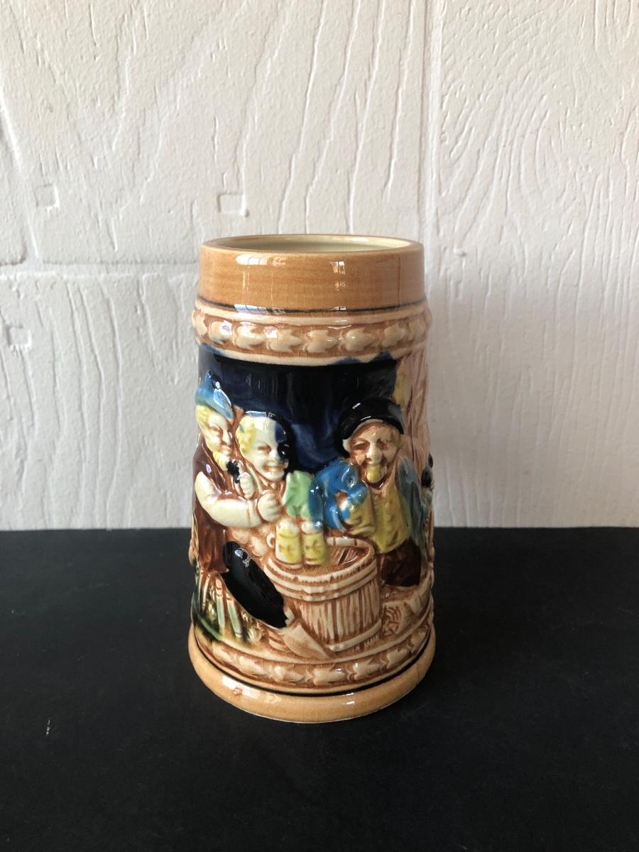 LOT 50L: Ceramic Stein w/ Canon Lid & Majolica Style Pitcher and Steins