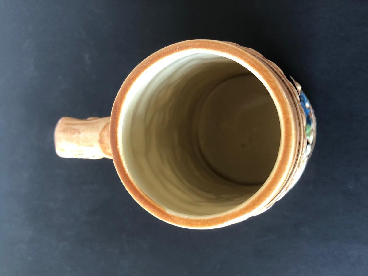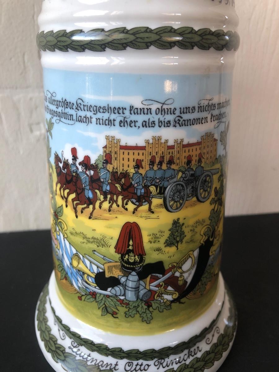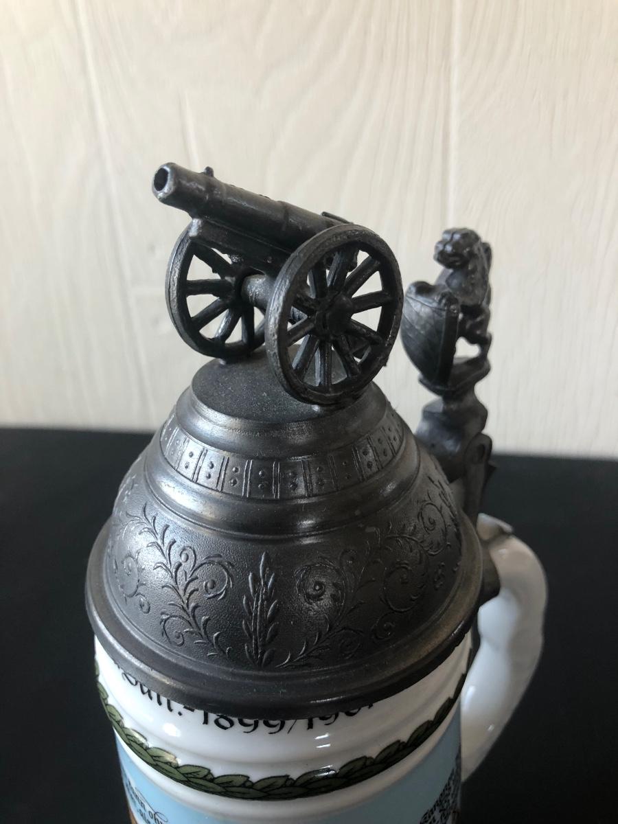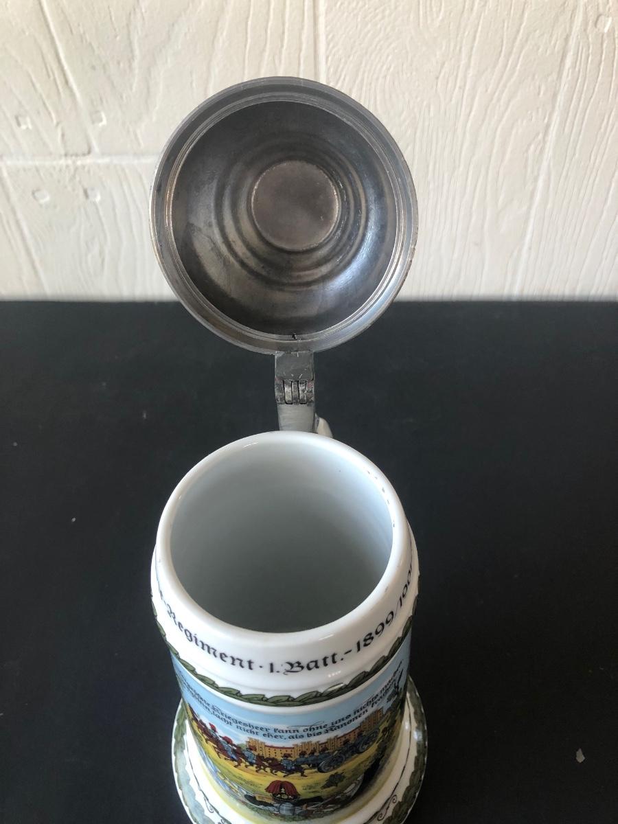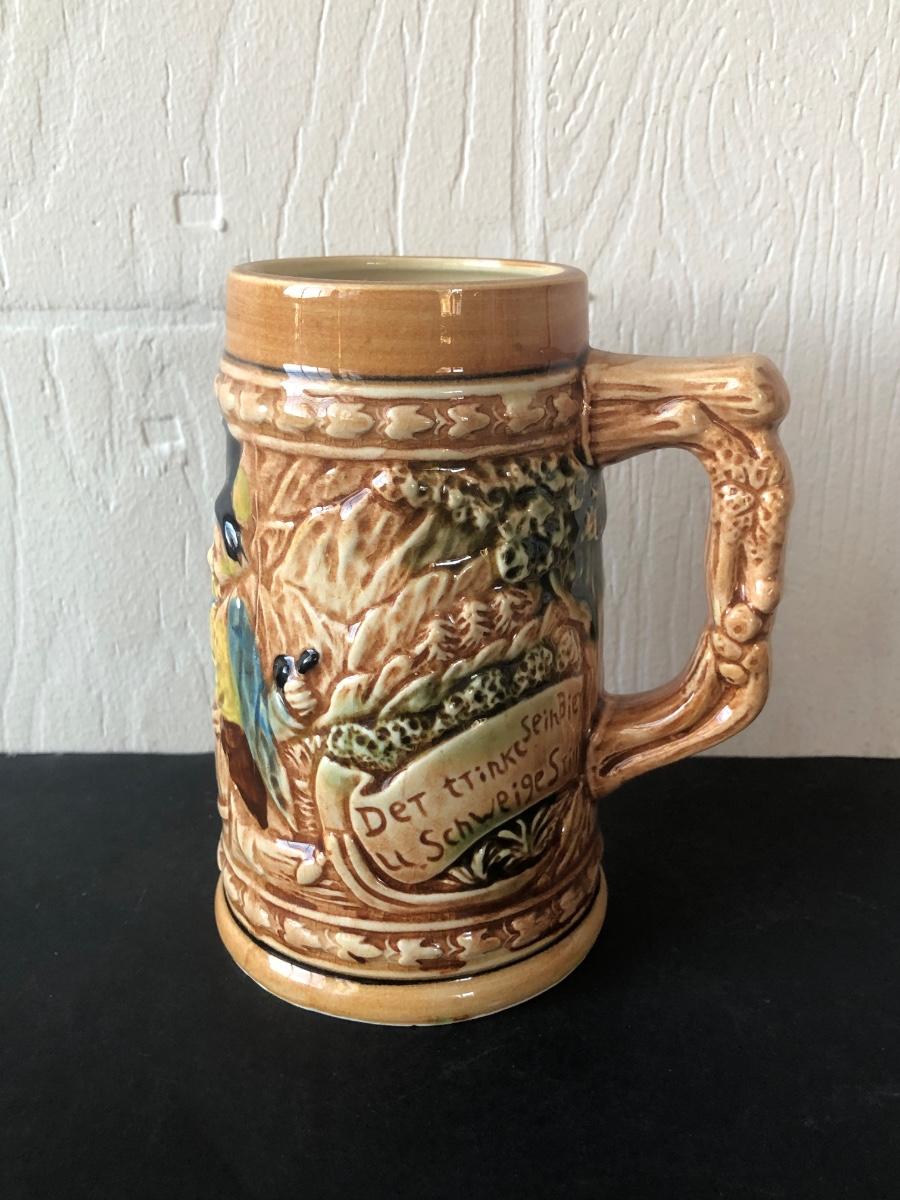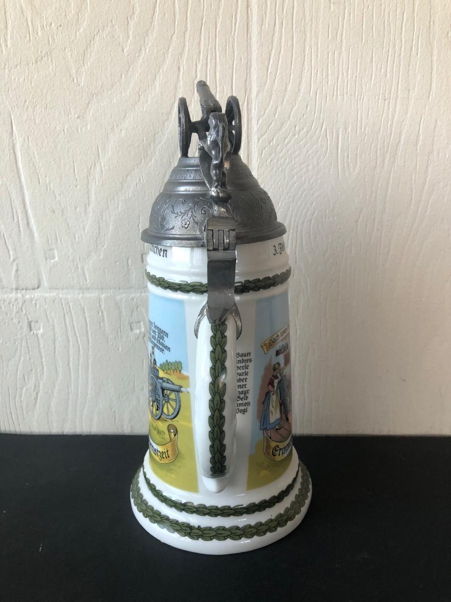 LOT 50L: Ceramic Stein w/ Canon Lid & Majolica Style Pitcher and Steins